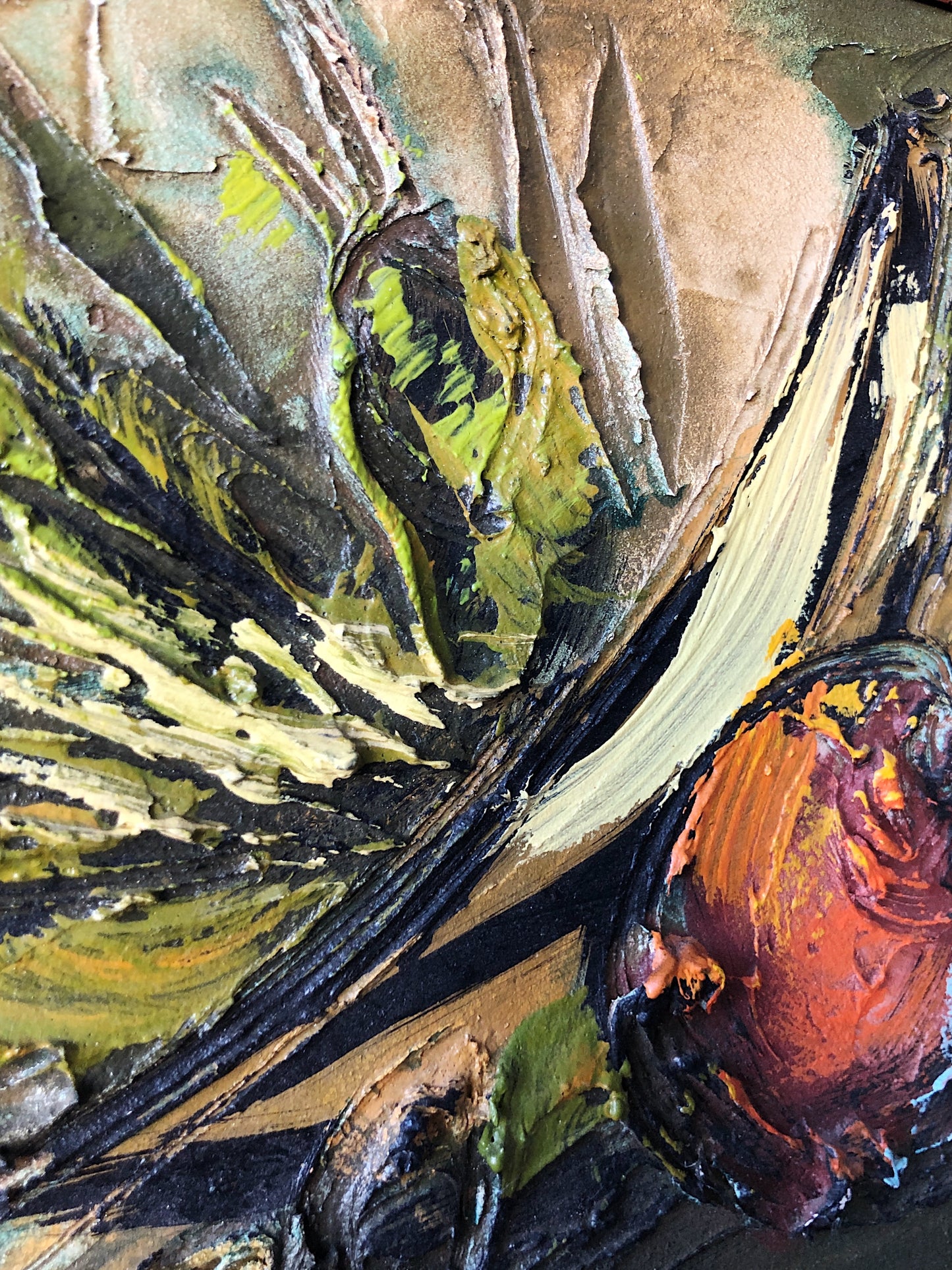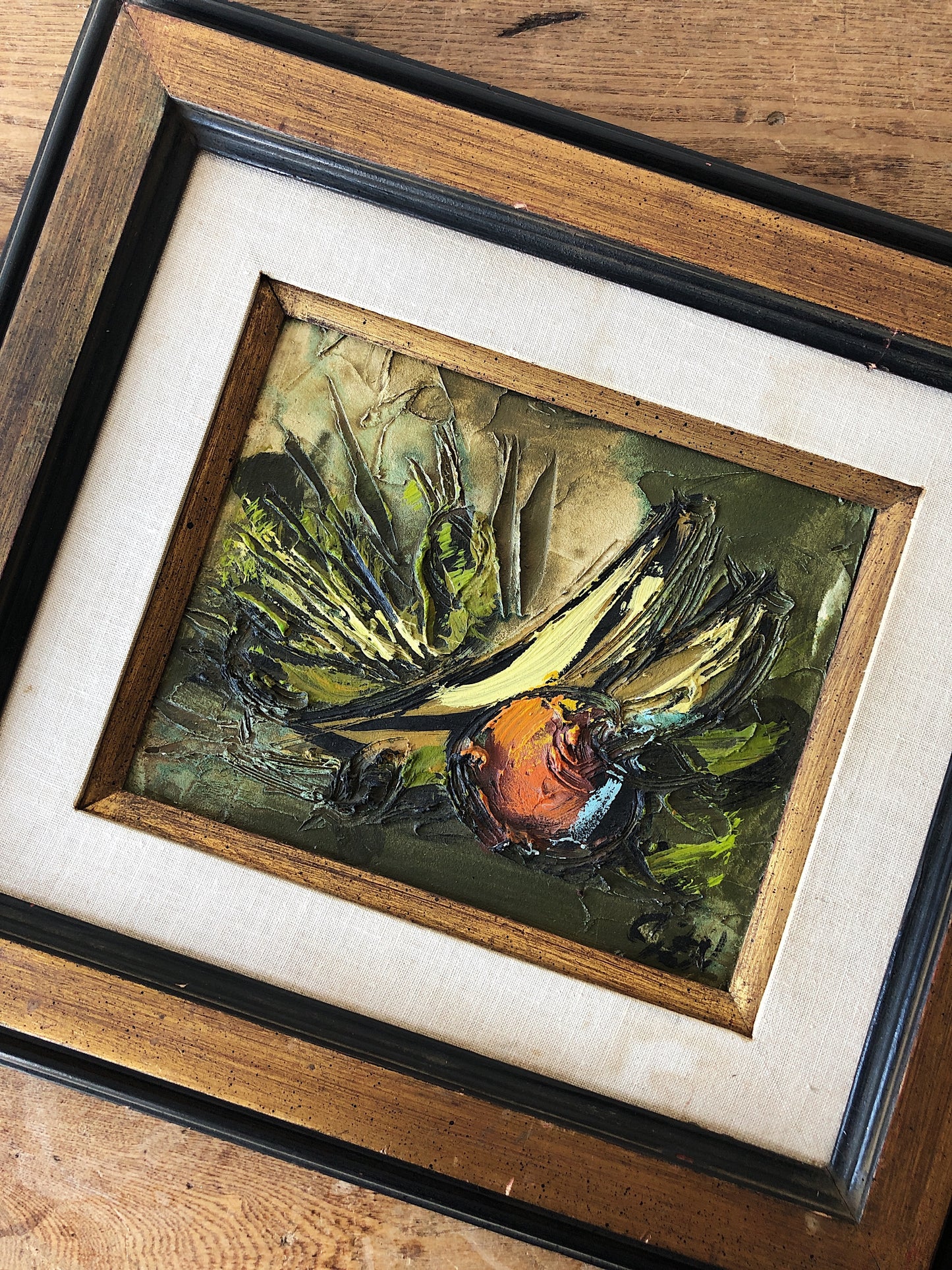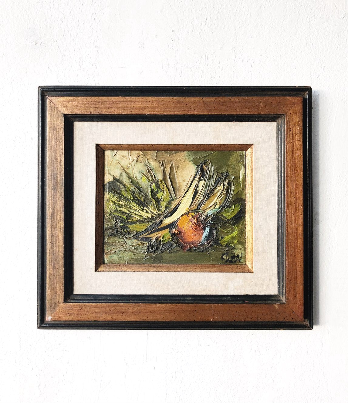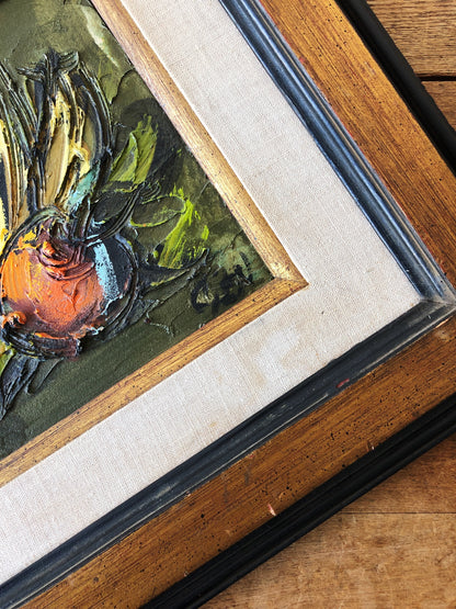 Signed mid century oil painting with wonderful colors. Palette knife application of the oils make this especially textural. Some minor wear to the linen fillet. Framed in vintage wood