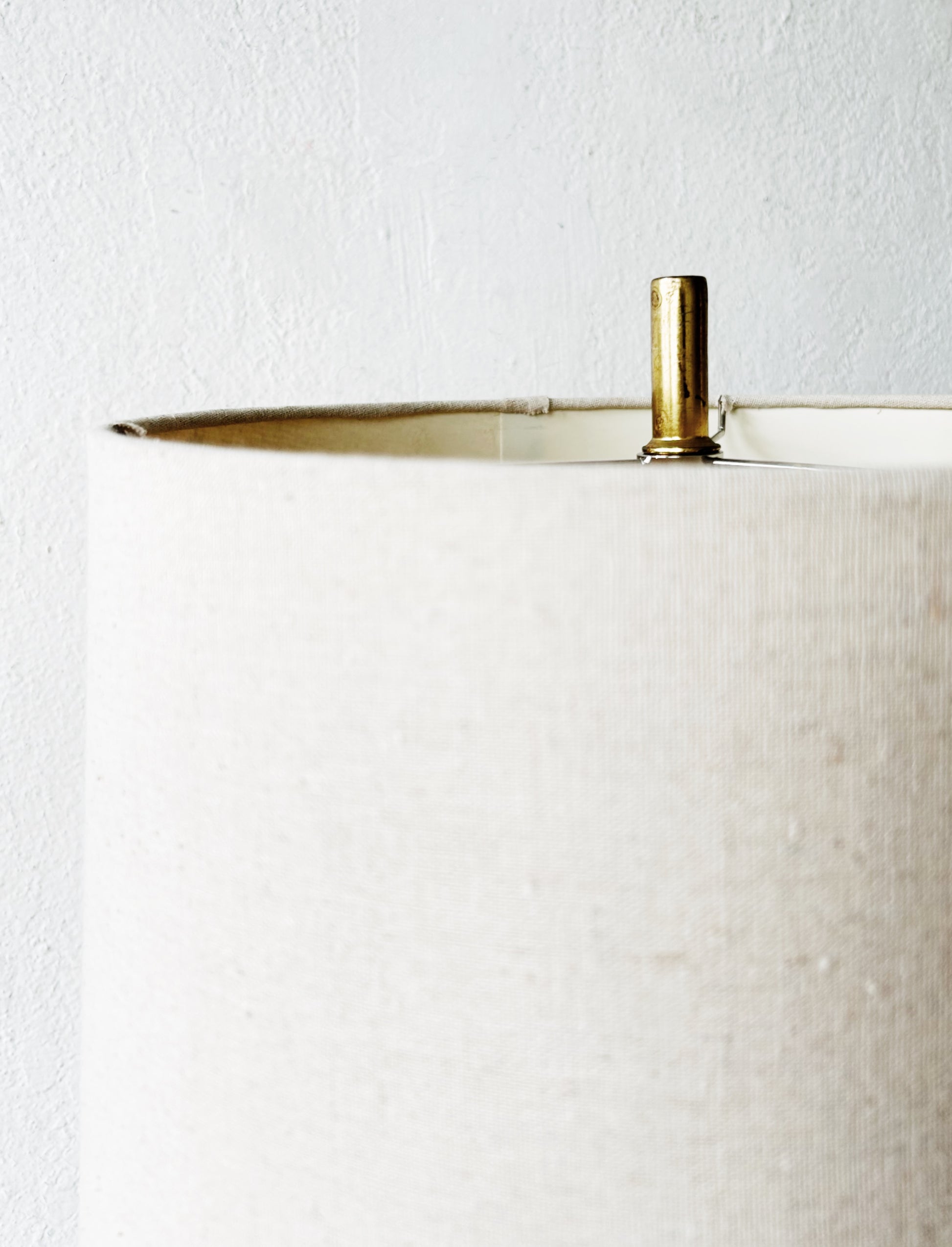 A chunky squat vintage stoneware lamp. Earthy and pretty specked clay with an organic handformed sagrifitto shape on two sides. Topped with a neutral linen shade. Original wiring looks great.