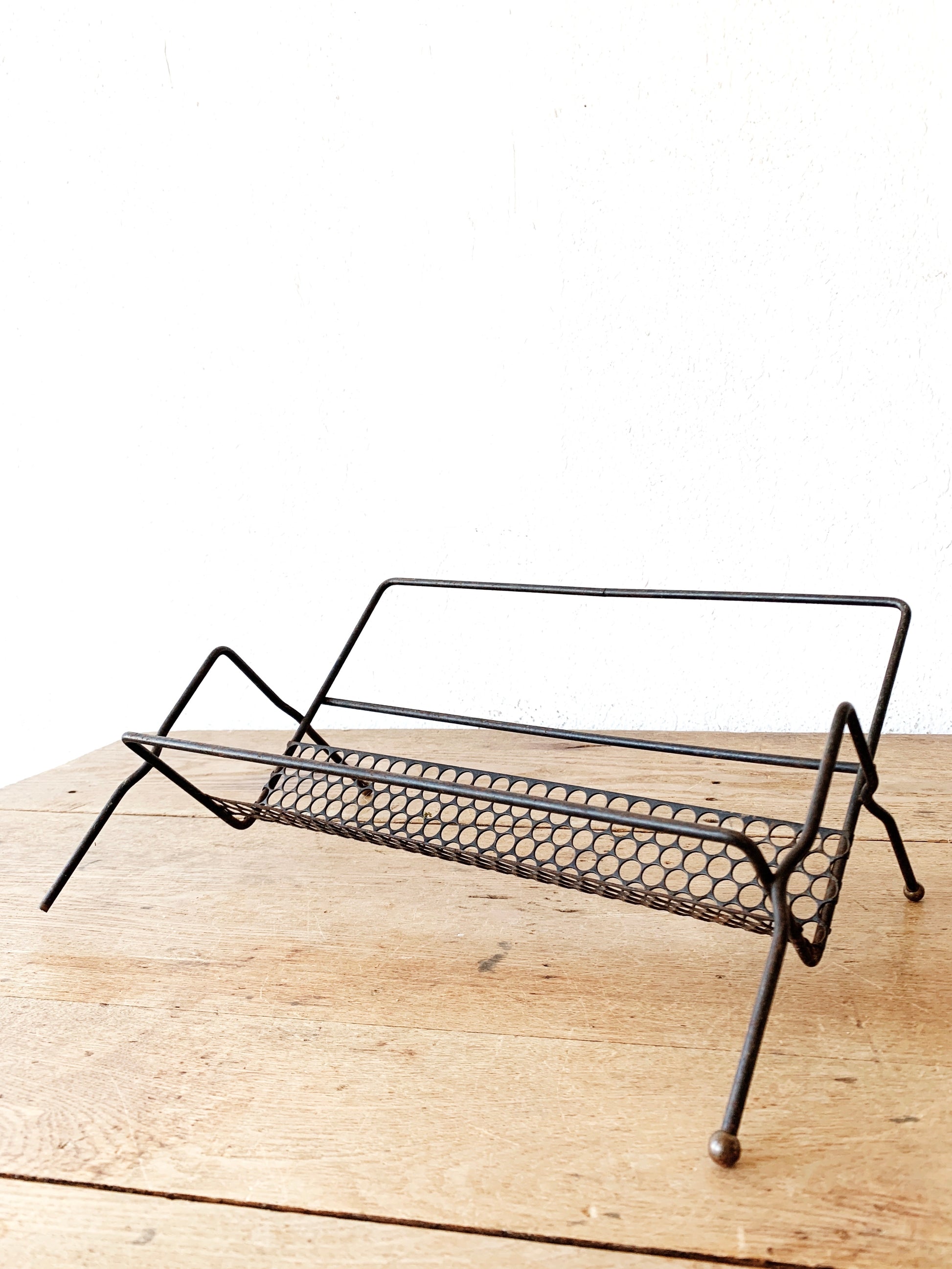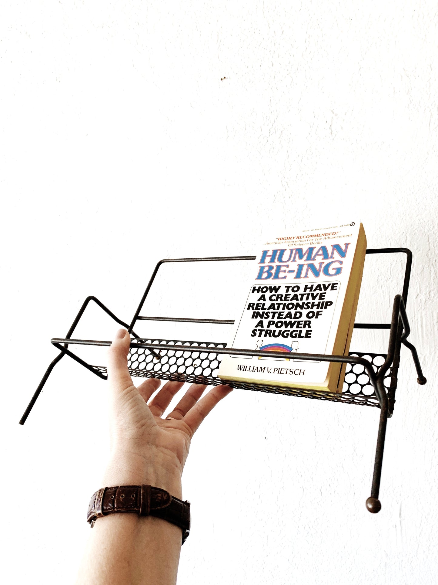 Classic mid century metal table top book rack with ball feet. It’s missing one ball but still does it’s job evenly