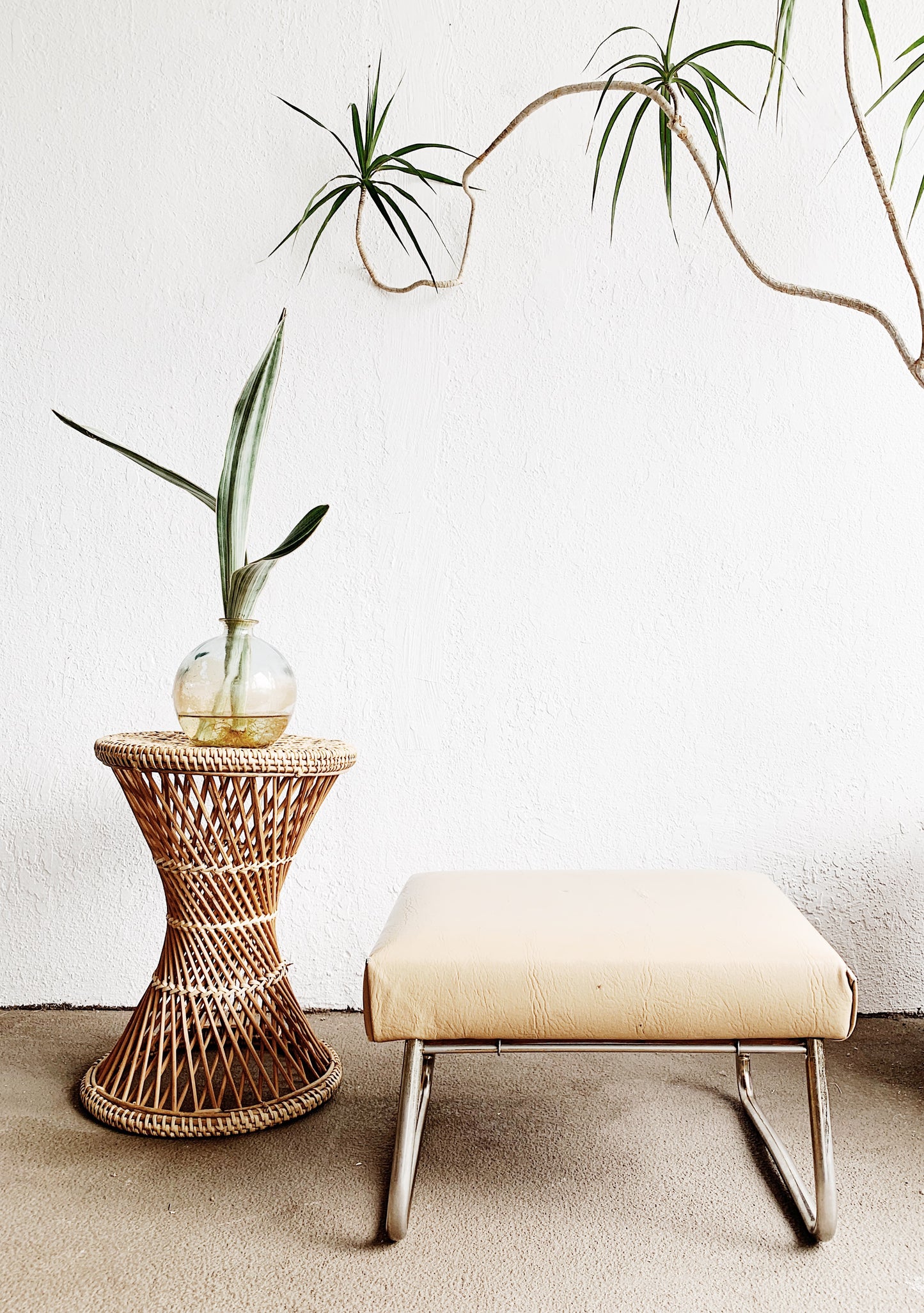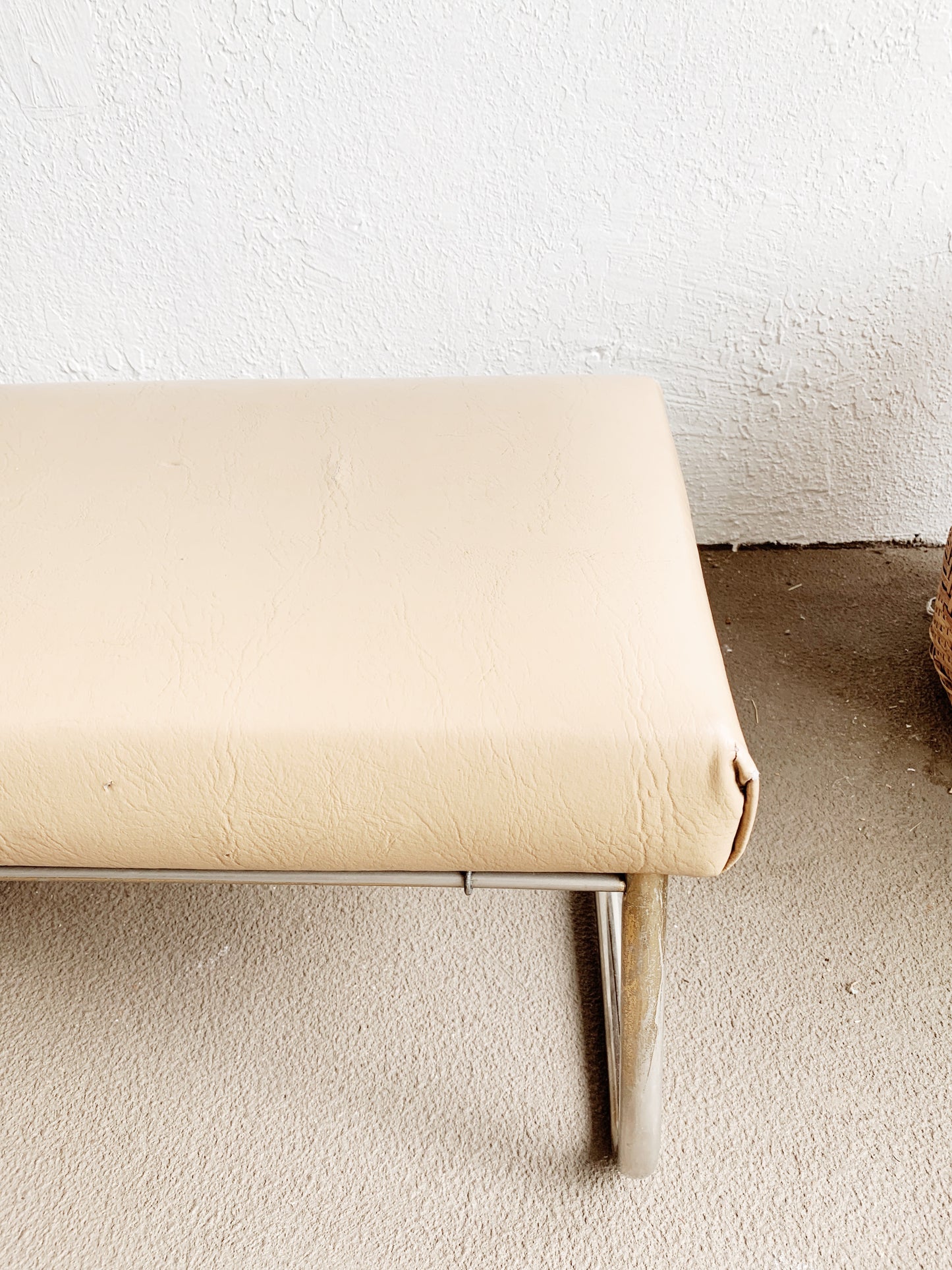 Fantastic mid century taupe vinyl upholstered stool on metal frame. Some wear to the vinyl but not too bad. See photos. Overall a great stool !