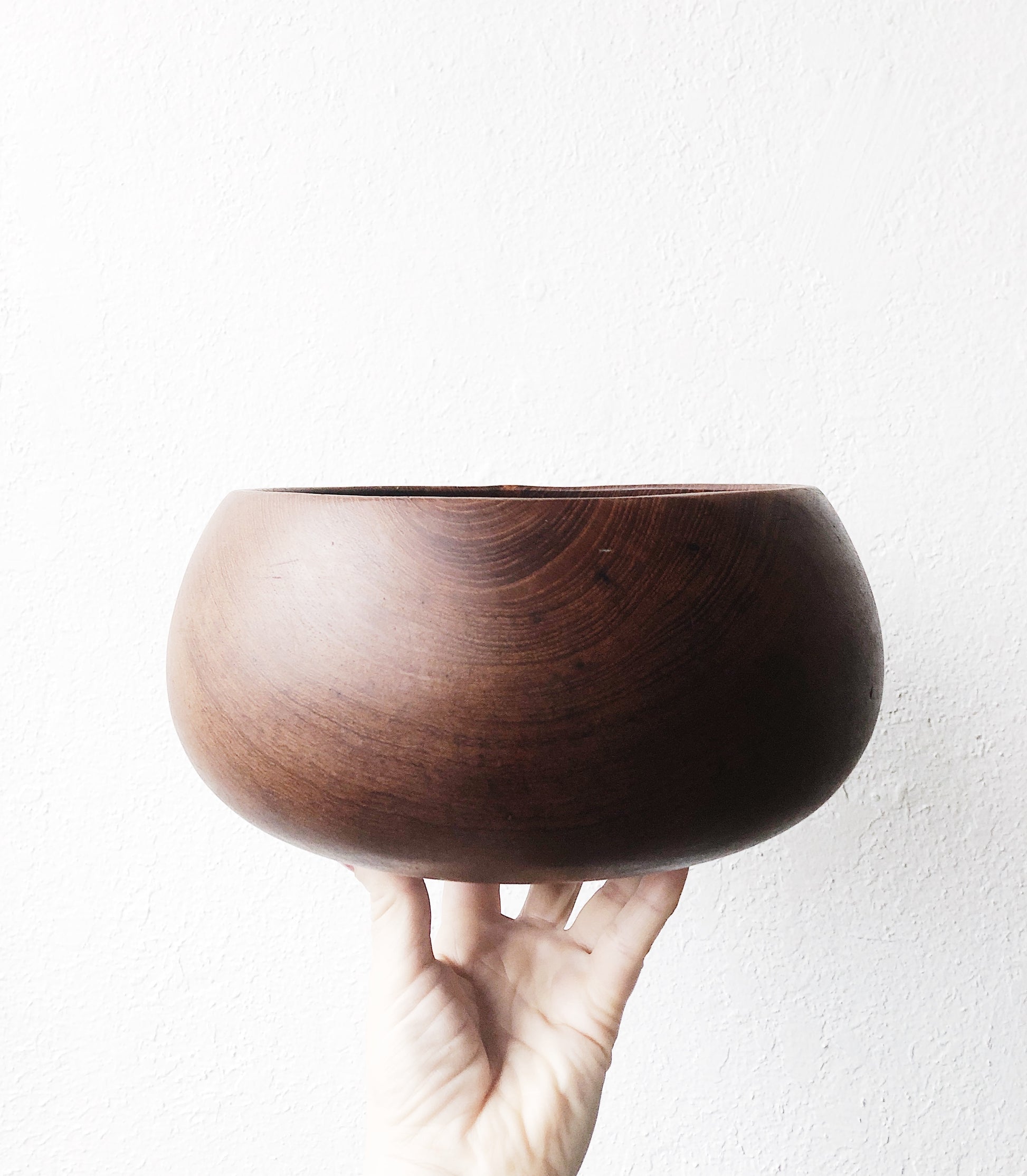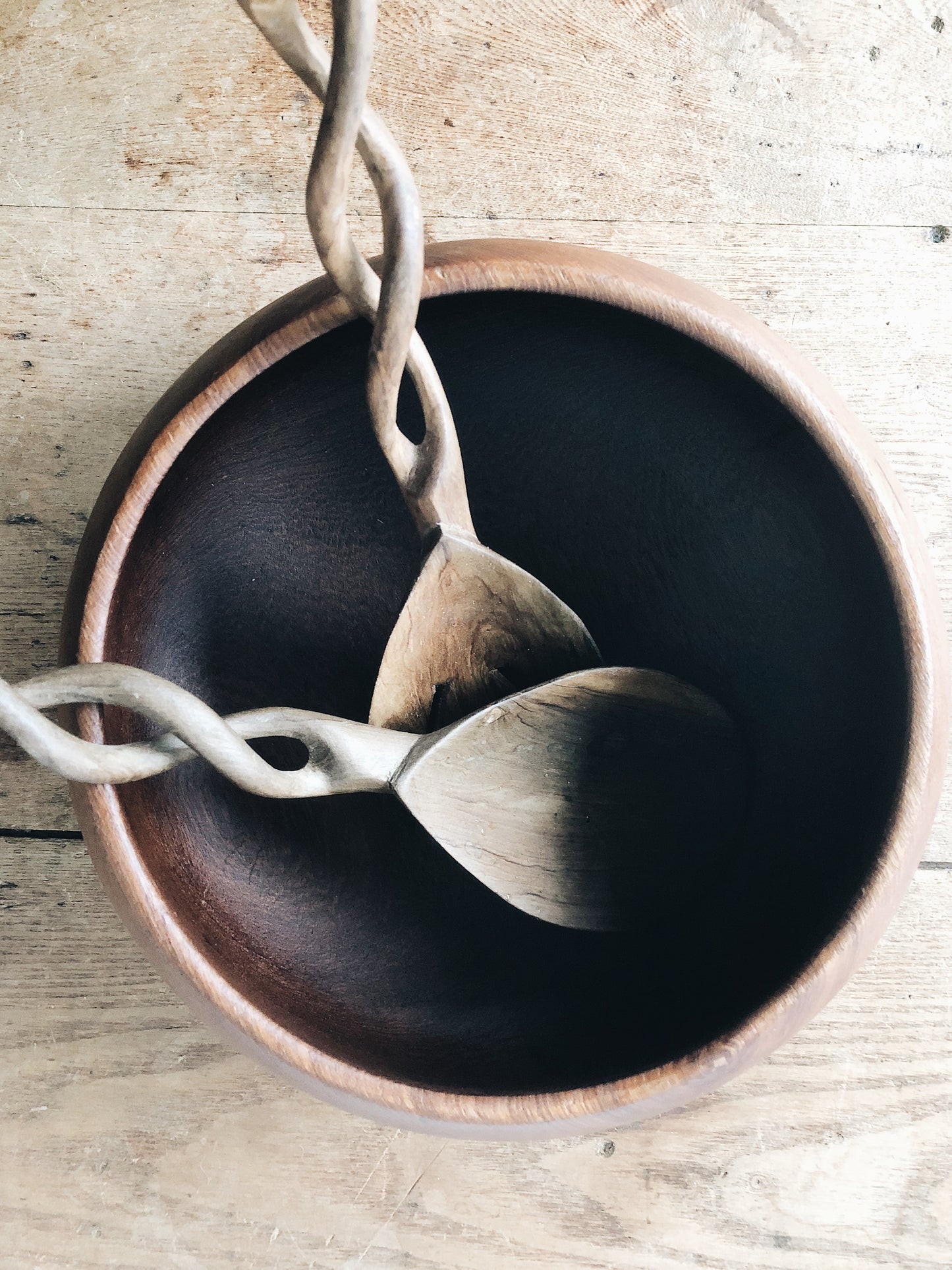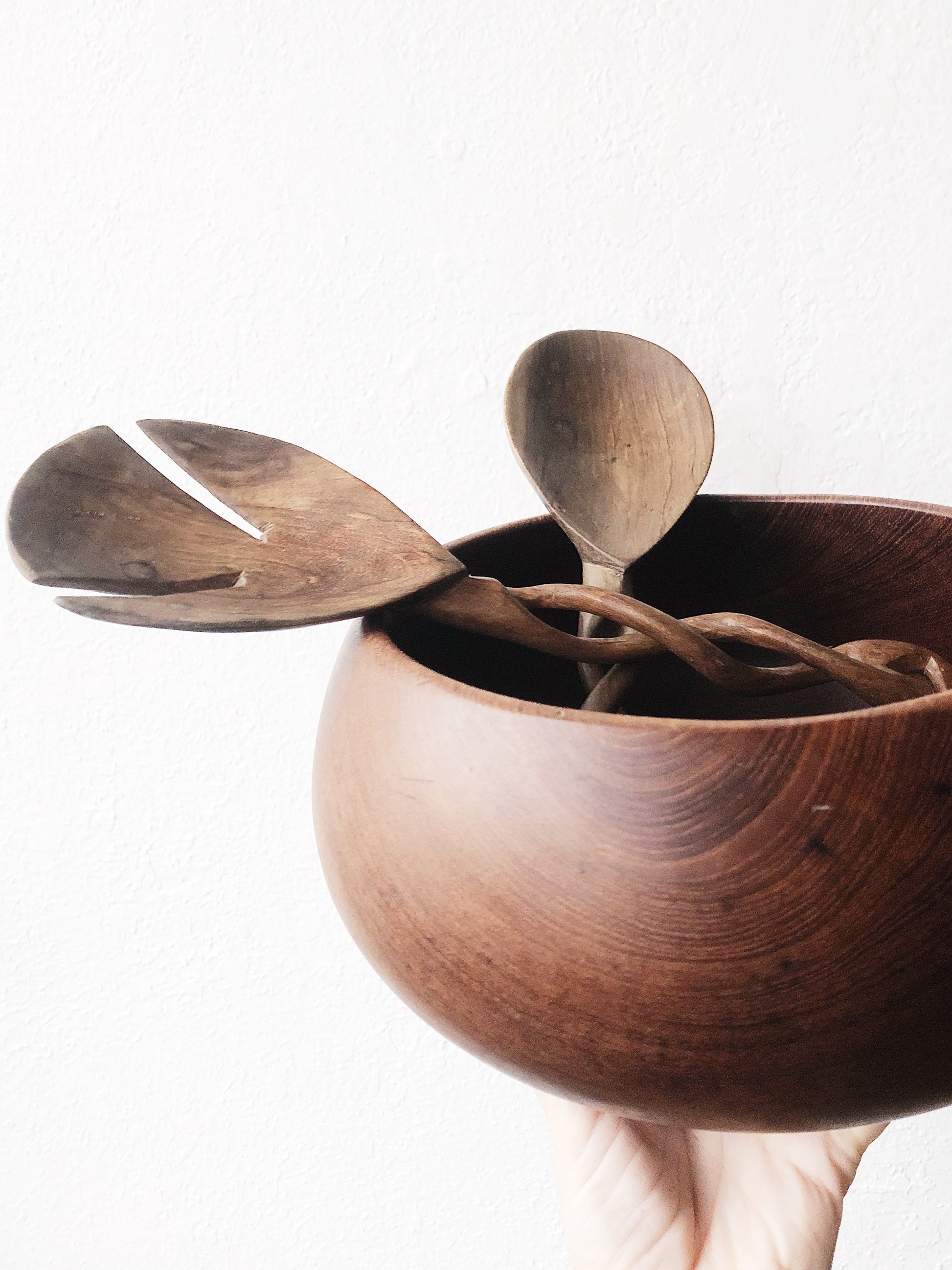 A bun style mid century teak bowl with a pair of gorgeous hand carved servers. Lovely grain to all the pieces. Beautiful set!