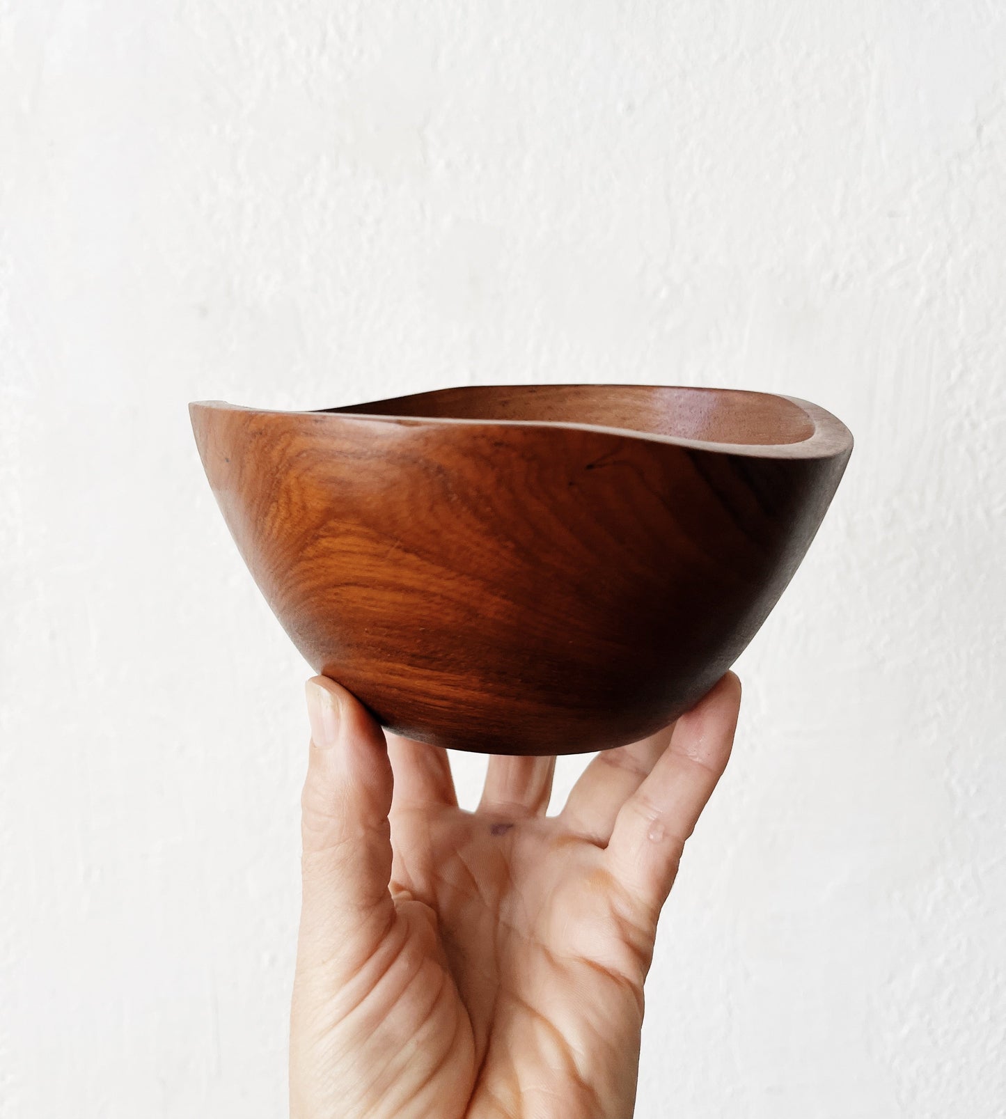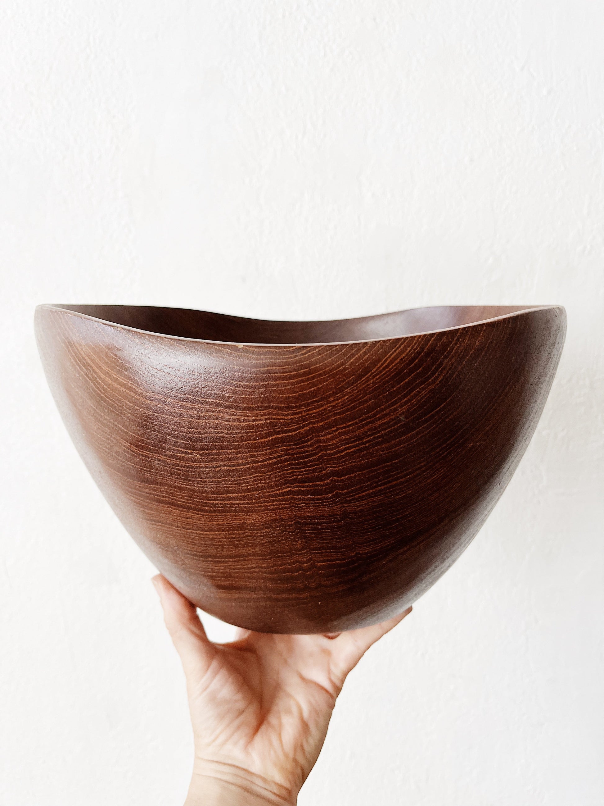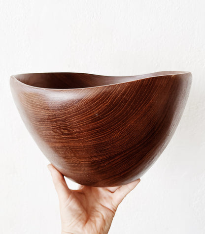 Extra large teak bowl with organically shaped edge. Comes with four bowls that mimic the style of the larger and teak server. The grain is lovely and this a weighty substantial set