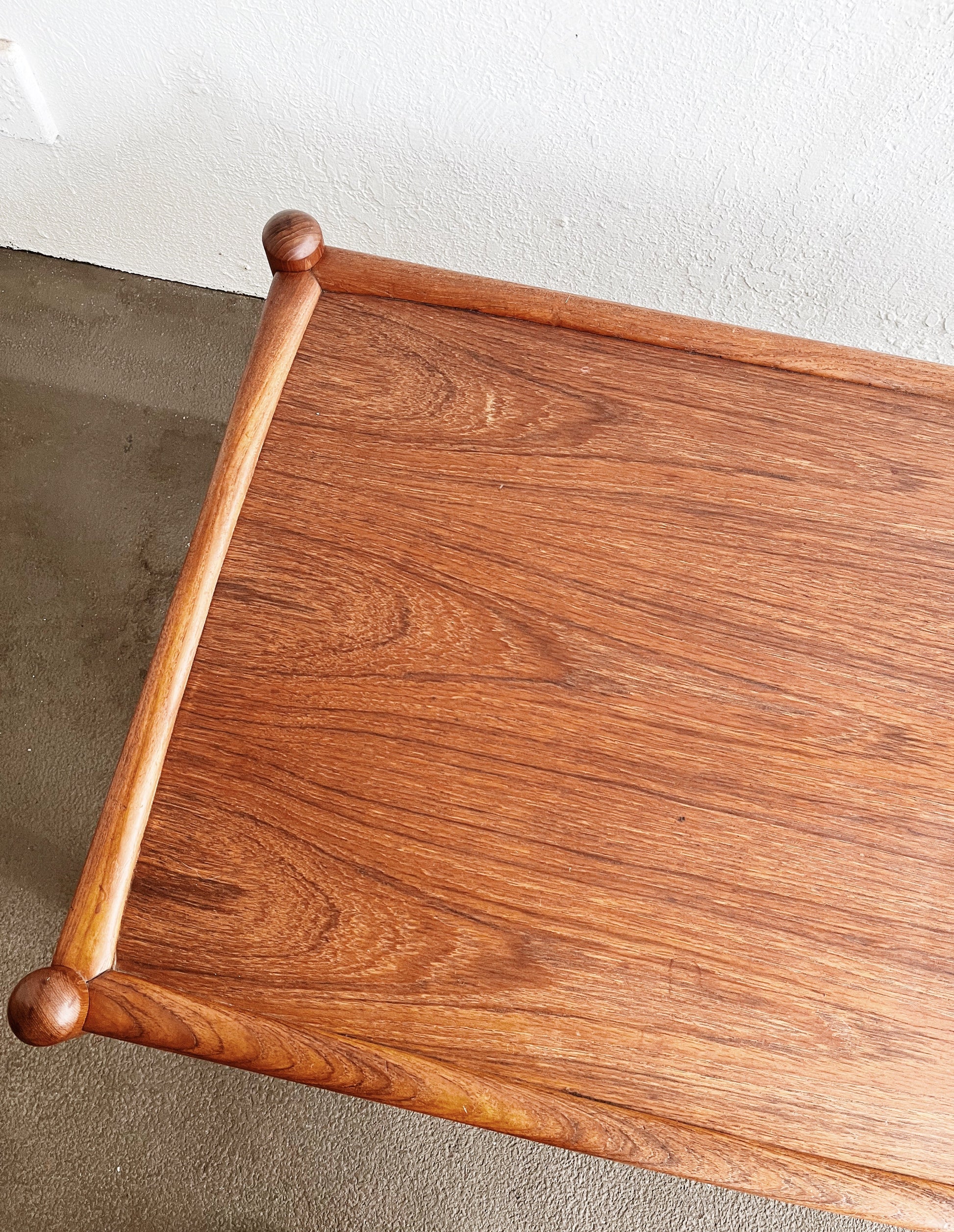 Vintage teak coffee table in the Danish Modern aesthetic. Produced by American manufacturer, Dixie, in a style directly borrowed from Scandinavia. Nice warm minimalist design with the solid teak legs extending slight beyond the table top and a slight bow to the side edges. In lovely condition