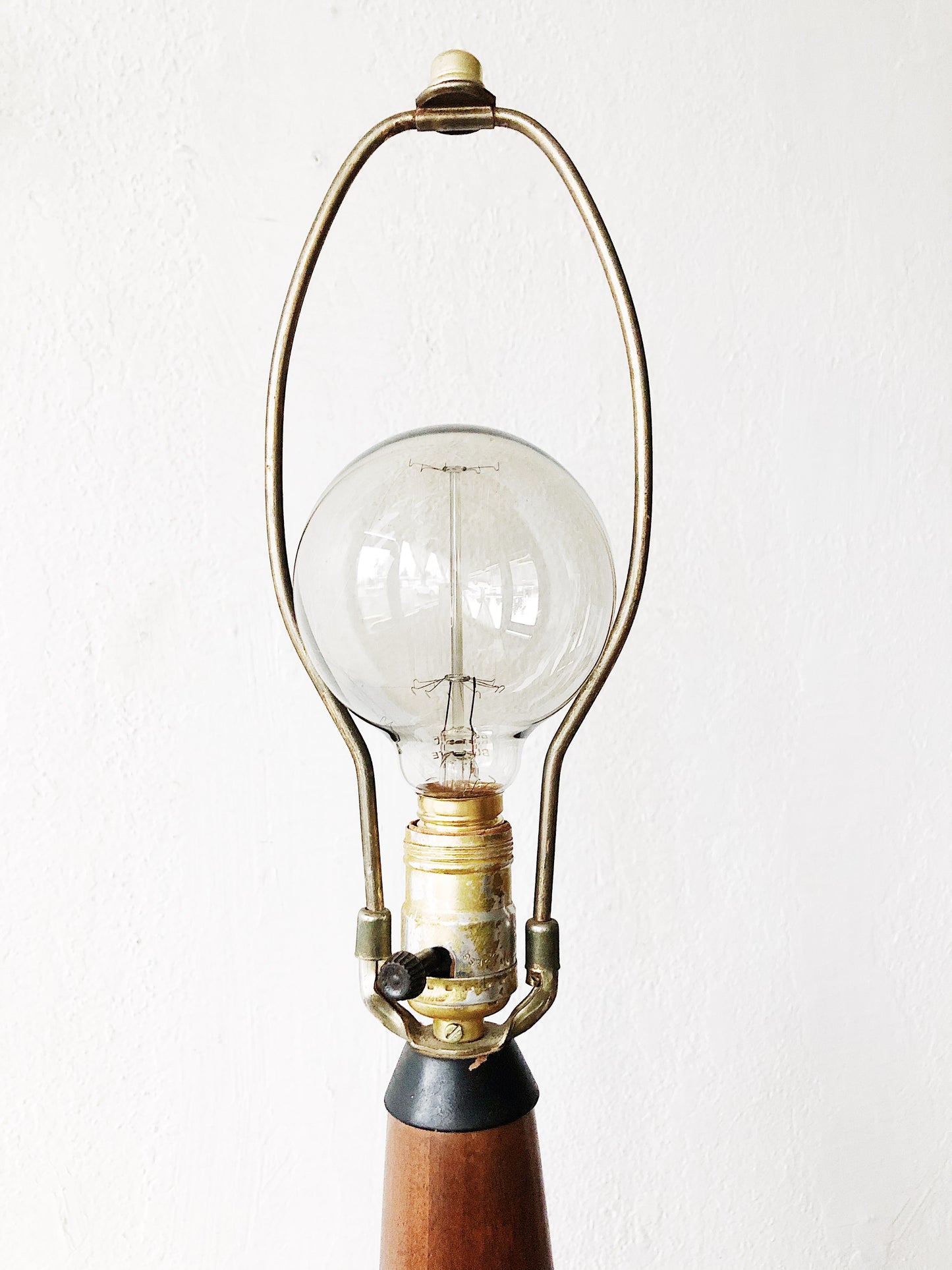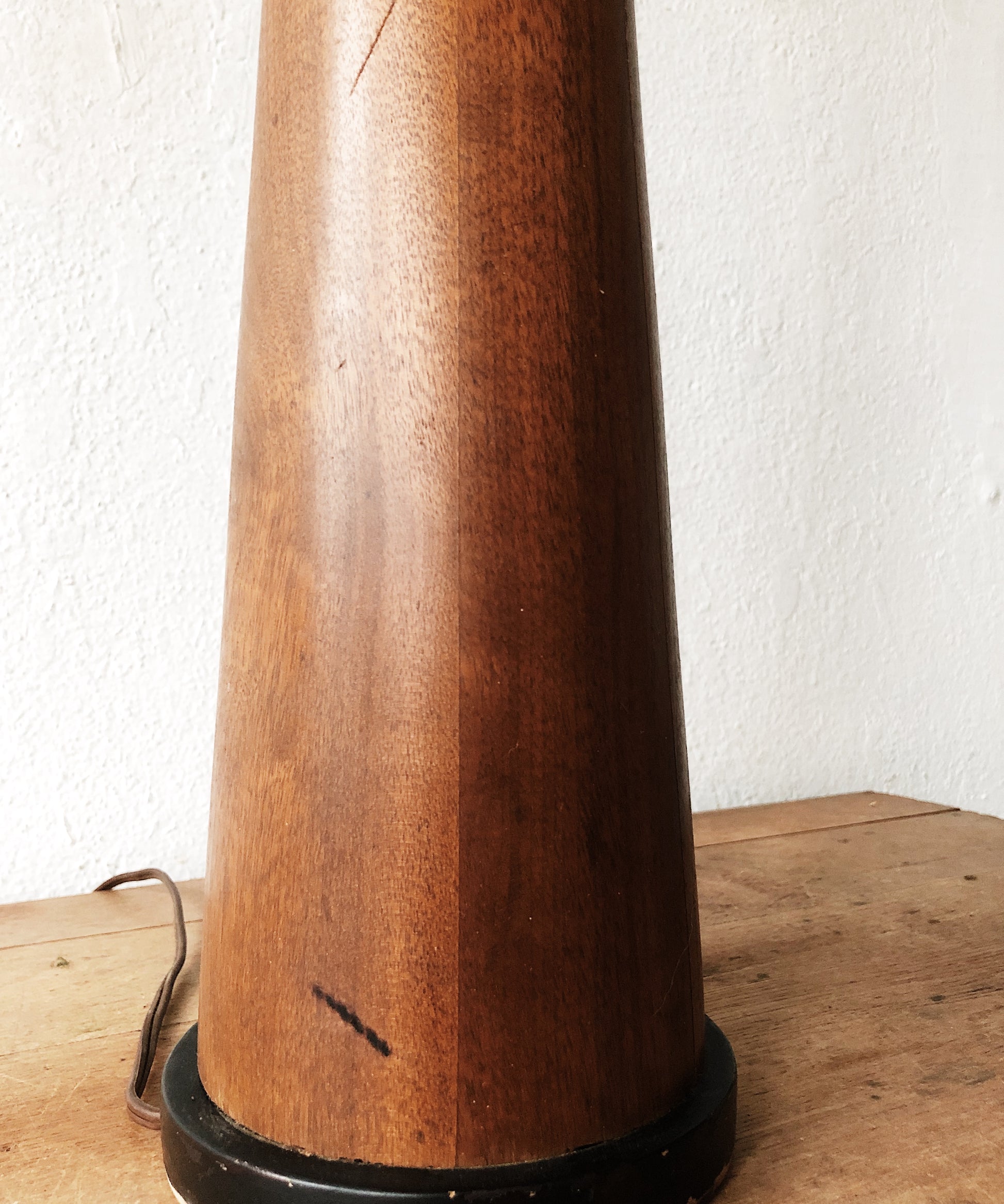Super tall and sexy teak lamp. Black painted accents. Three way switch.