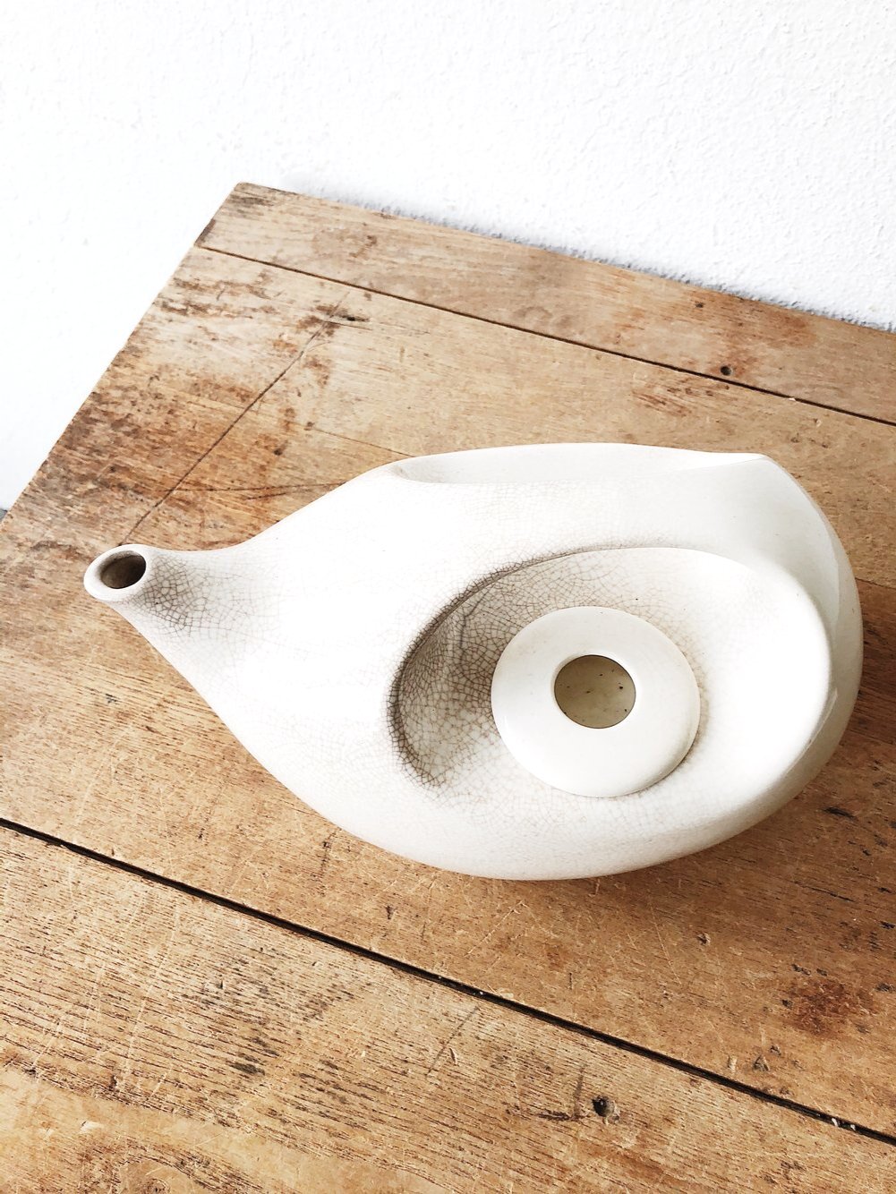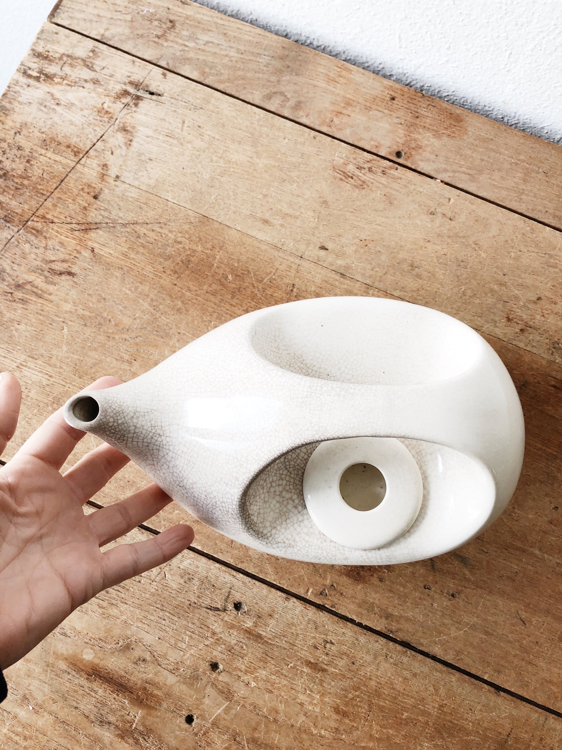 Fantastic shape on this mid century teapot. Modernist style with crackle off white glaze. Love the lid! Will easily serve multiple cups
