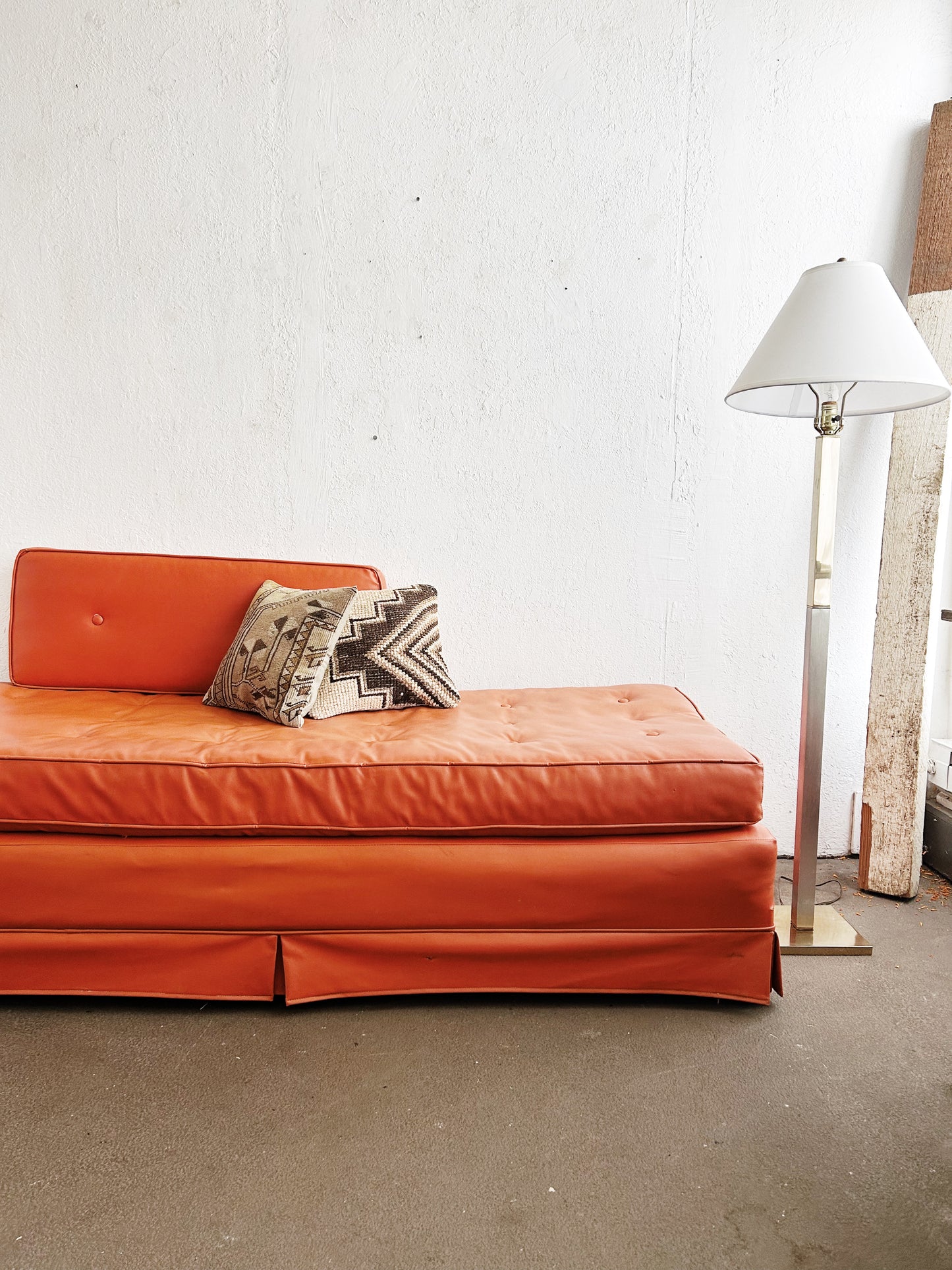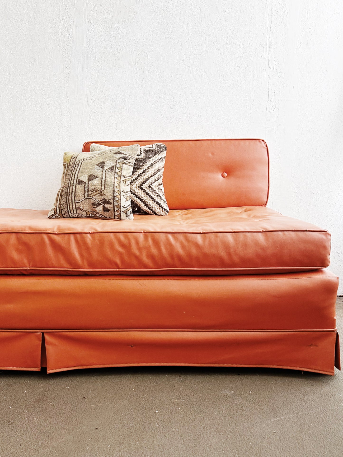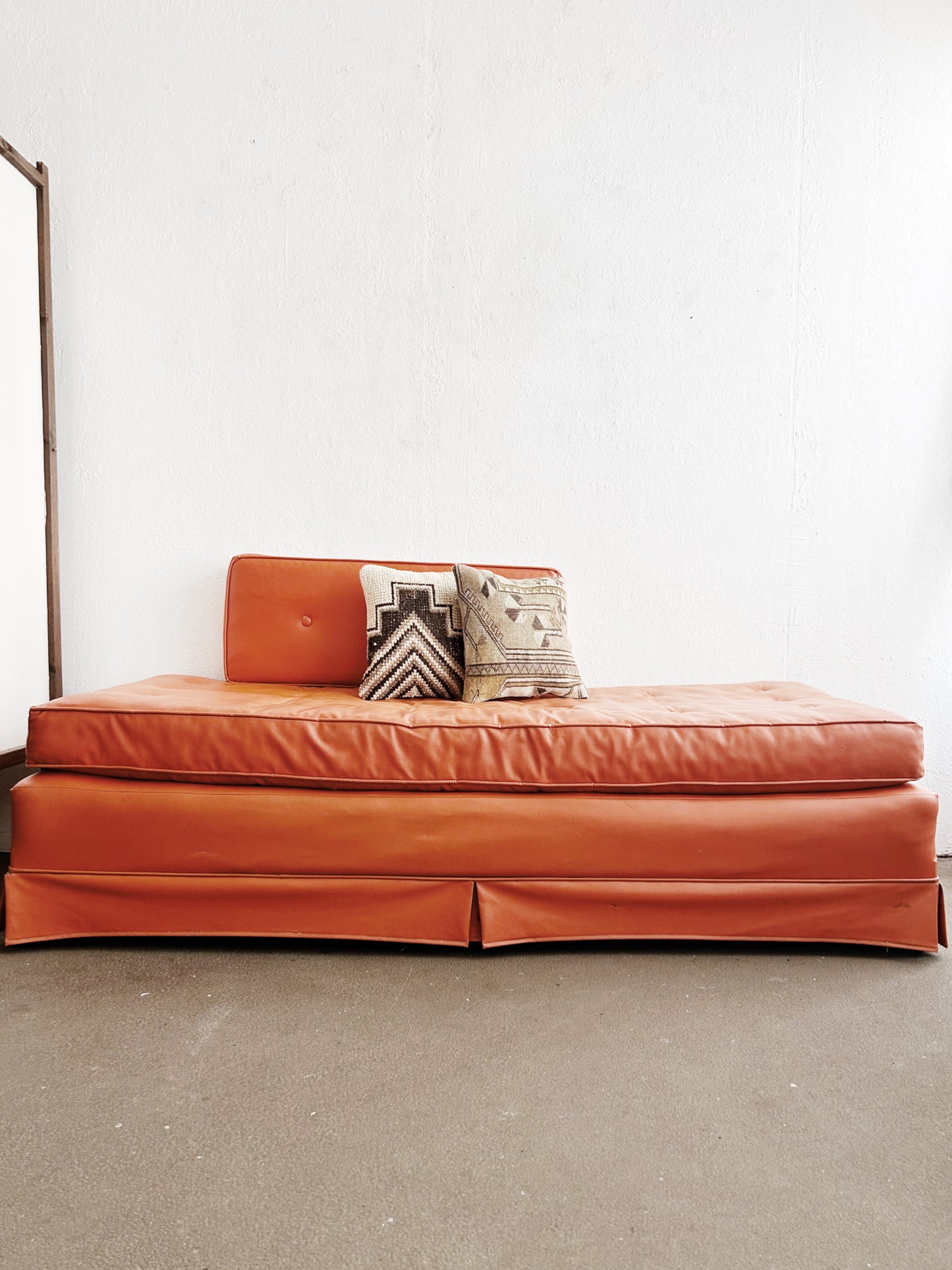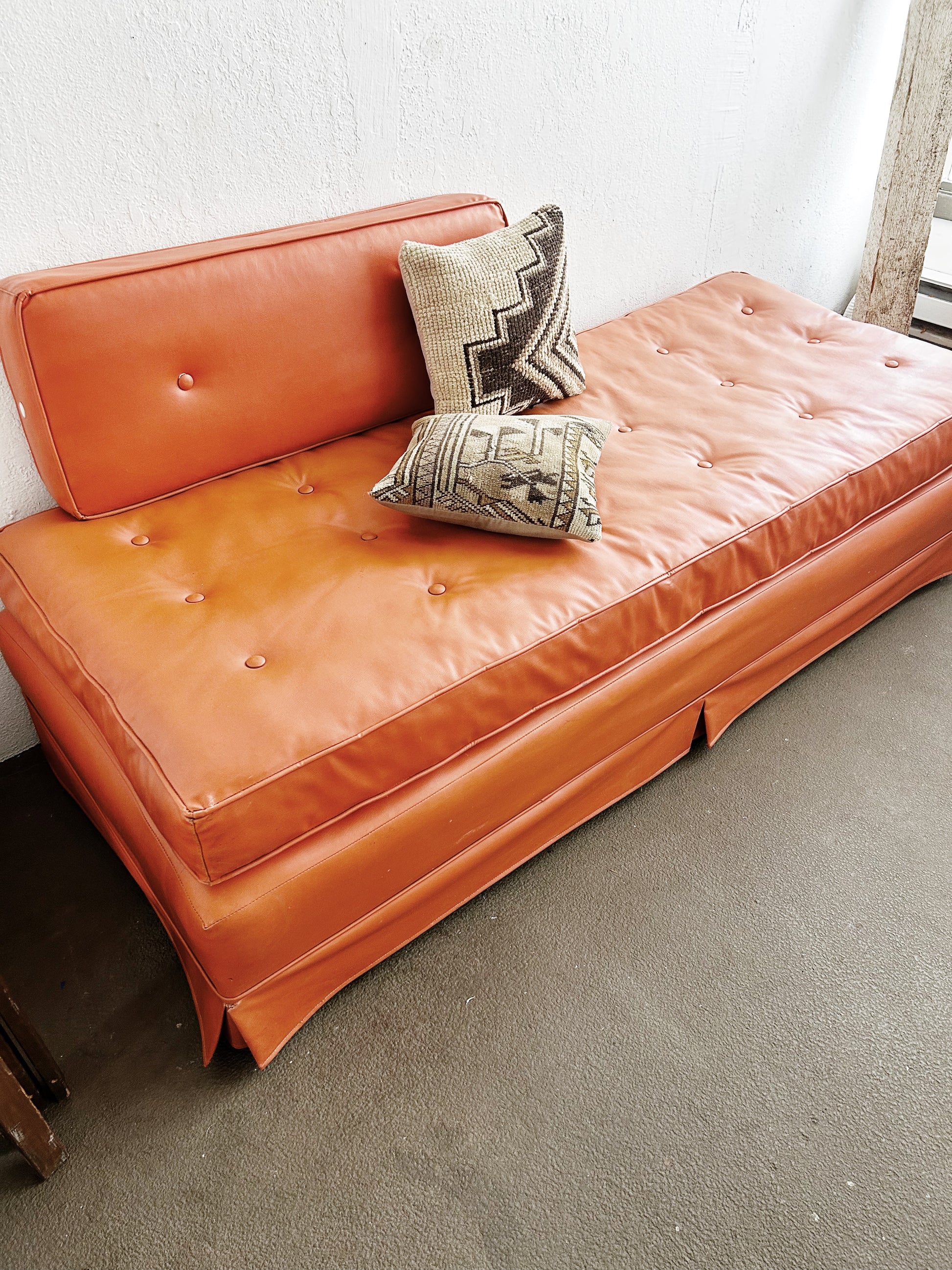 This is such a great find. If you need a pop of color, this’ll do it! Mid century vinyl daybed. It’s three pieces: the bottom spring foundation is clean and in nice condition. The top cushion is also clean and in great shape. It’s bouncy and comfy. The back cushion rests on a wall for back support or you can put it down on the bed.