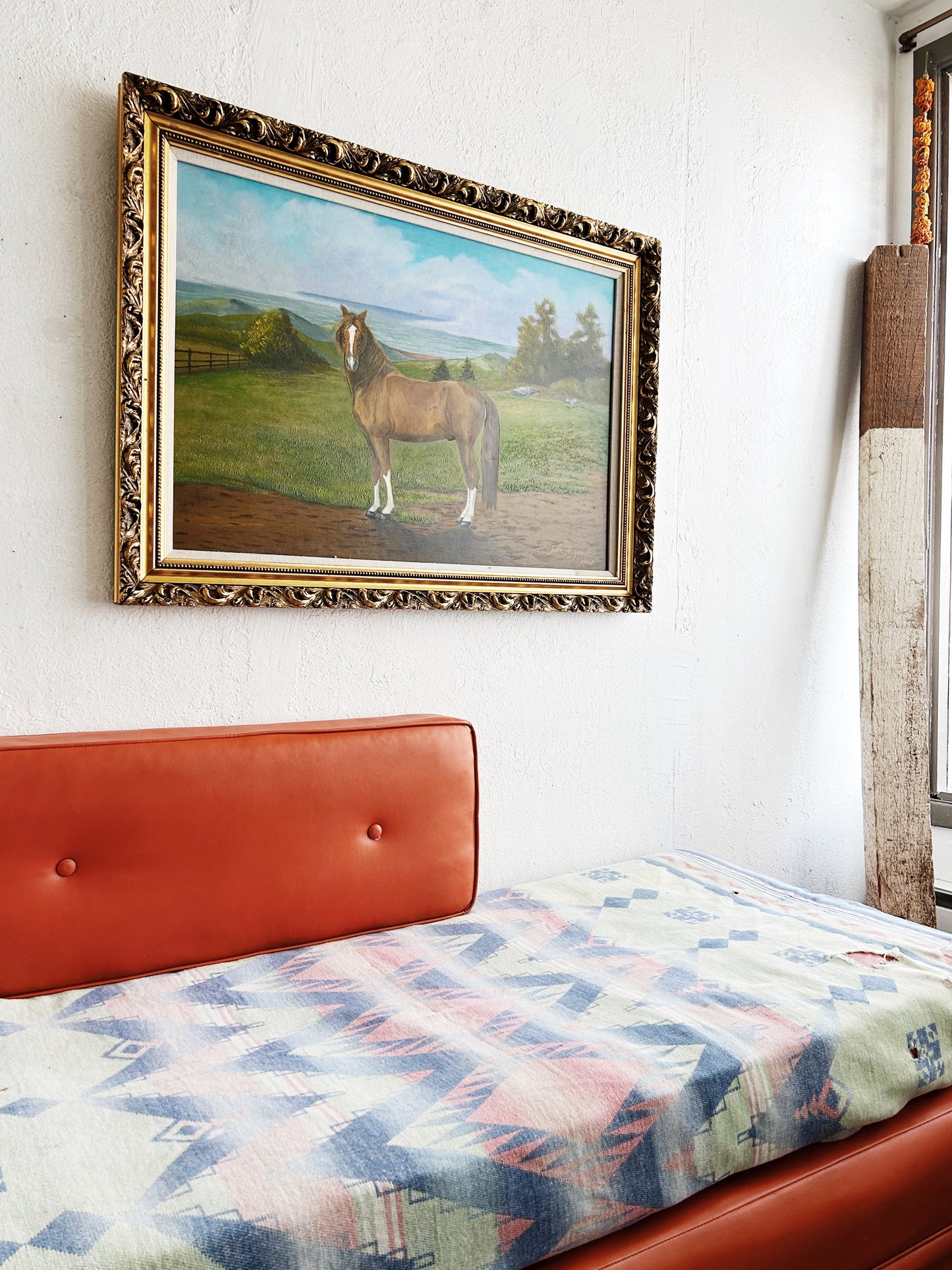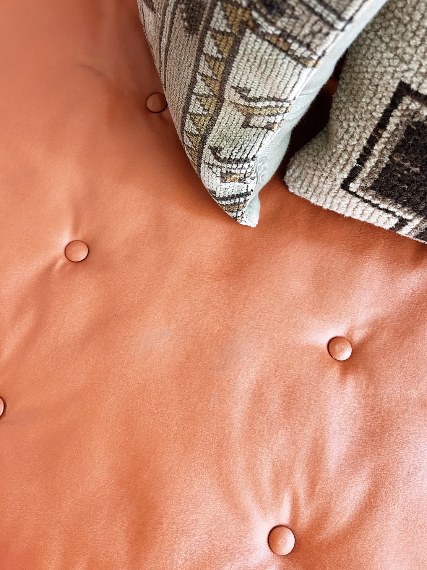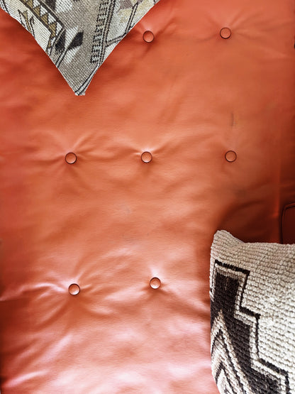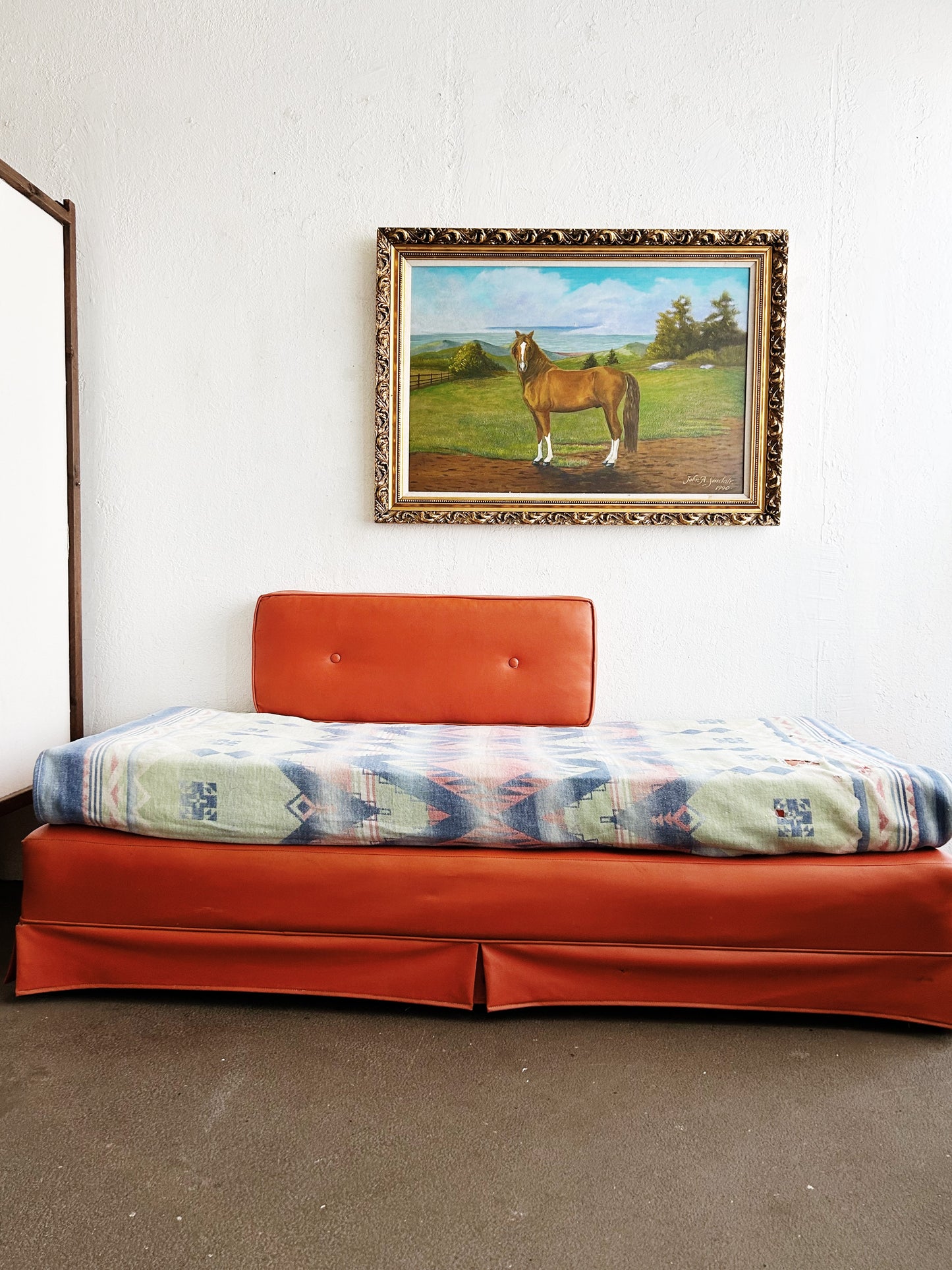 This is such a great find. If you need a pop of color, this’ll do it! Mid century vinyl daybed. It’s three pieces: the bottom spring foundation is clean and in nice condition. The top cushion is also clean and in great shape. It’s bouncy and comfy. The back cushion rests on a wall for back support or you can put it down on the bed.