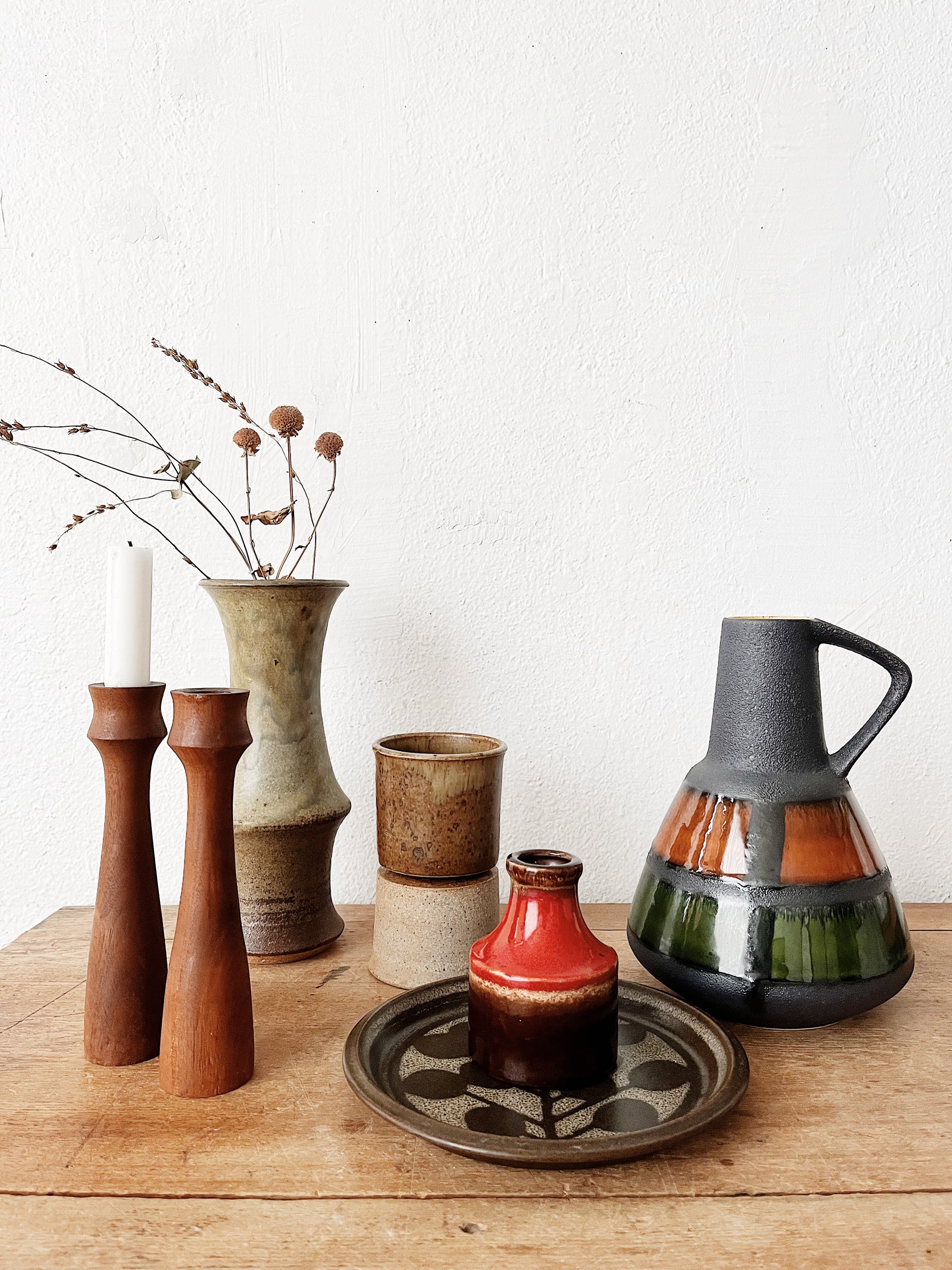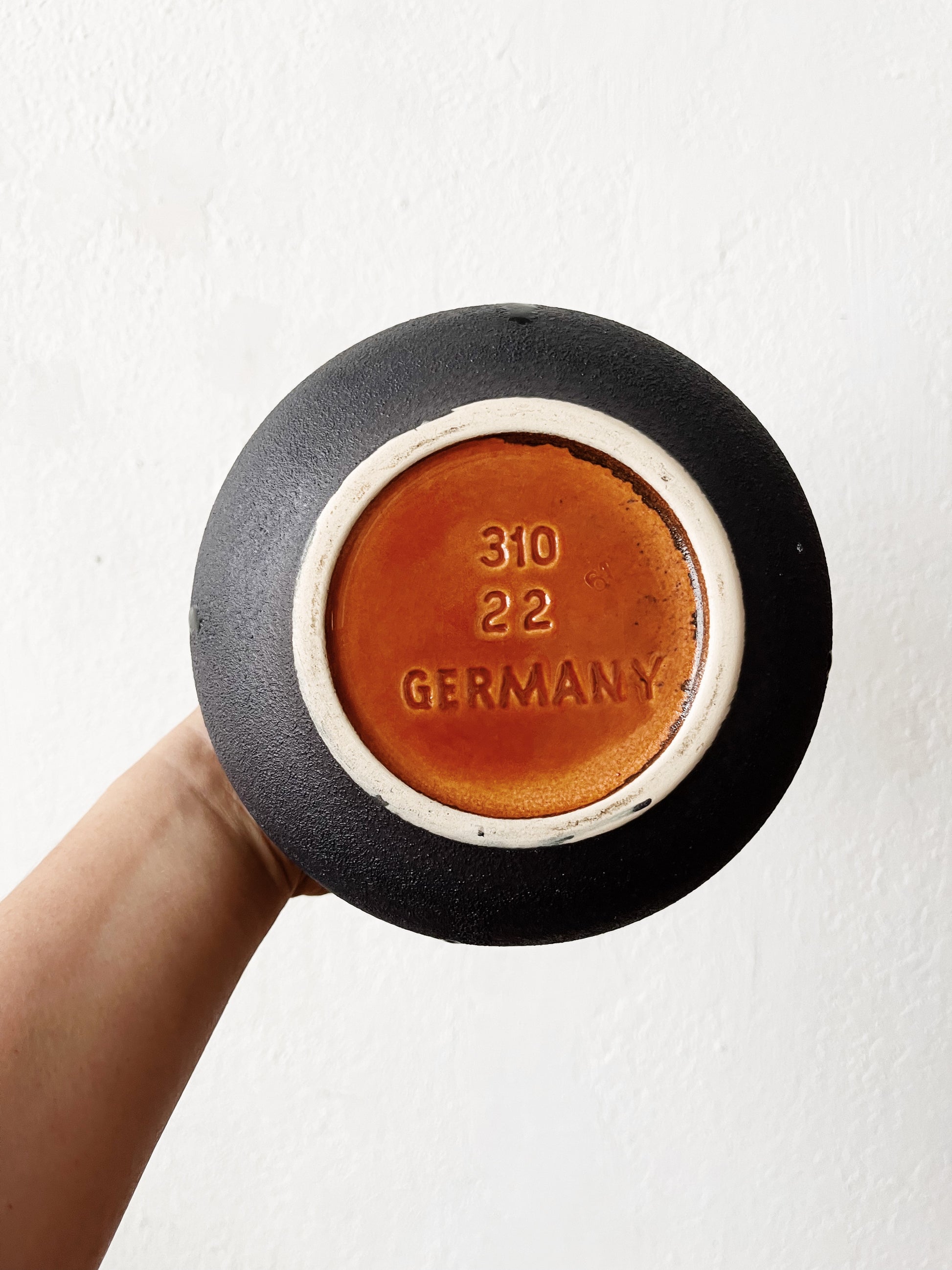 Gorgeous mid century west German pottery bowl. Textured matte black ground with gloss glazed shapes and golden yellow interior. Classic mcm lines and colors. Earthy and refined. Perfect size for a salad for 2-4 people or a generous sides server