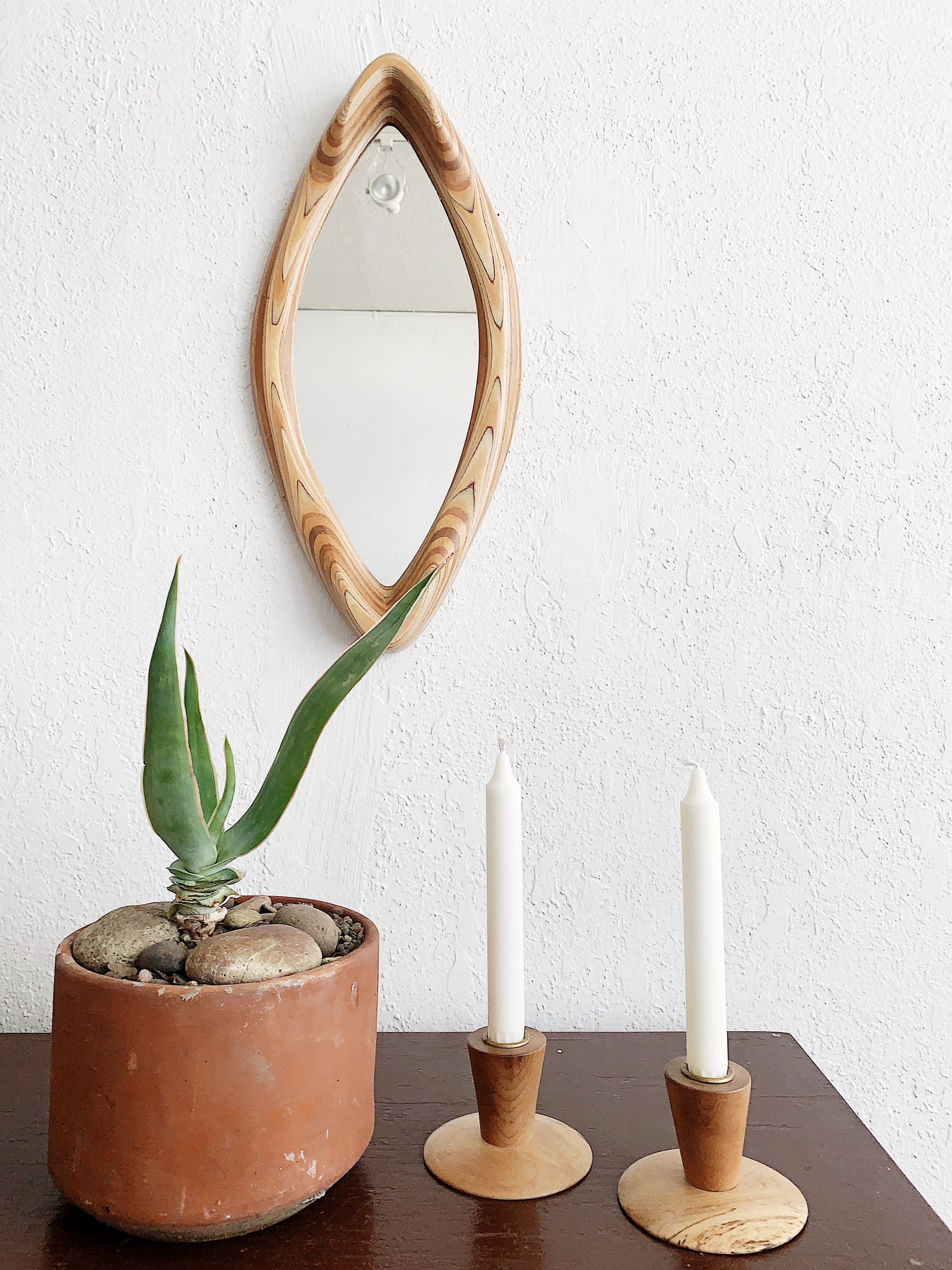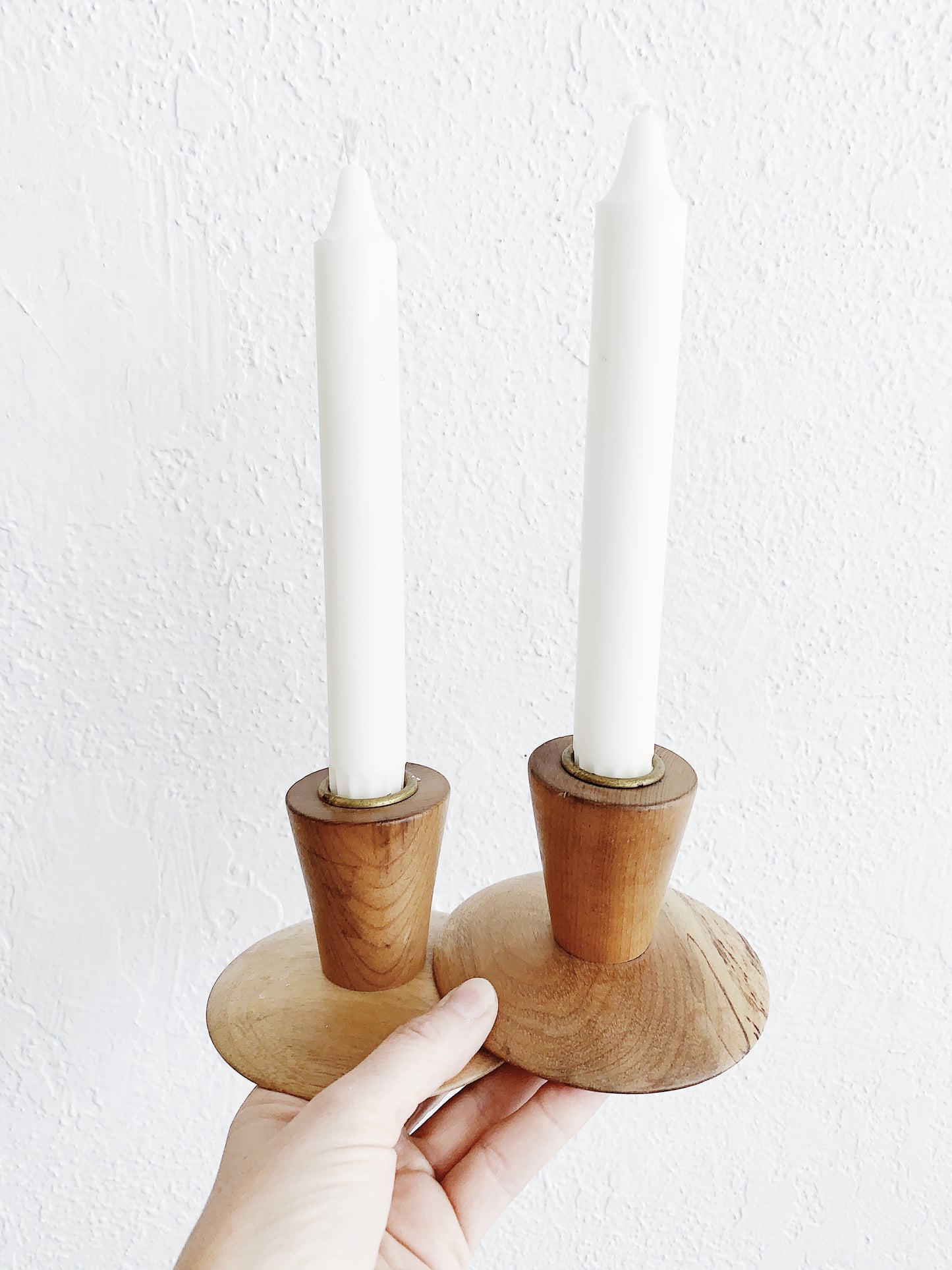Sweet pair of mid Century Myrtle wood candle holders with brass inserts. Made in Oregon. Holds standard tapers.