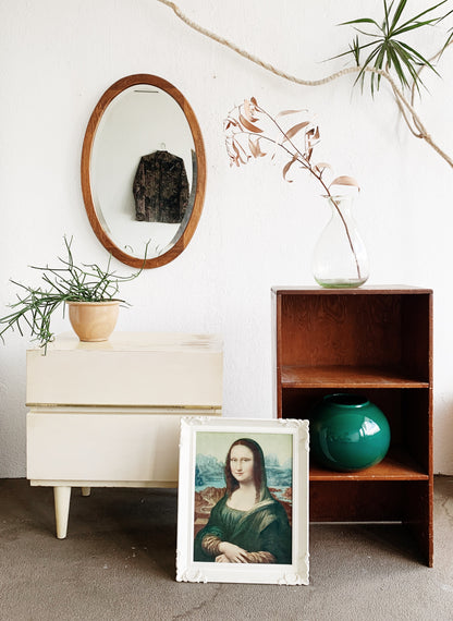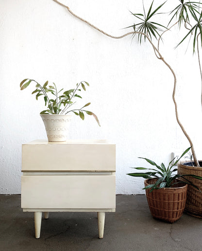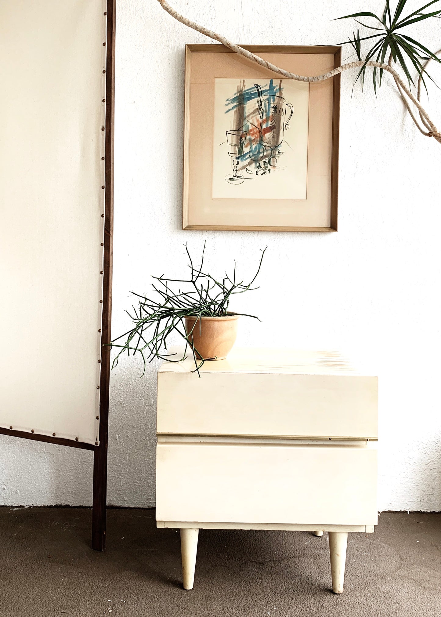 Solid wood weighty mid century night stand , tv stand, end table etc. versatile and great looking! Creamy white, chippy paint top. Gold drawer detail.