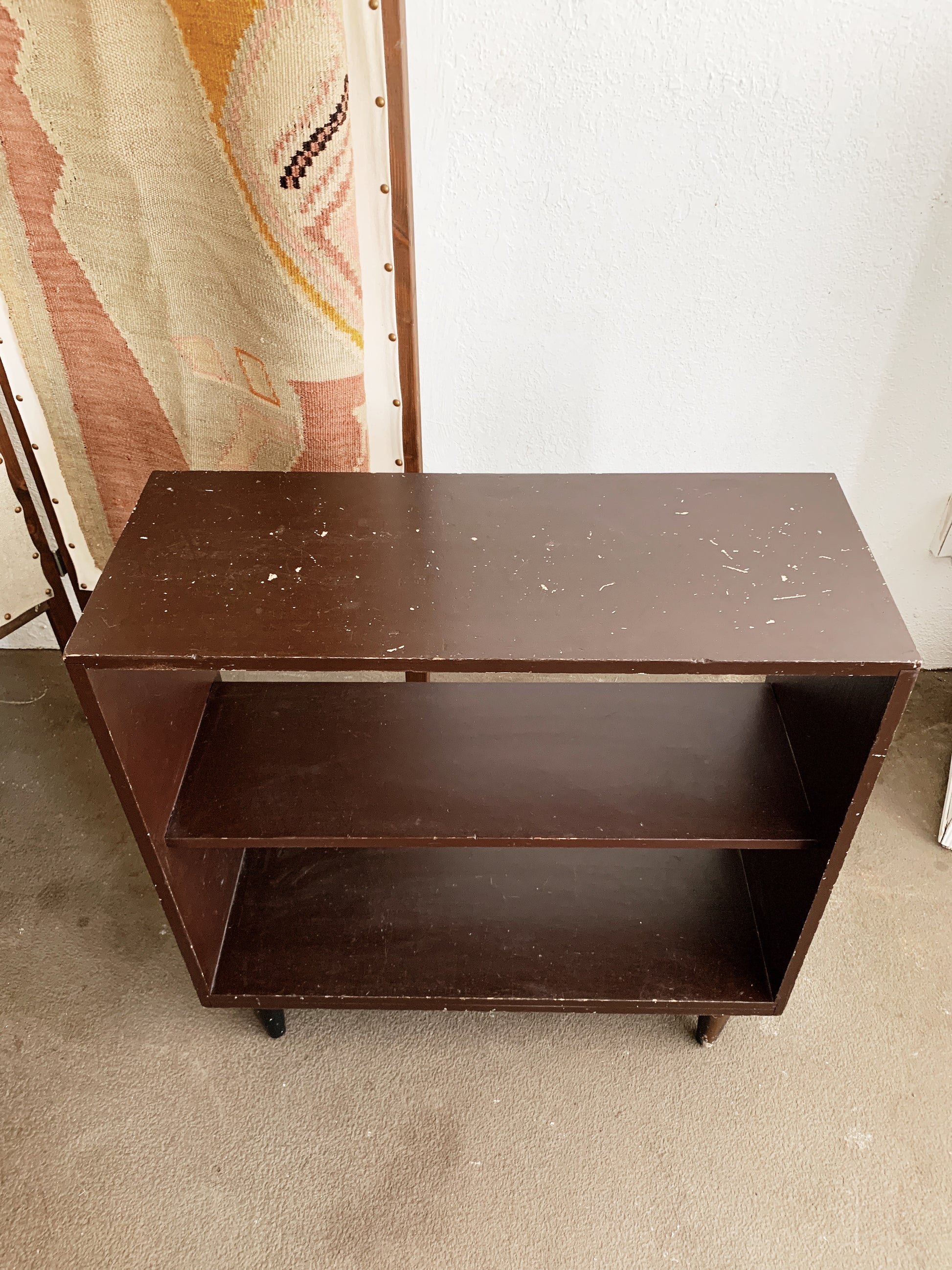 Great mid century all wood shelf with open back and tapered legs. Chippy chocolate brown paint. Sturdy!