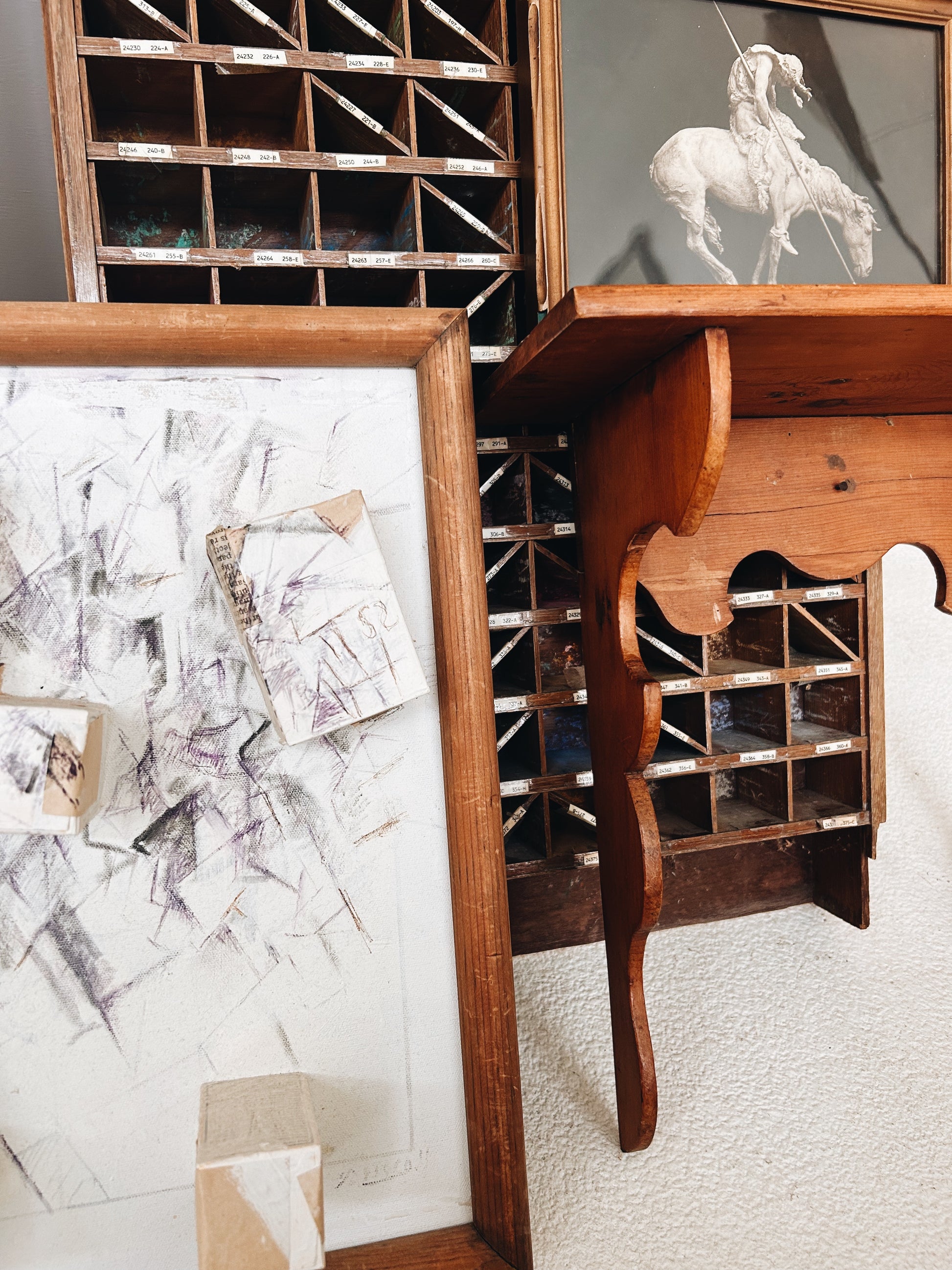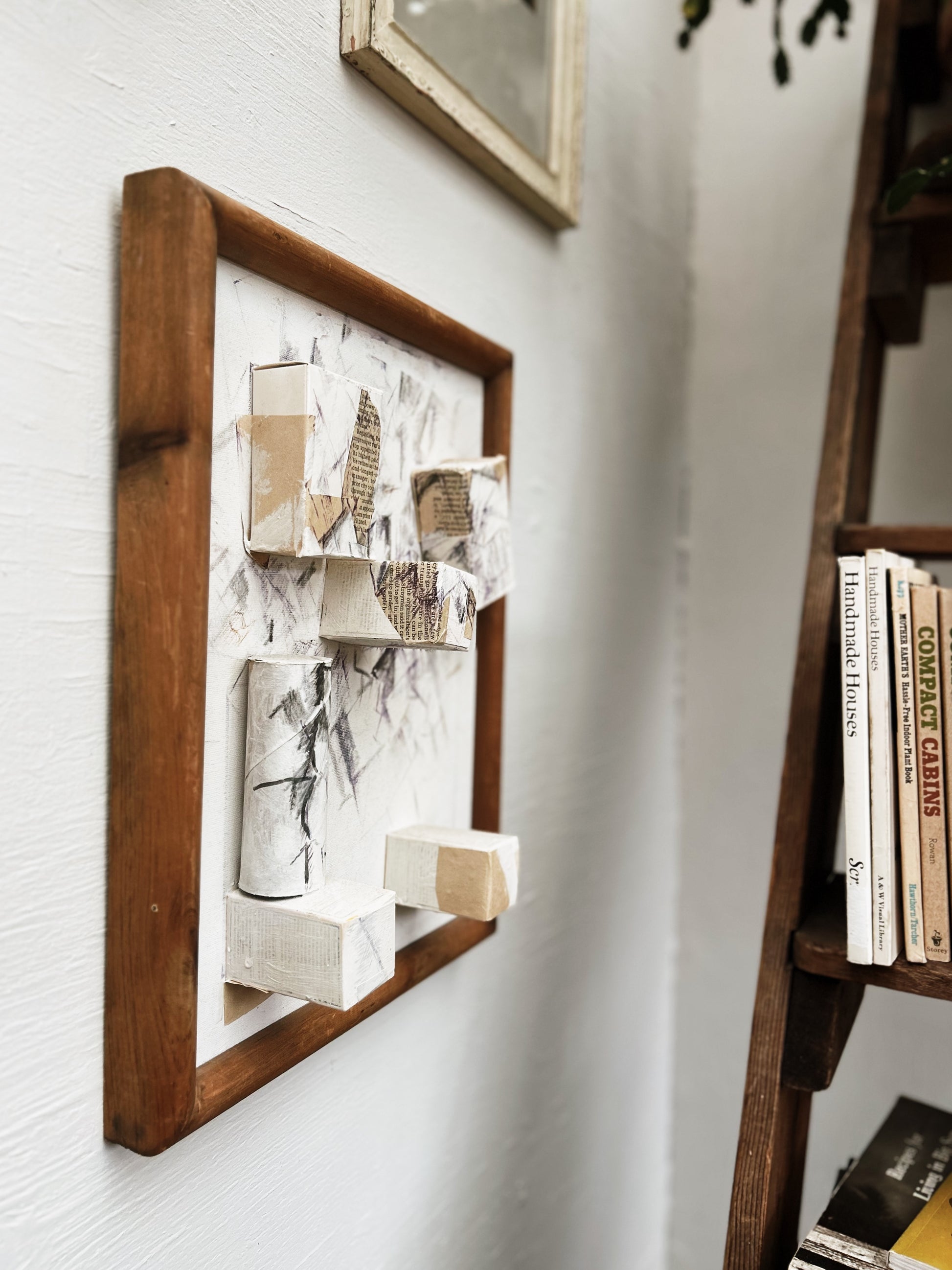 Vintage Norma Driscoll abstract mixed media collage, paper, paint, crayon, newsprint, cardboard. Presented without glass in a simple wood frame.
