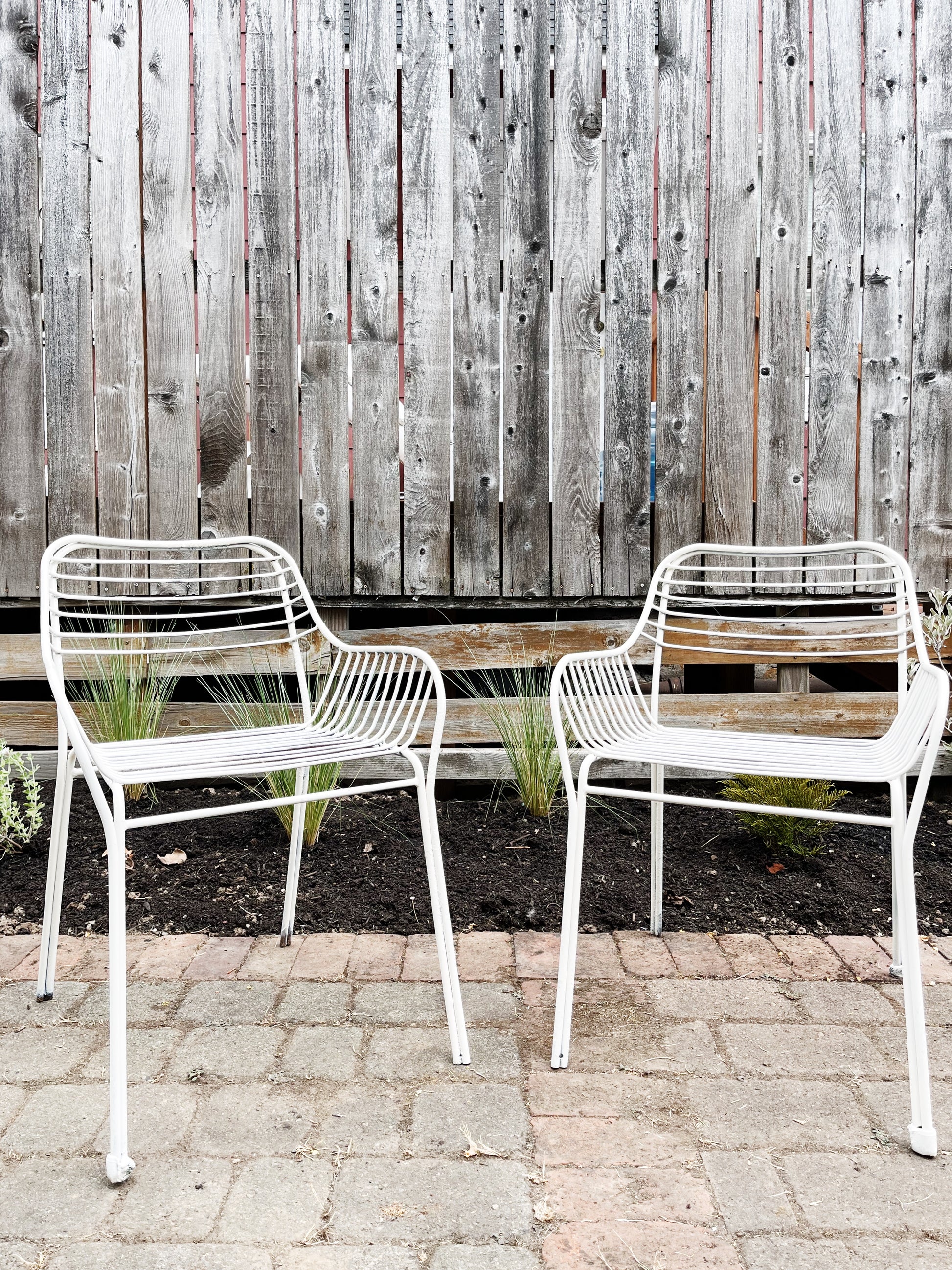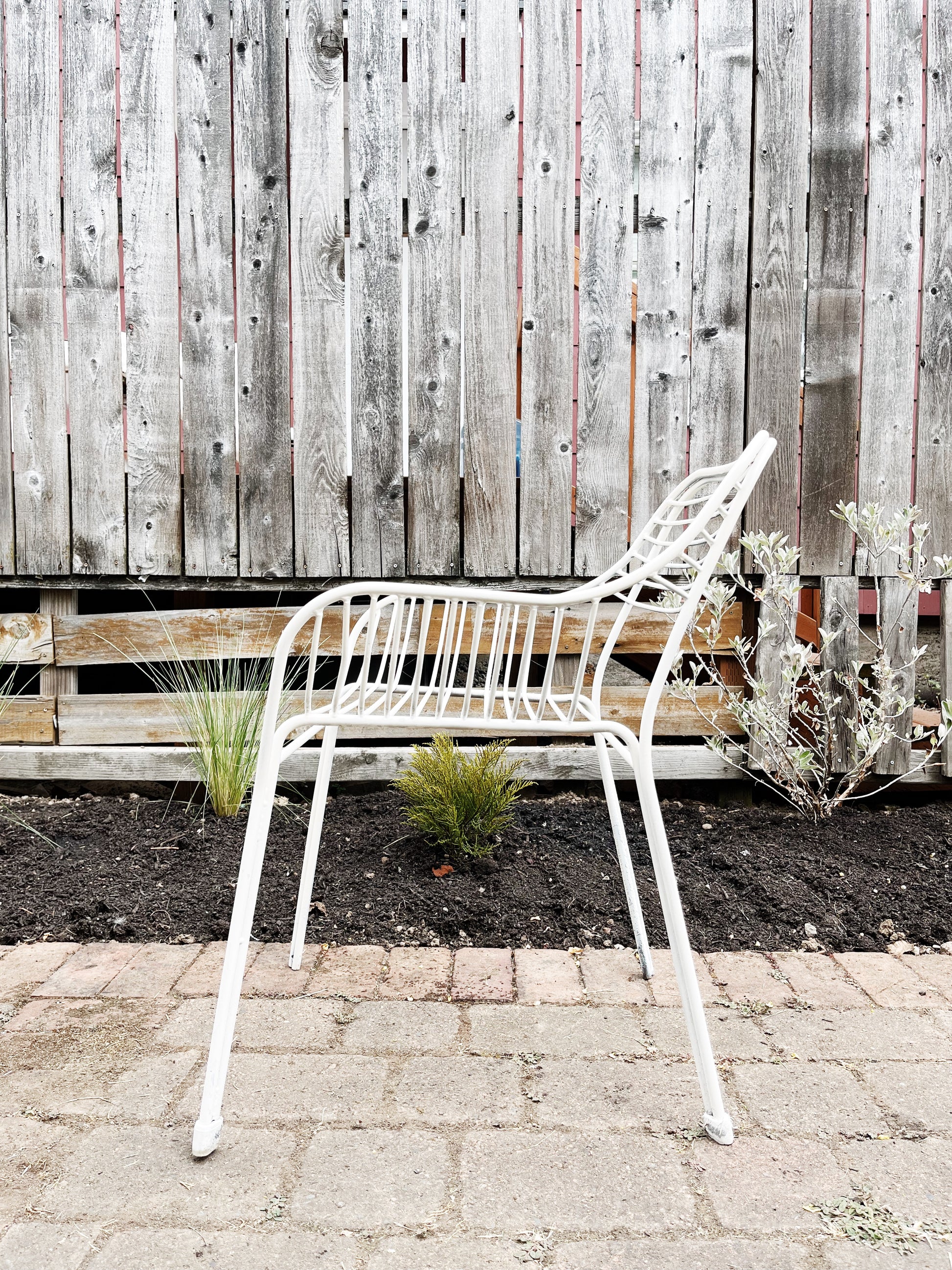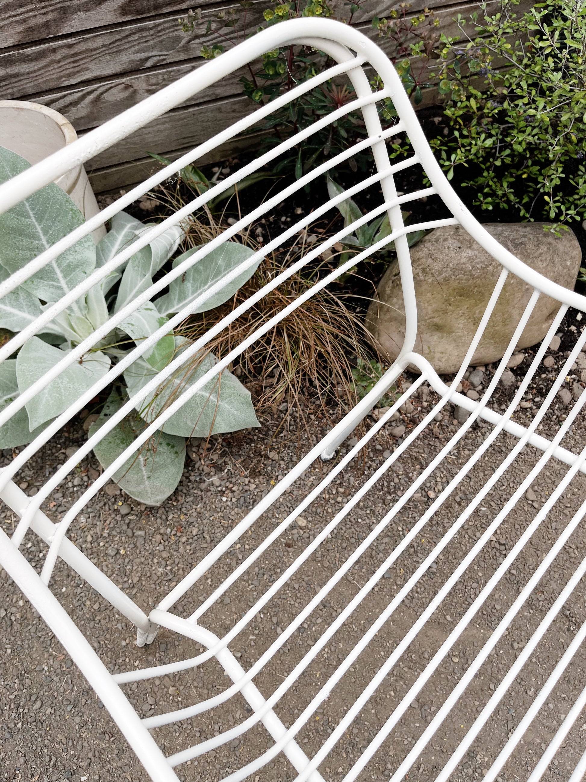 Fantastic profile on these weighty mid century iron chairs. A nice warm white. Slim footprint. And actually very comfortable for a sit