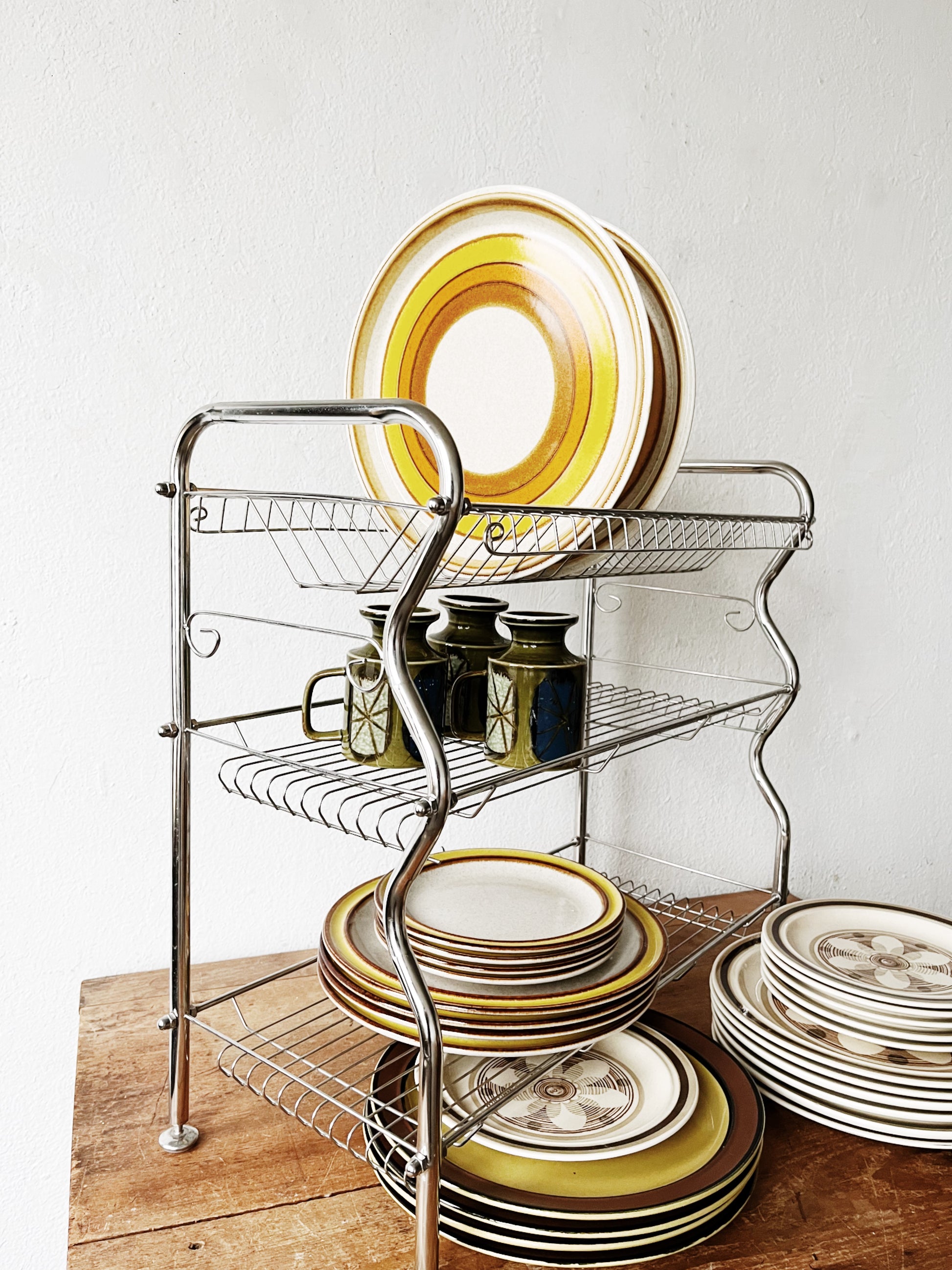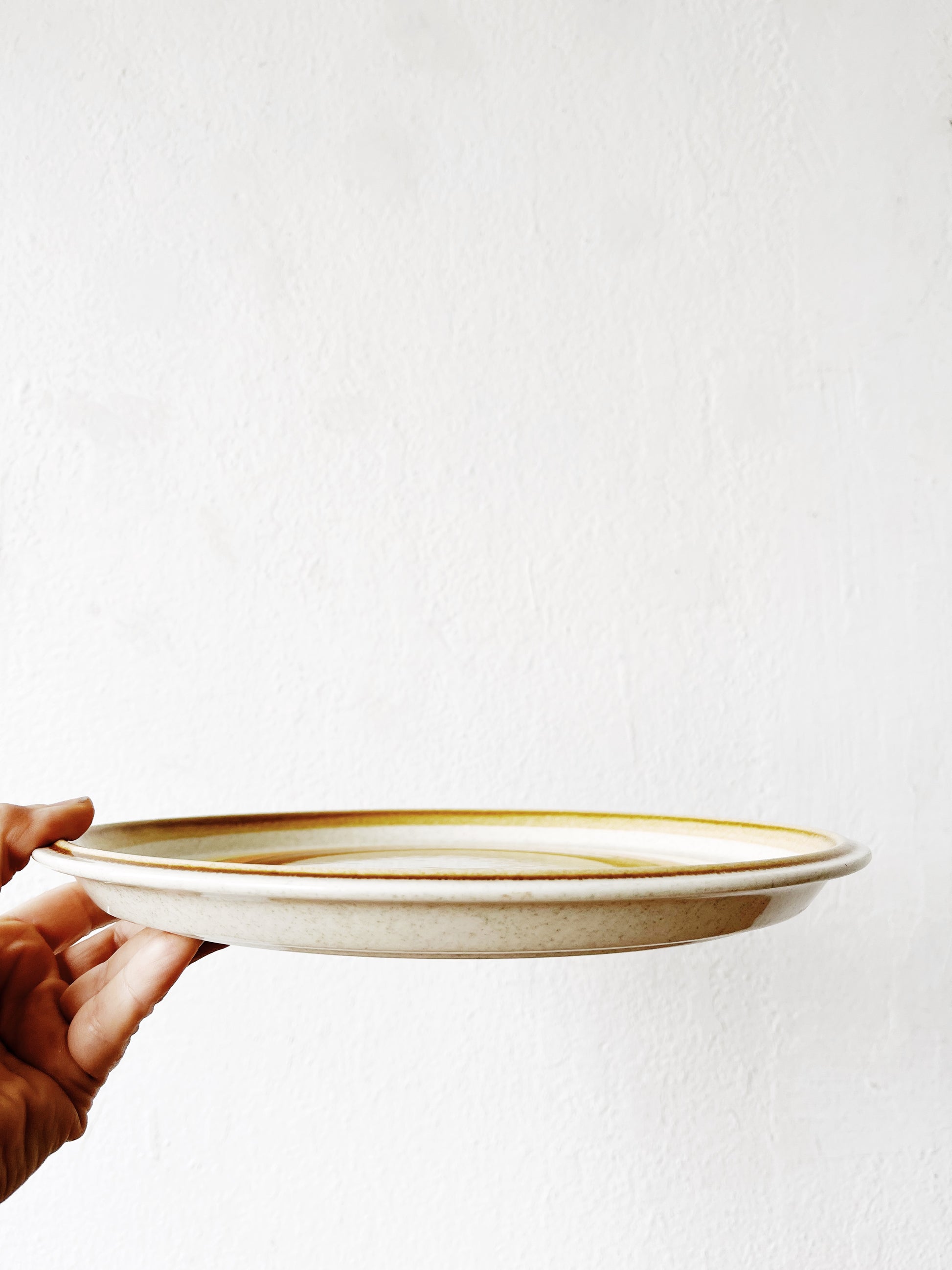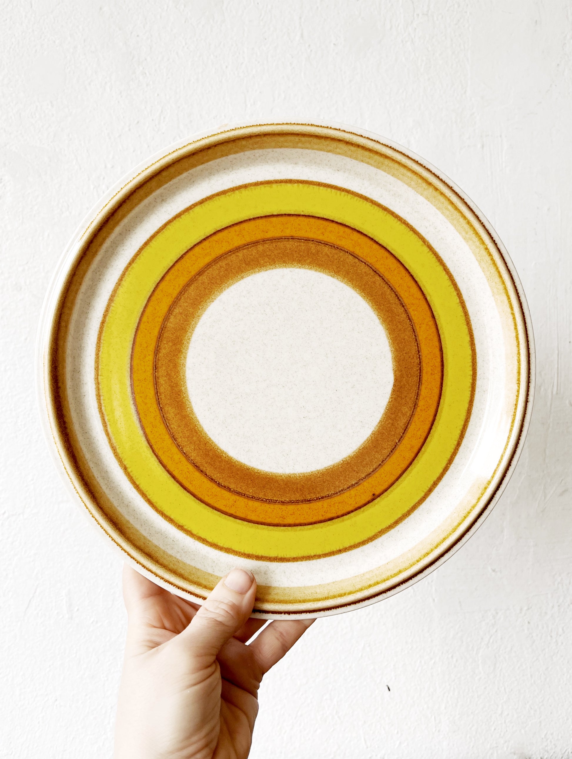 Vintage Mikasa 1970’s Sun Circle large stoneware plates, made in Japan. They coordinate well with some of the other stoneware we are listing.