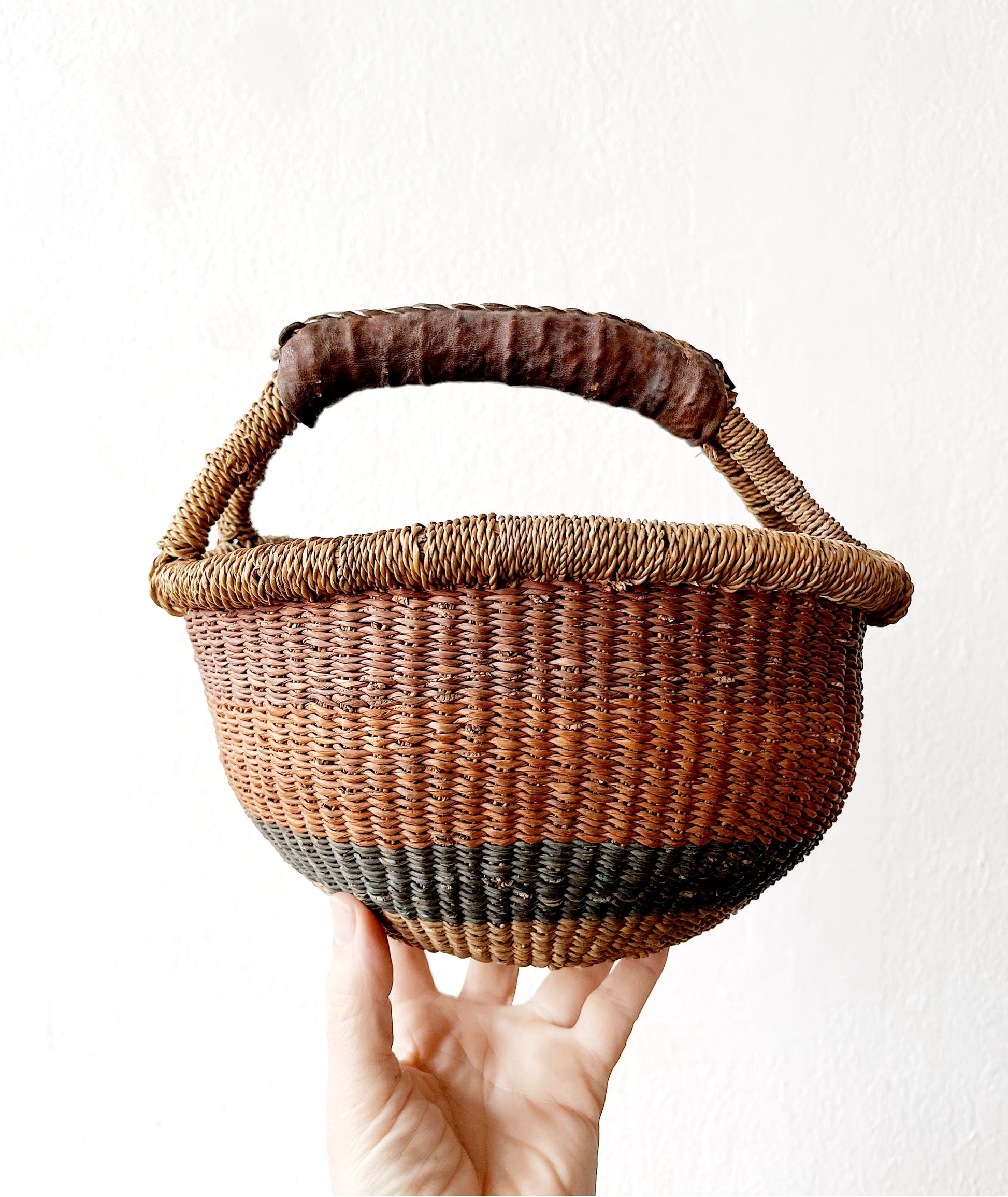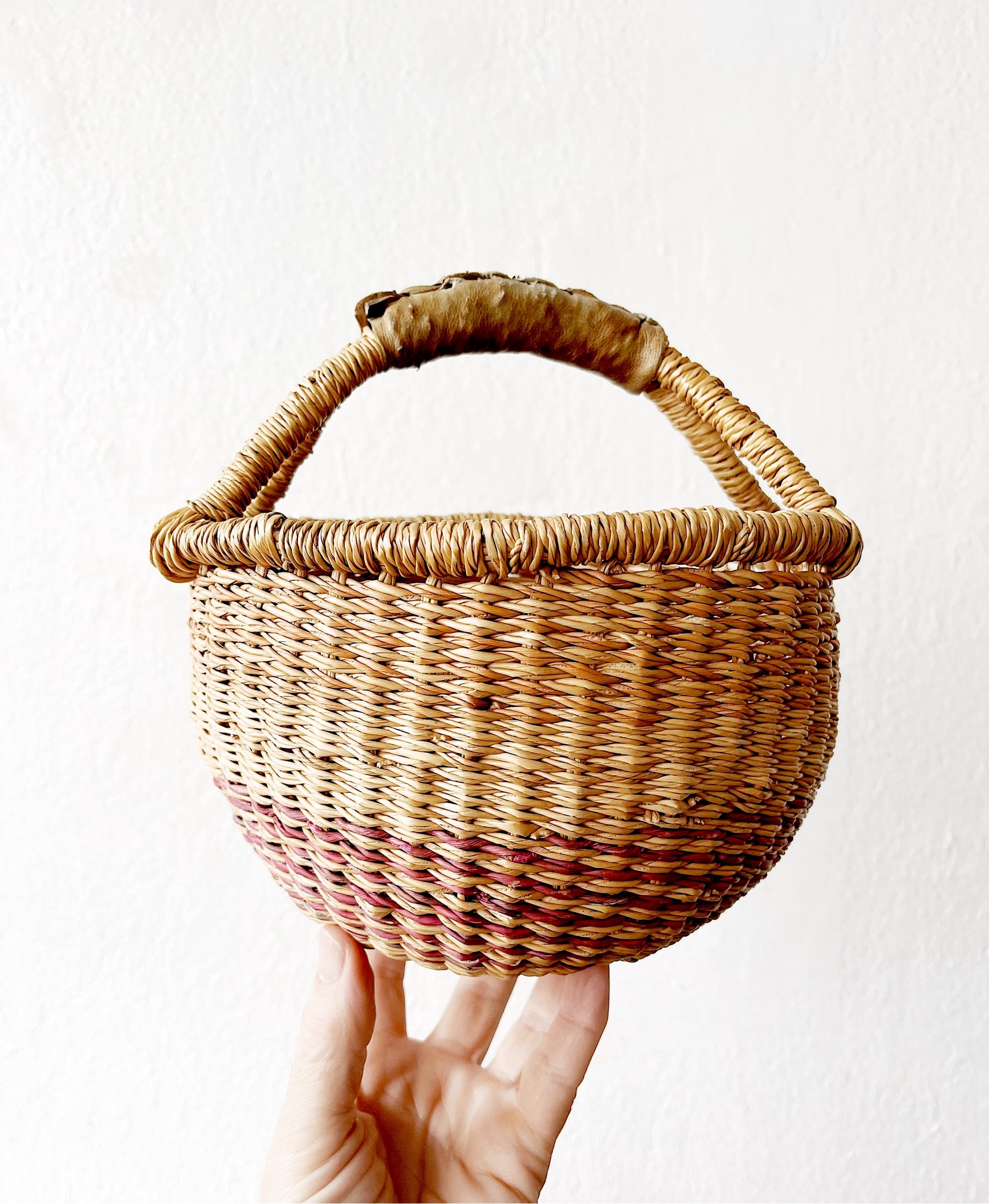 Sweet natural mini bolga with leather handle. Earthy colors. Perfect for Easter baskets, picking berries or toting a small lunch.