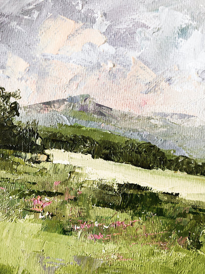 A small original landscape painting. Oil on canvas board. Pretty colors with a pink sky over the mountain. Signed