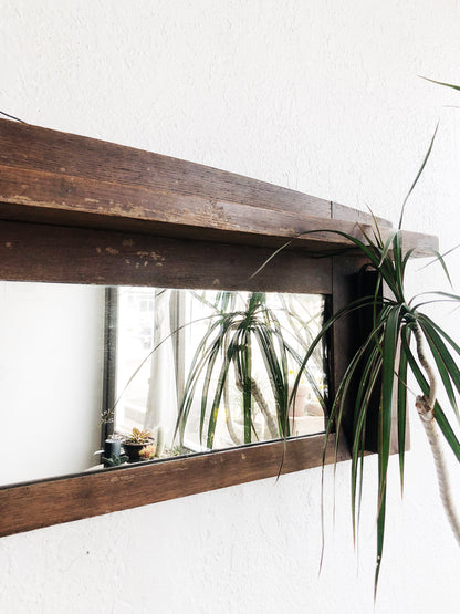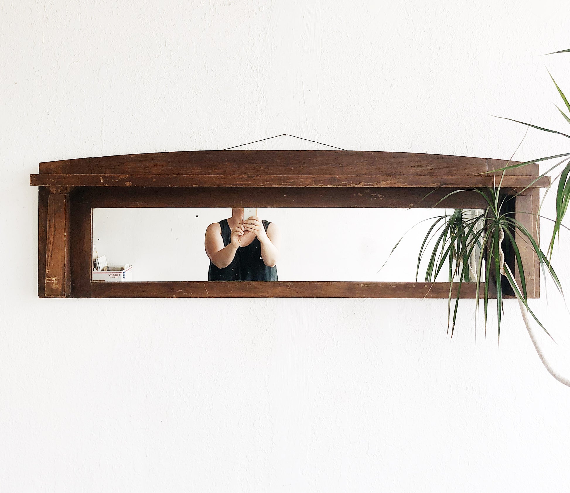 Greek revival walnut mirror Which probably had a history of being attached to a buffet. We love the simple and bold lines on this guy. Fantastic columnar sides and narrow shelf on top. Hanger on reverse. This one’s heavy. Some slight nicks to the glass which really don’t detract at all