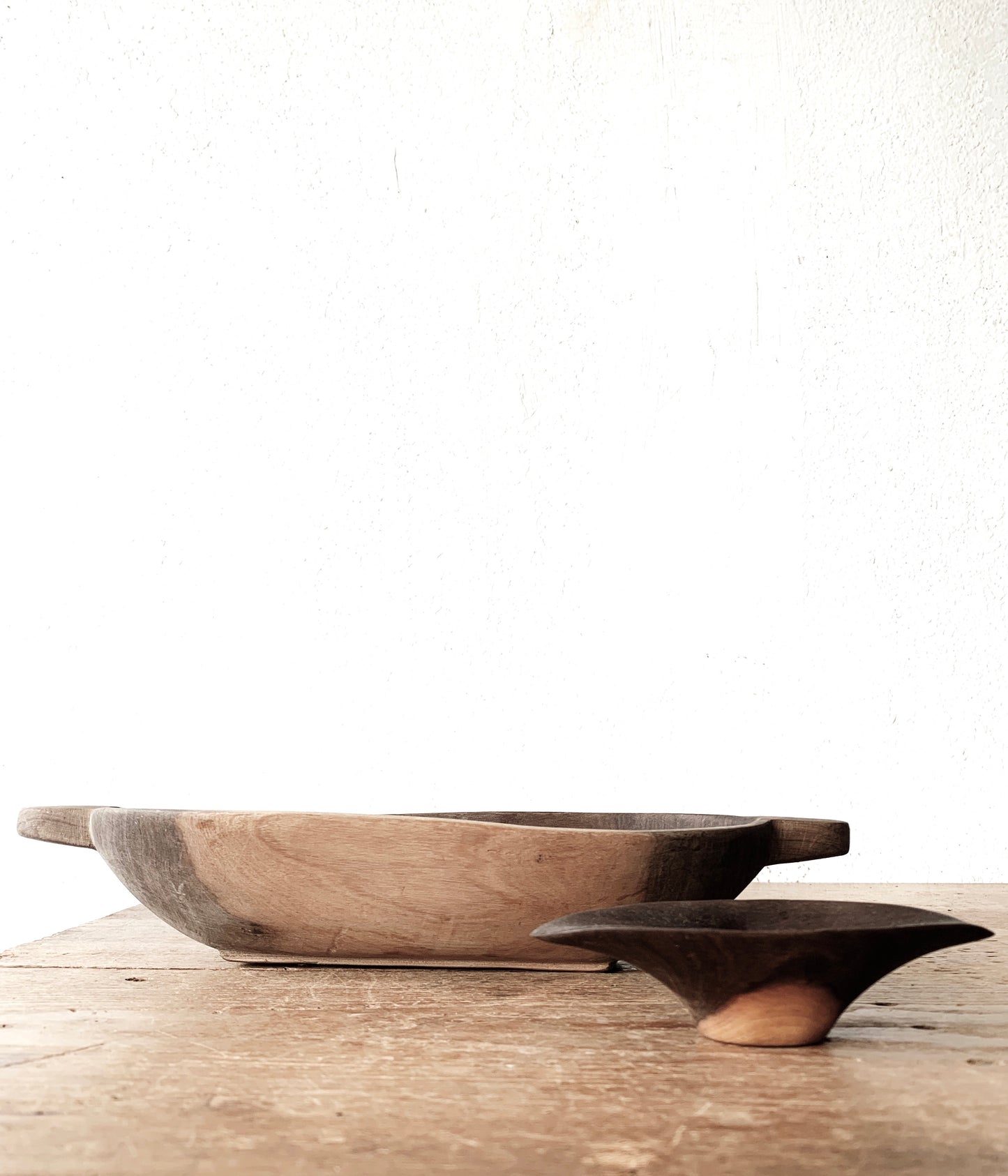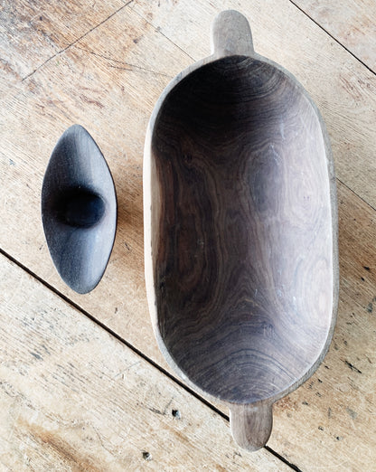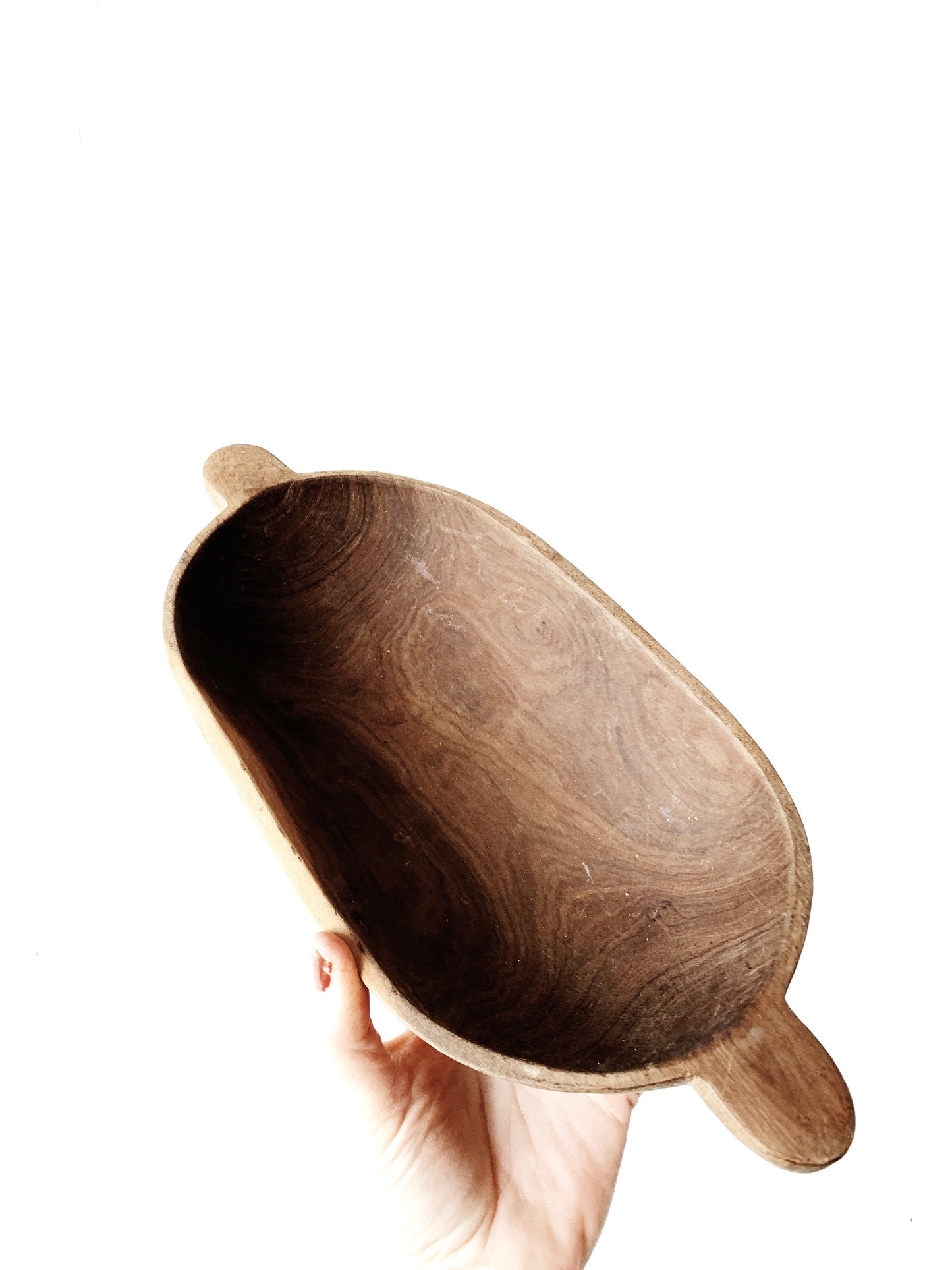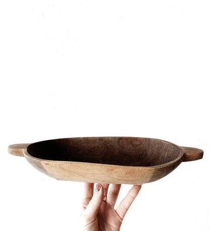 Beautifully carved natural wood bowl. Slightly asymmetrical with gorgeous grain. Flat bottom and handles