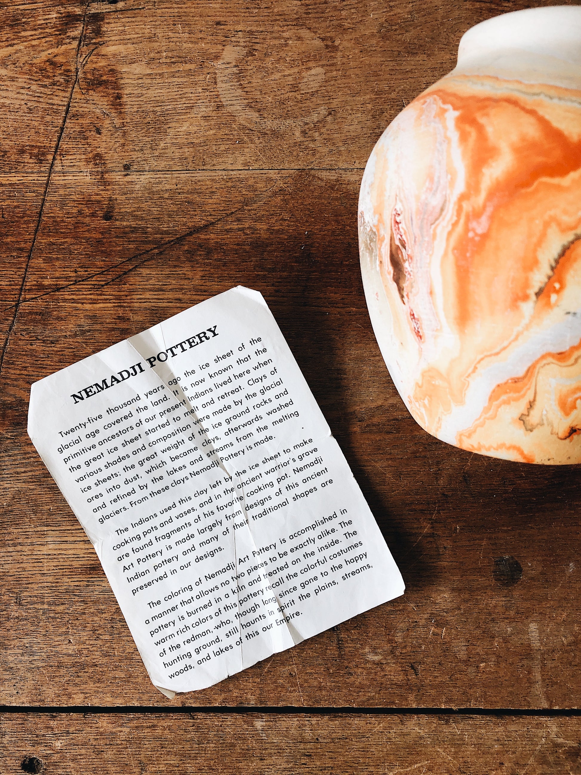 Nemadji Pottery is like a rainbow in a vase. This one has beautiful sunset colors. Contains literature on how the pottery is made. Fascinating!