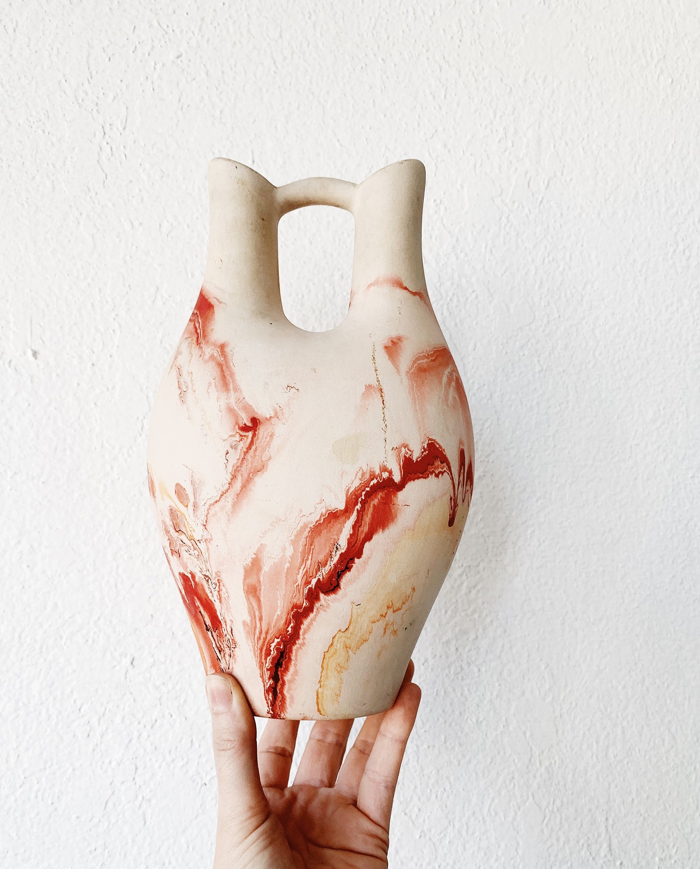 Beautiful Nemadji Pottery wedding vase in shades of rust, grey, terra cotta and coral.