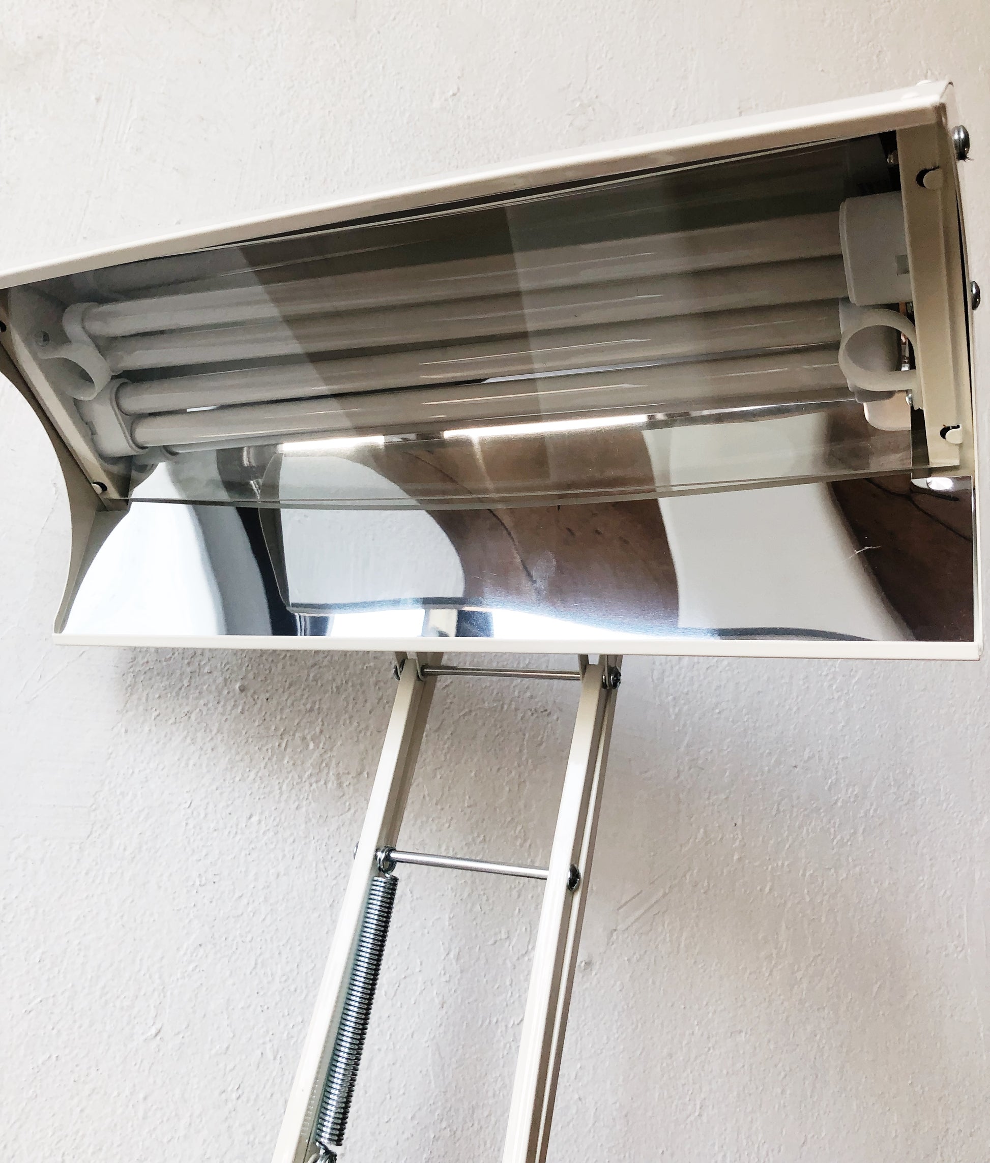 Made in Canada, The Northern Light desk lamp is a light therapy product. Ivory enamel over metal. It’s completely adjustable. and it’s 10,000 Lux allows you to sit as far away as 18-24”. It serves as a bright work light as well. Throws bright light but not heat. Great look too.
