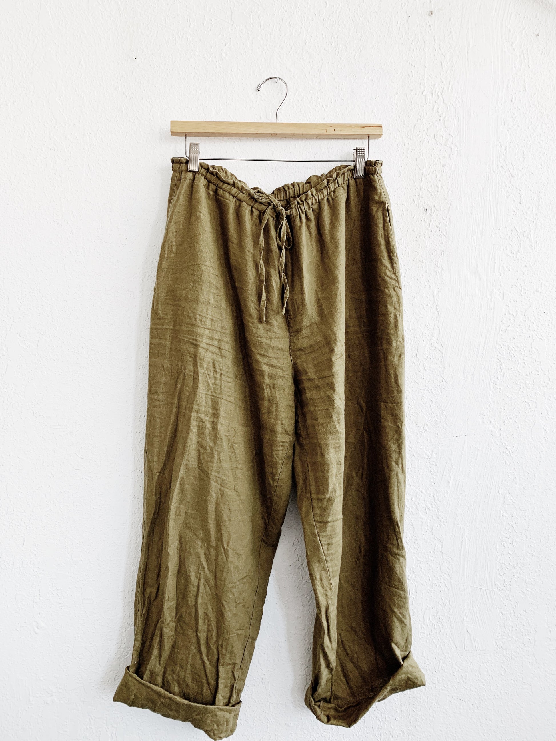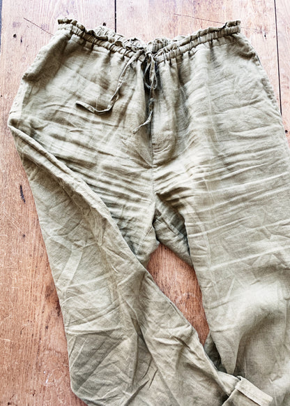 A great pair of linen pants. Button, zip closure, drawstring waist. Fit is med/lrge. Lightweight linen with pockets. No tag. Excellent condition.