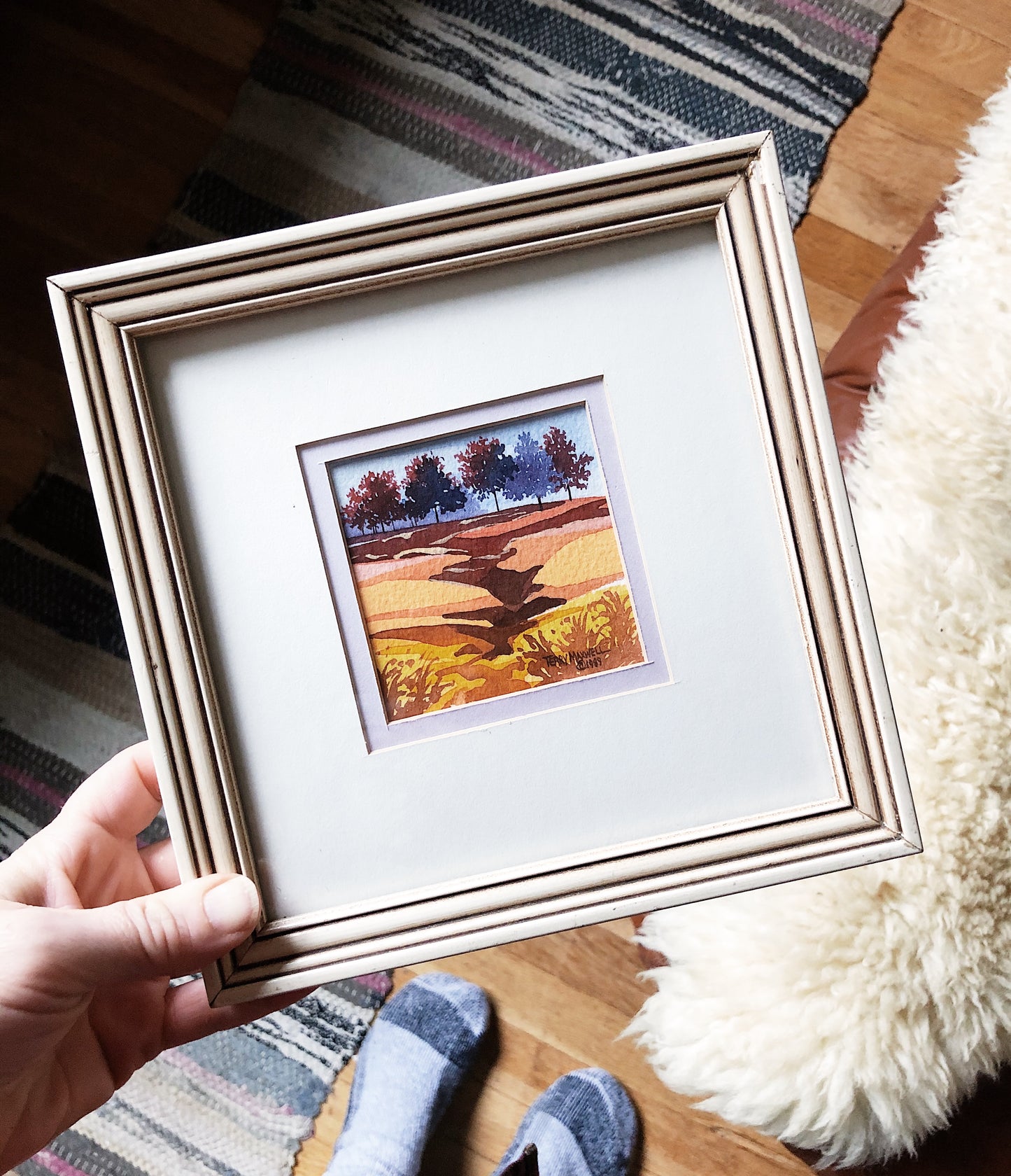 Smaller sized watercolor landscape. Signed and dated. In a nice creamy white frame under glass