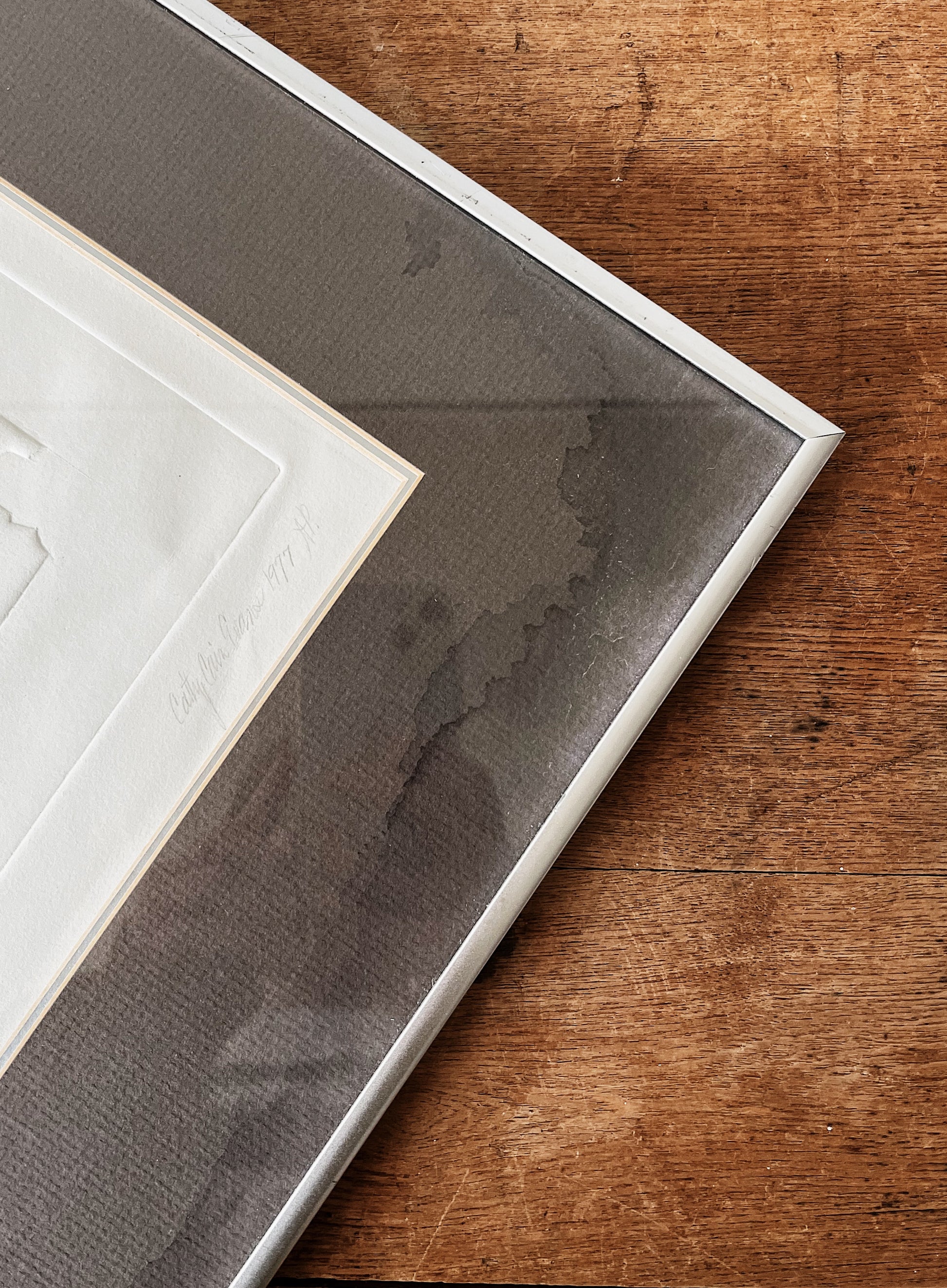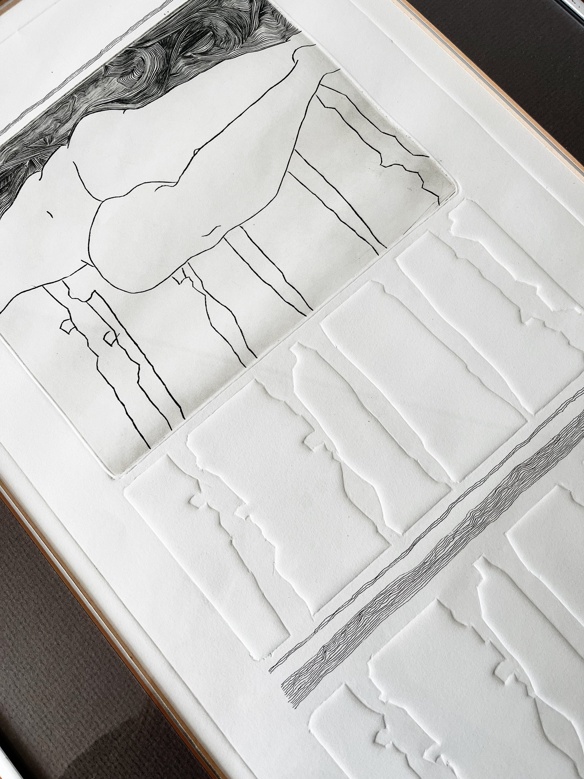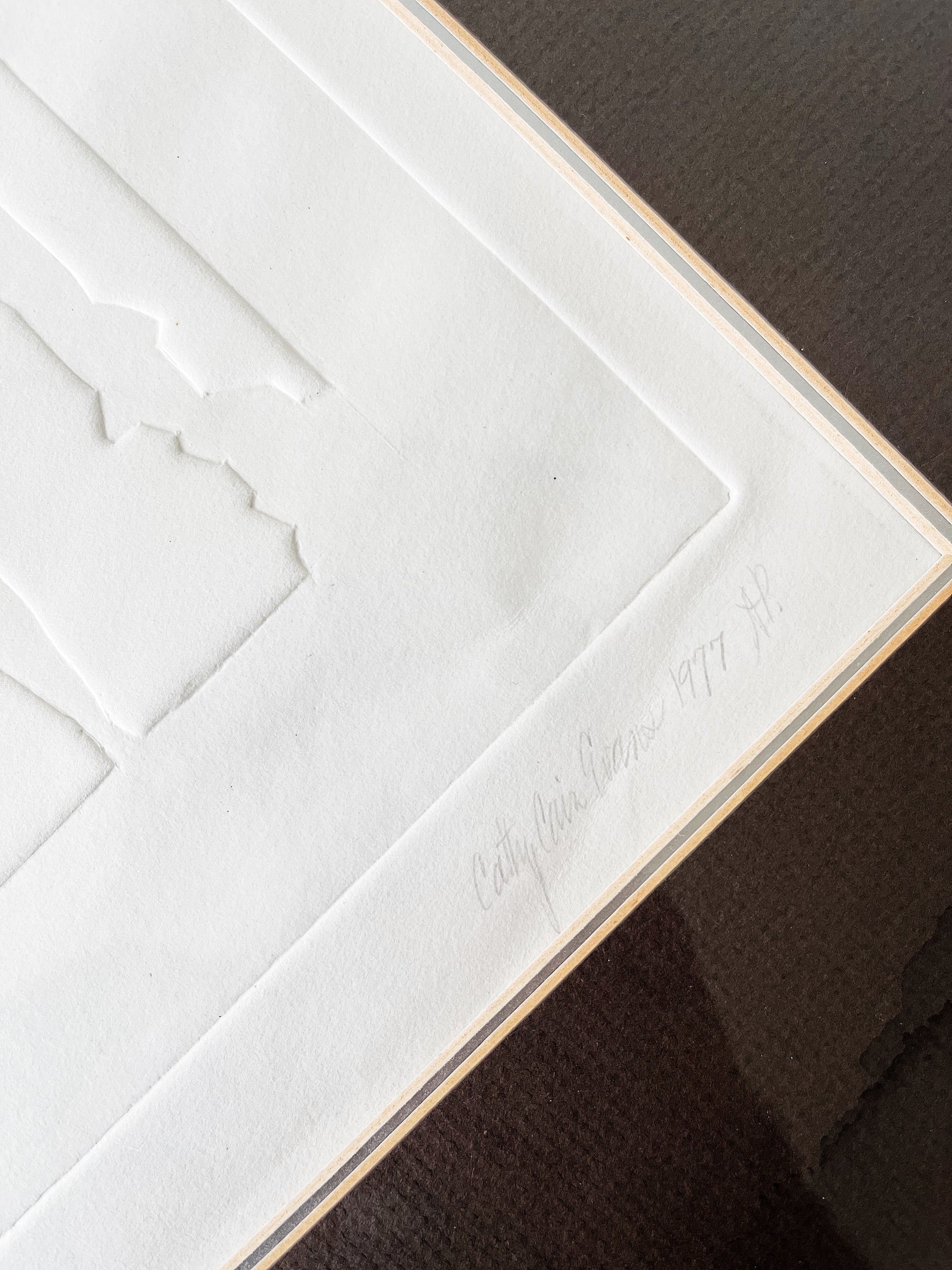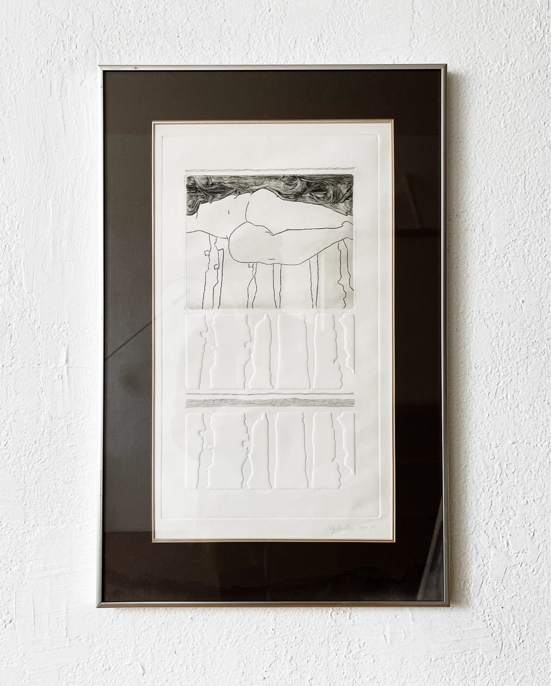 Reminiscent of the deco work of Aubrey Beardsley, this nude figural etching combines abstract raised areas with the delicate lines of the figure. This work is framed under glass in a metal museum mount. Signed and dated 1977