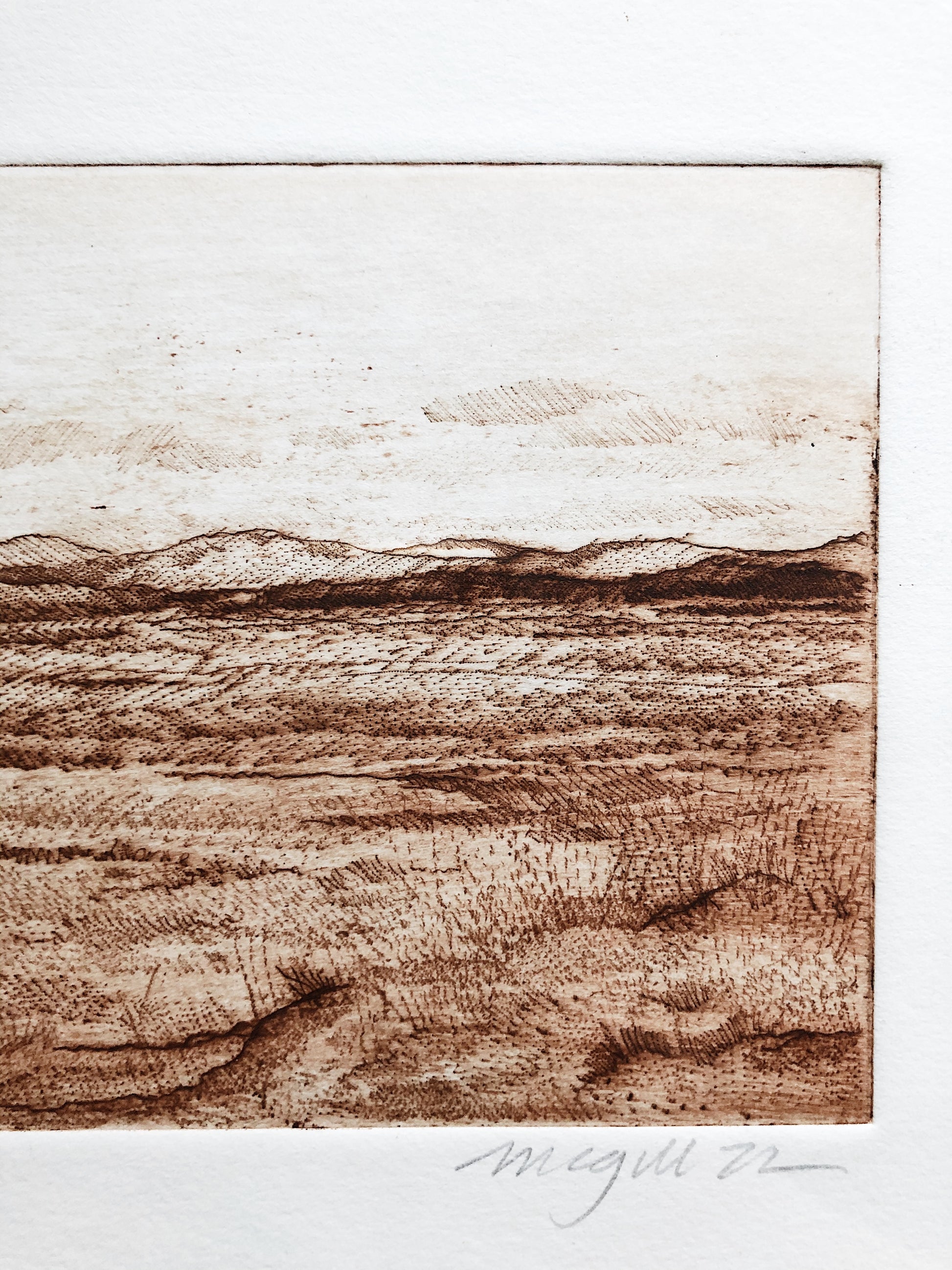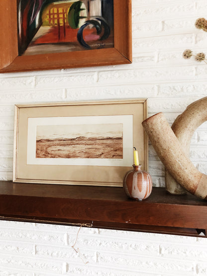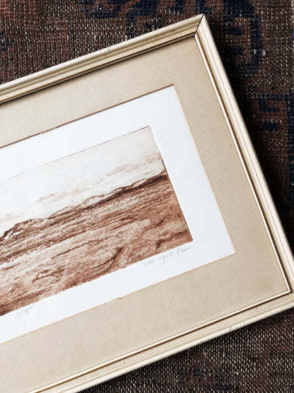 Stunning high desert etching made in the 1970s. Intaglio print 1/5. Beautiful colors and texture. Framed in vintage wood under glass