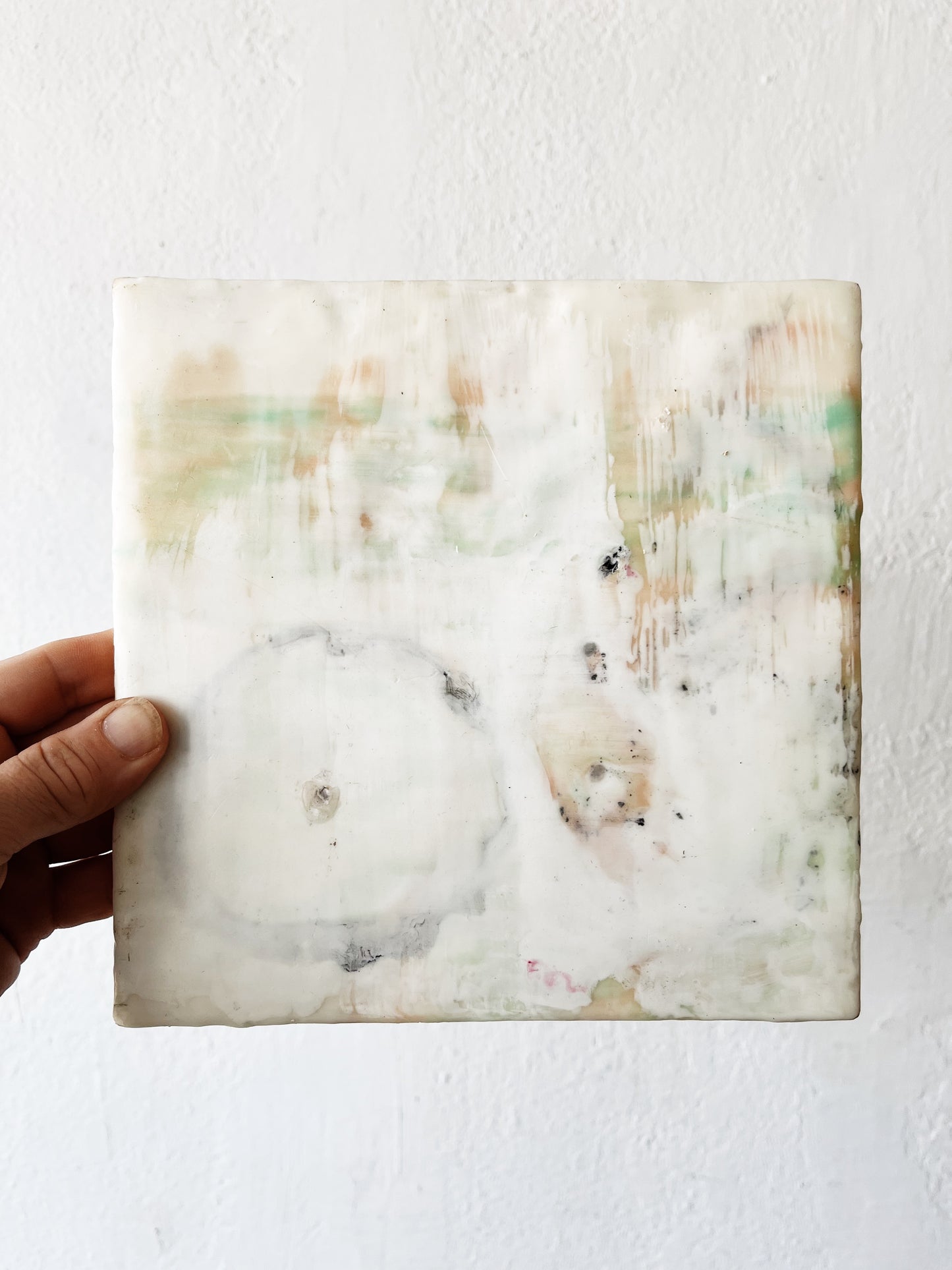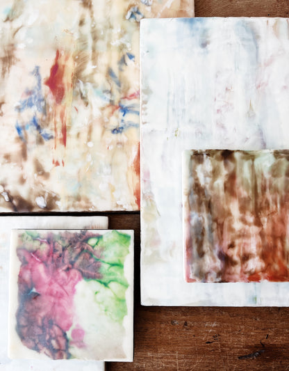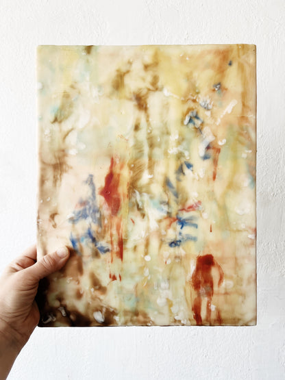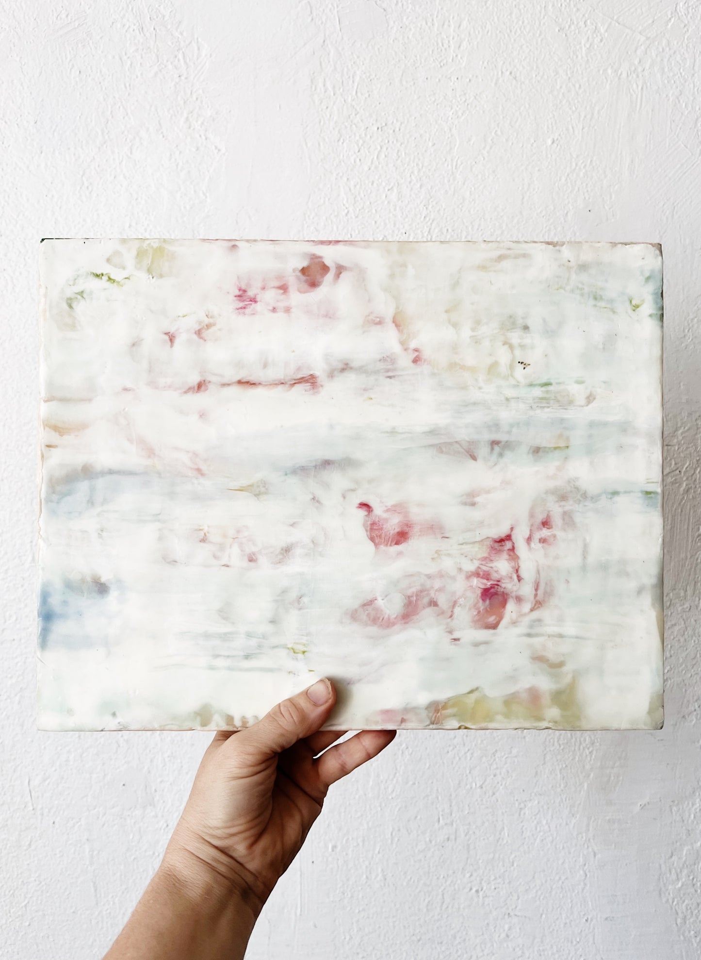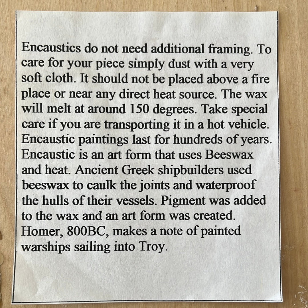 Pretty marbled colors in these encaustic works. Made from beeswax, damar resin, pigmented wax, birch board. The wax coating creates an ethereal ghostlike appearance. Original paintings by Ruth Skodacek. Done on frameless board with hanger. Made locally in 2010’s