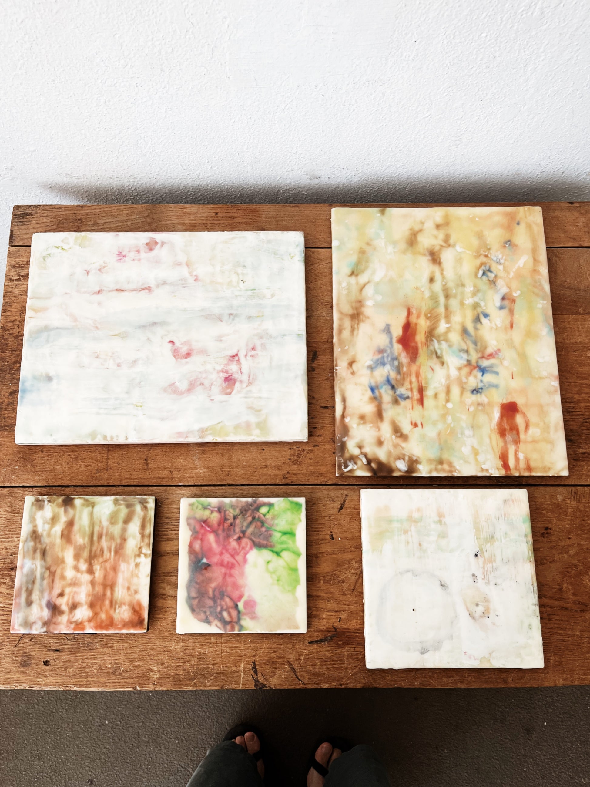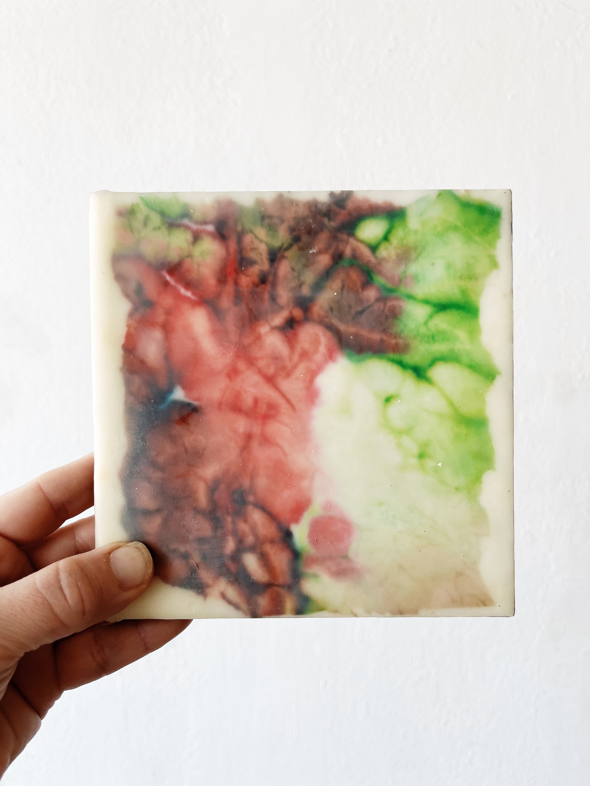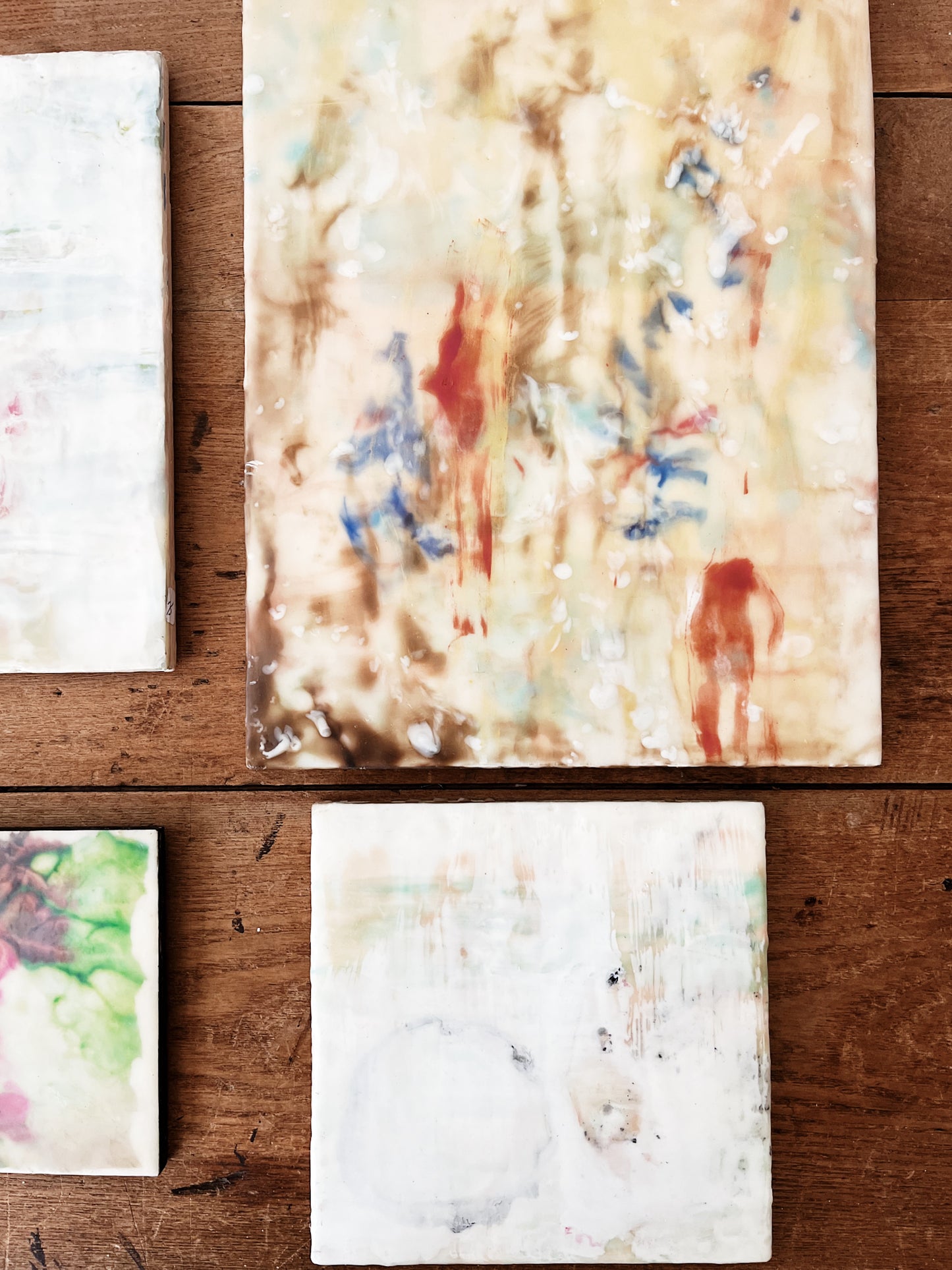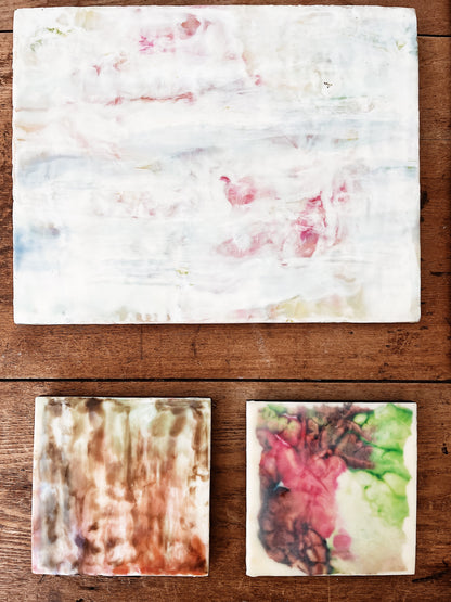 Pretty marbled colors in these encaustic works. Made from beeswax, damar resin, pigmented wax, birch board. The wax coating creates an ethereal ghostlike appearance. Original paintings by Ruth Skodacek. Done on frameless board with hanger. Made locally in 2010’s