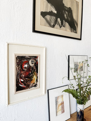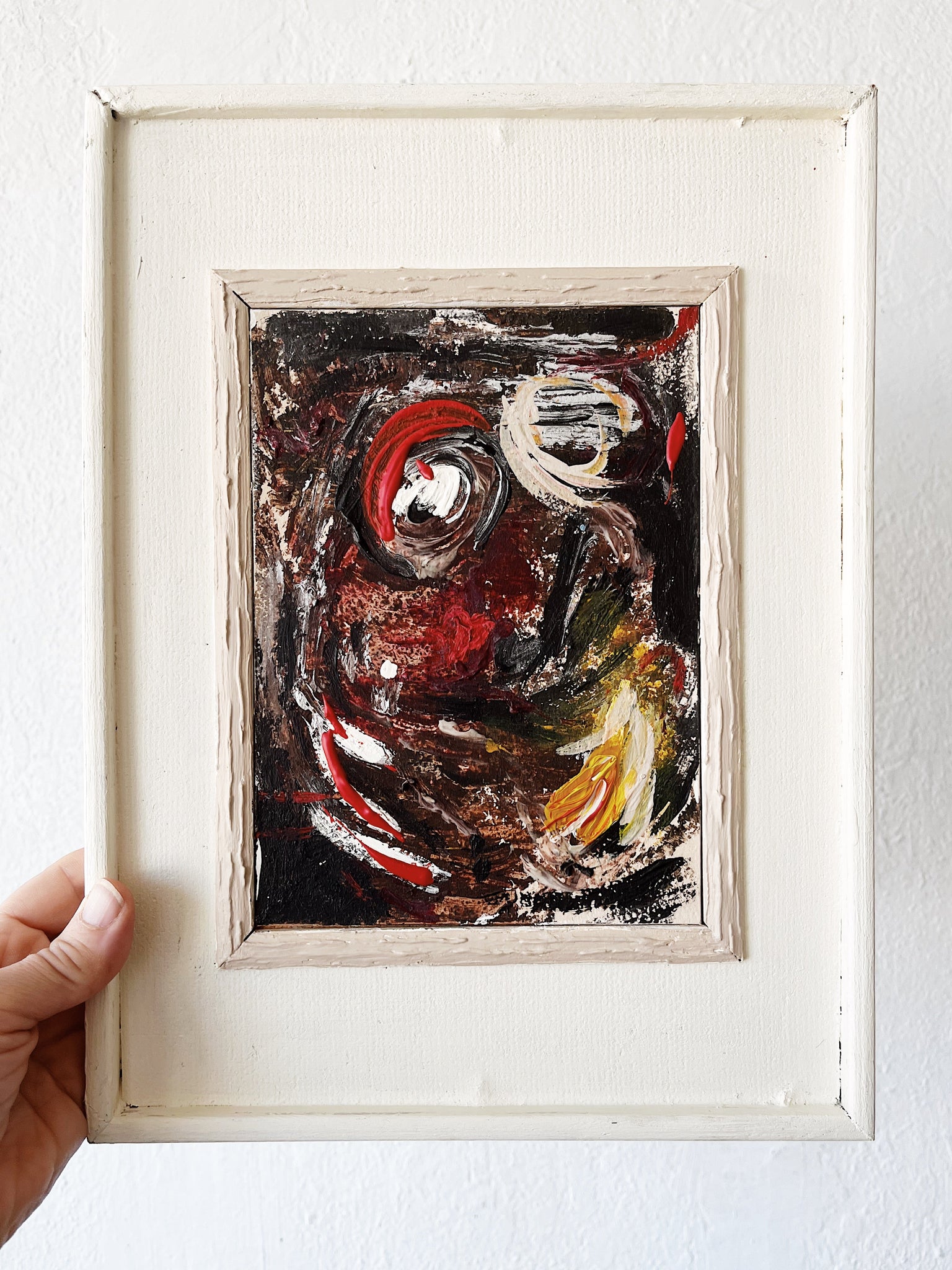 Original abstract expressionist painting on board. Fun energetic composition. We actually believe this to be a self portrait but you can see whatever meets your fancy. Signed Cameron and dated on reverse 1965. Framed in vintage wood.