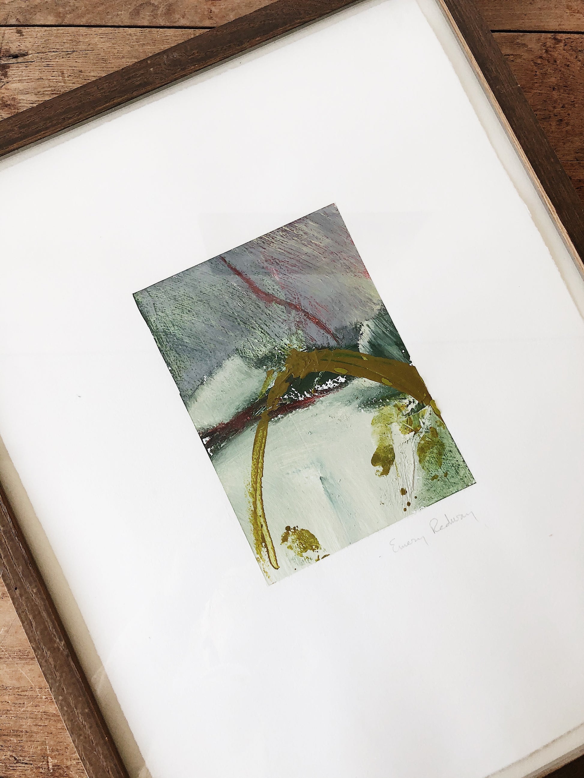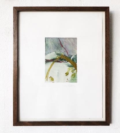 Beautiful colors in this abstract painting. Oil and possibly gouache. Top mounted and framed in wood under glass. Signed