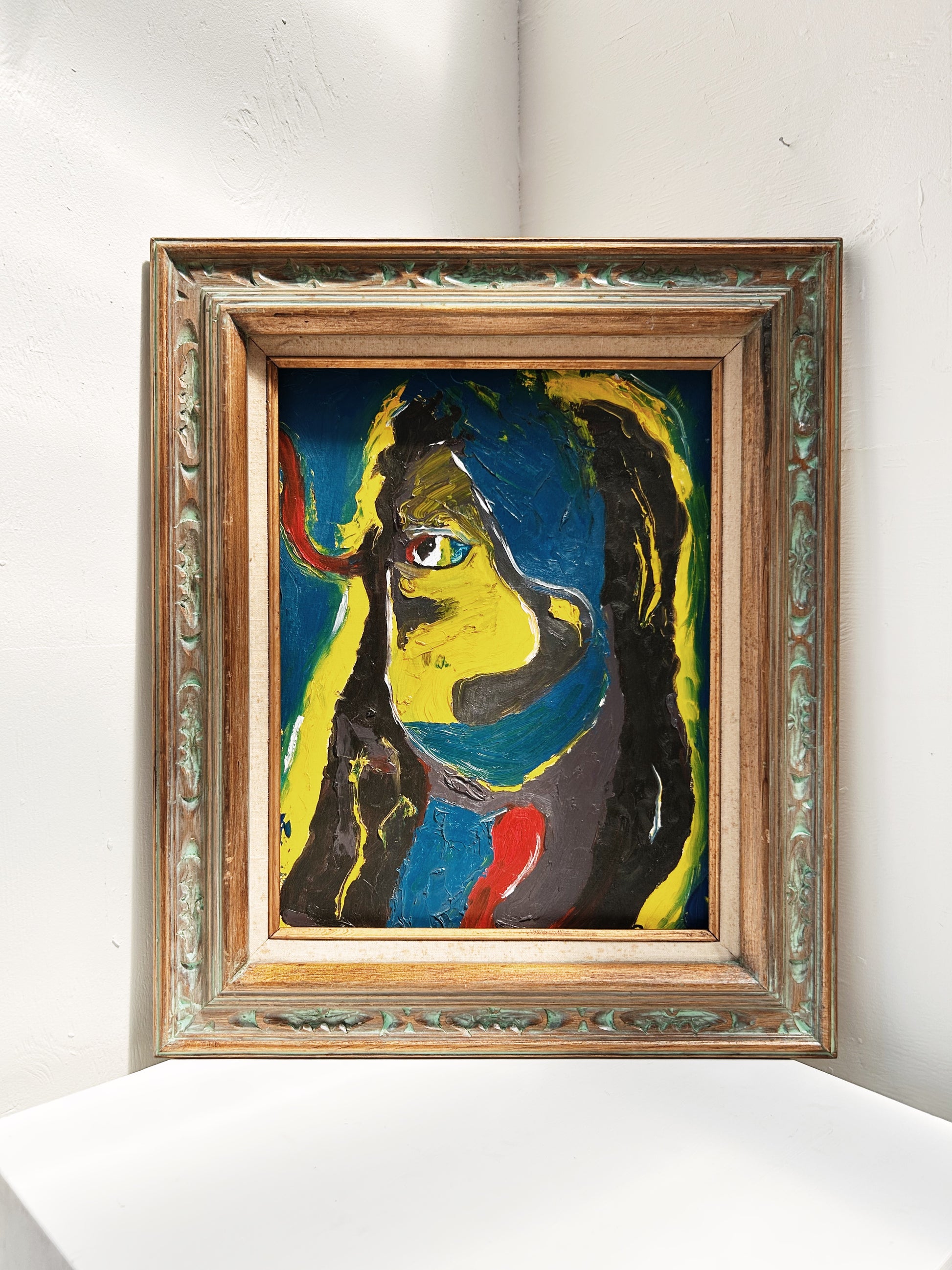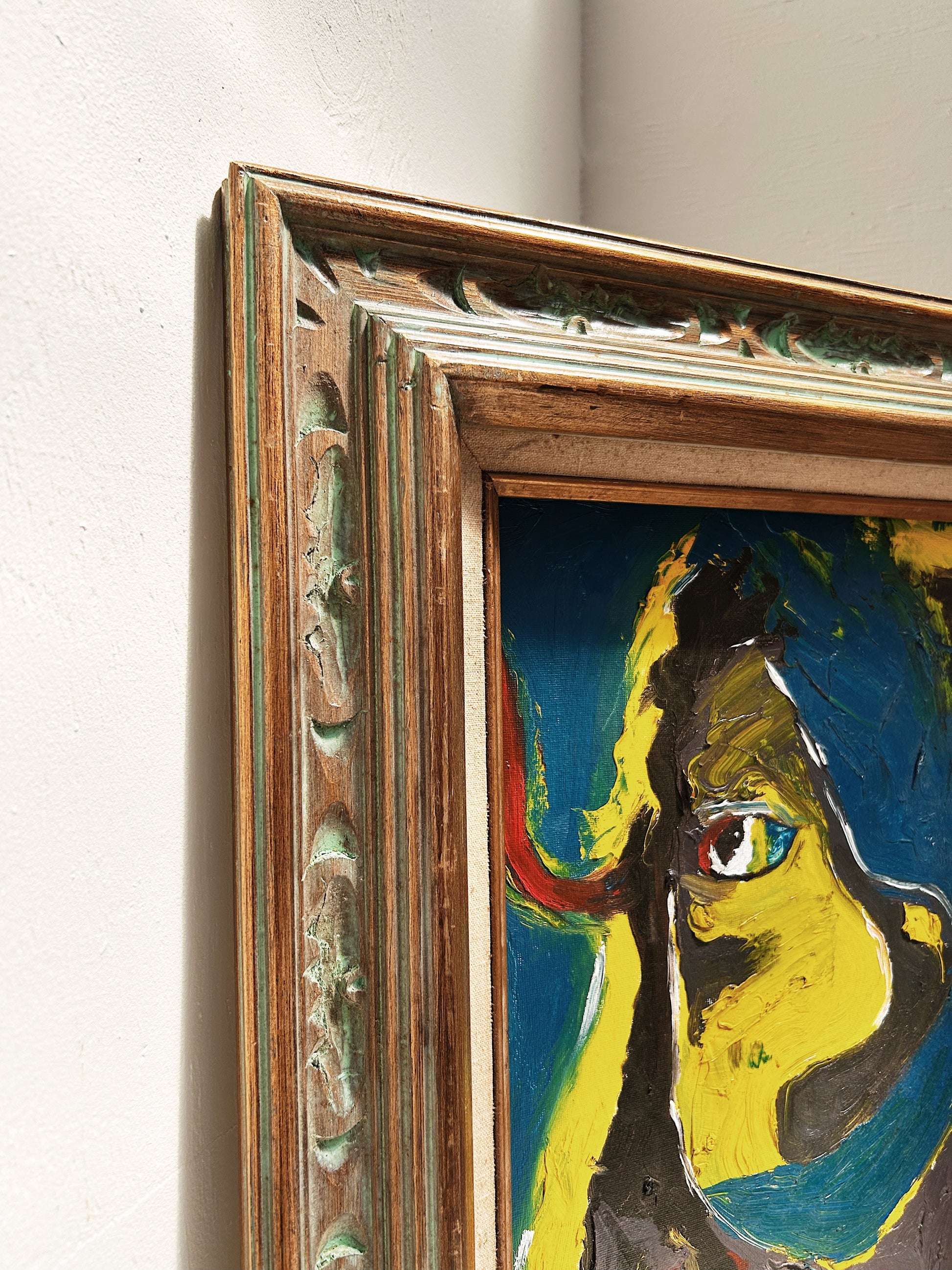 Original expressionist style abstract portrait. Heavily applied acrylic on board. Framed in really lovely carved wood with a pale turquoise wash and linen fillet. Great color statement for a room