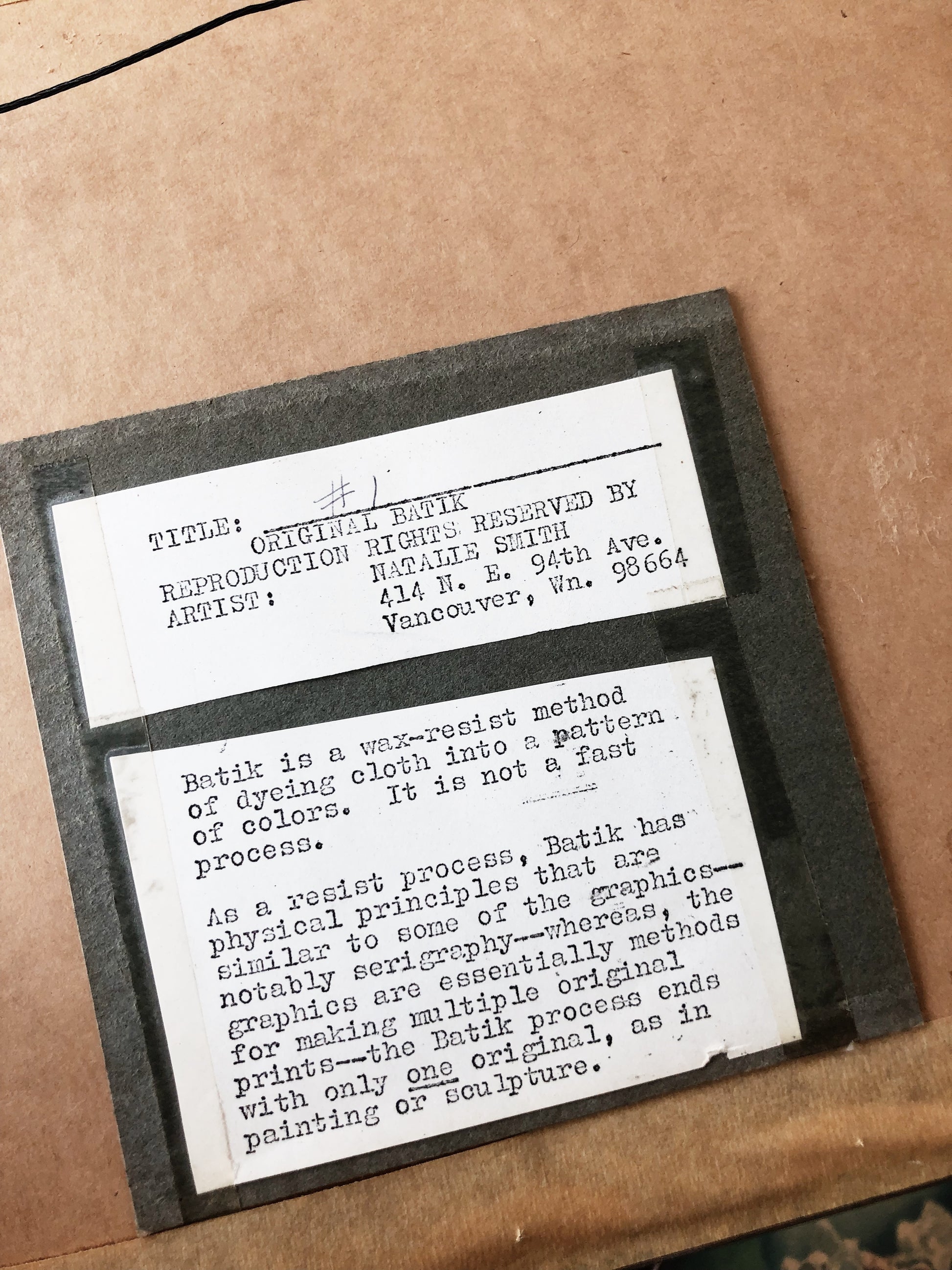 Beautiful hand done batik art. Professionally framed with info on reverse