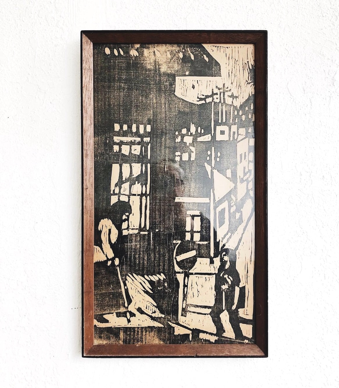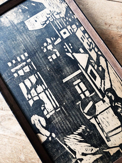 Really well done block print of a neighborhood city scene. Love the oblong shape. Framed under glass in vintage wood