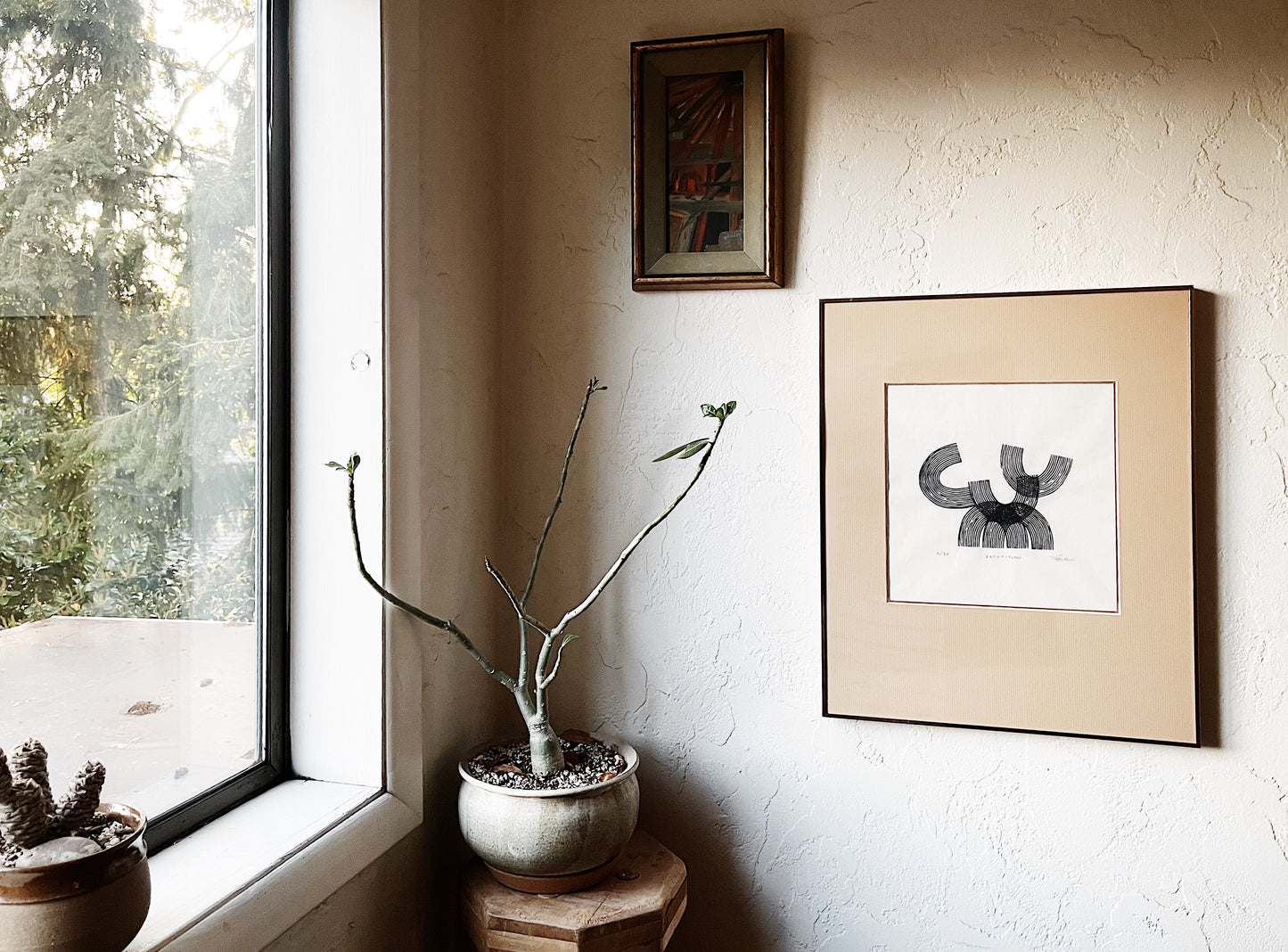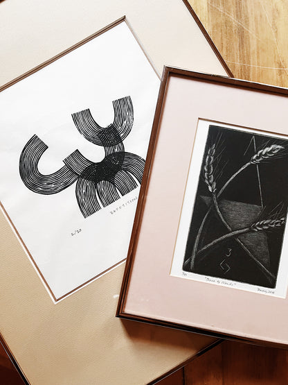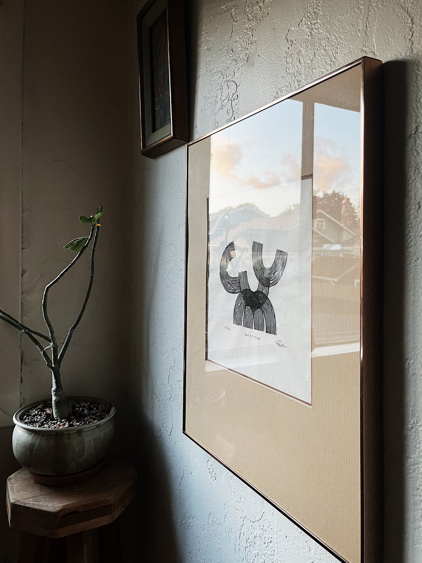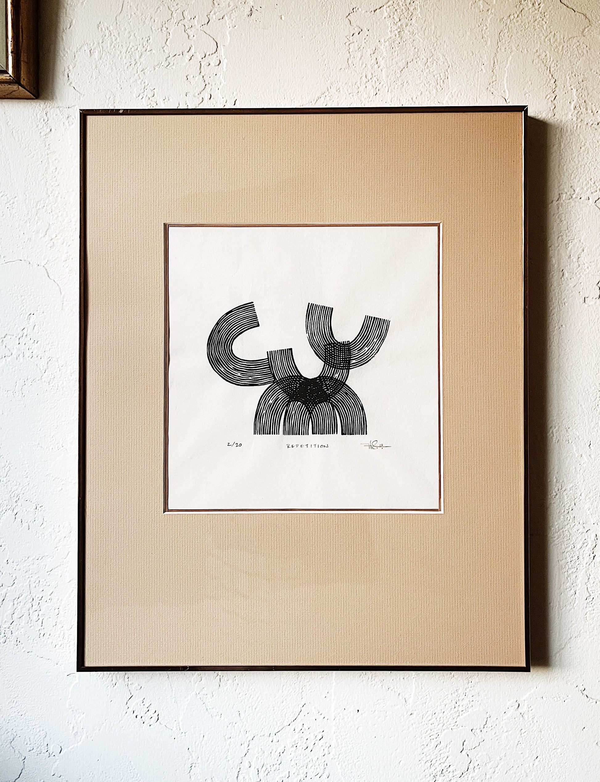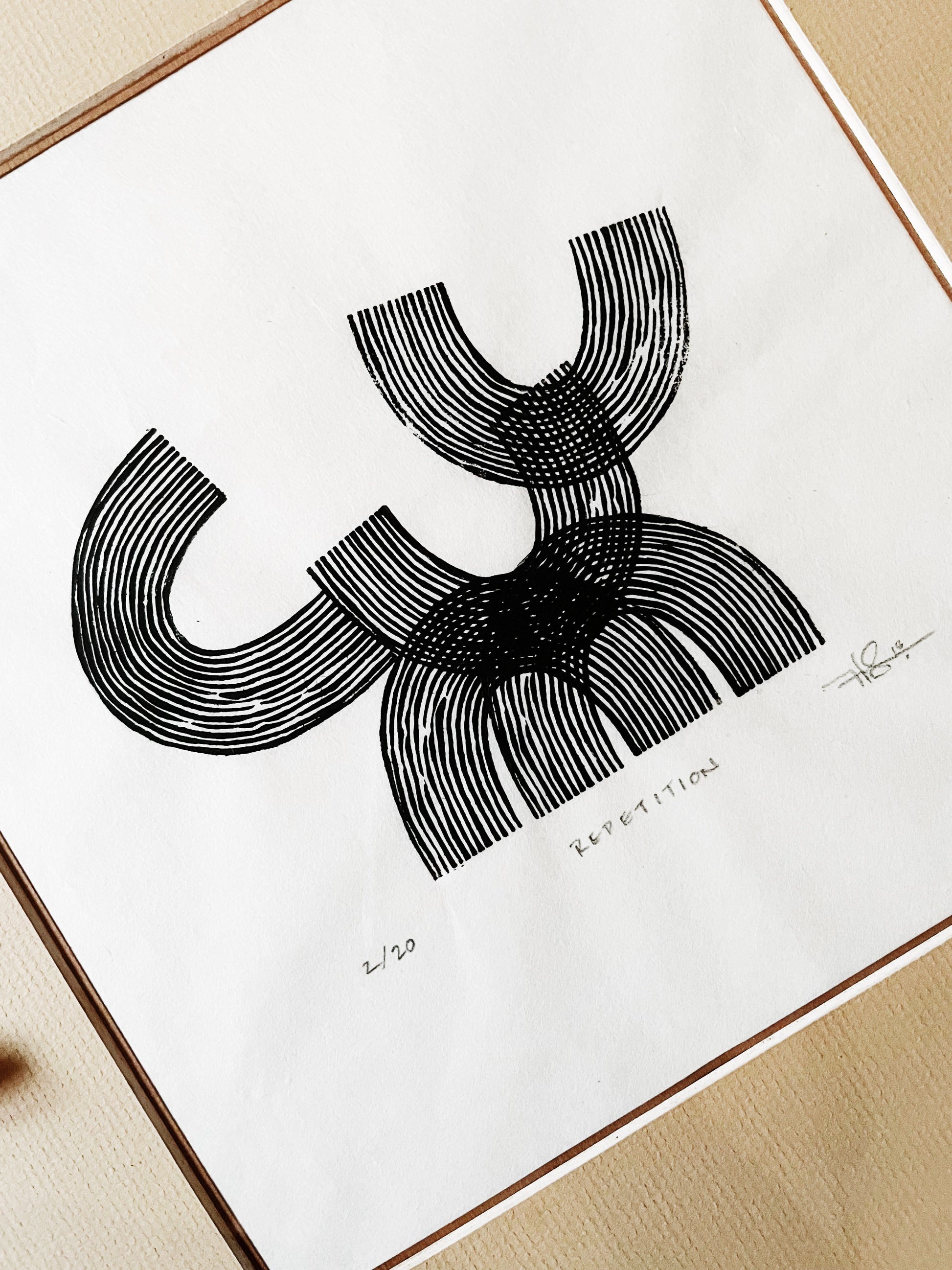 Graphic block print in black India ink on delicate handmade rice paper. Titled ‘Repetition’. Strong lines. Signed dated and numbered. Framed in a rose gold metal museum mount under glass