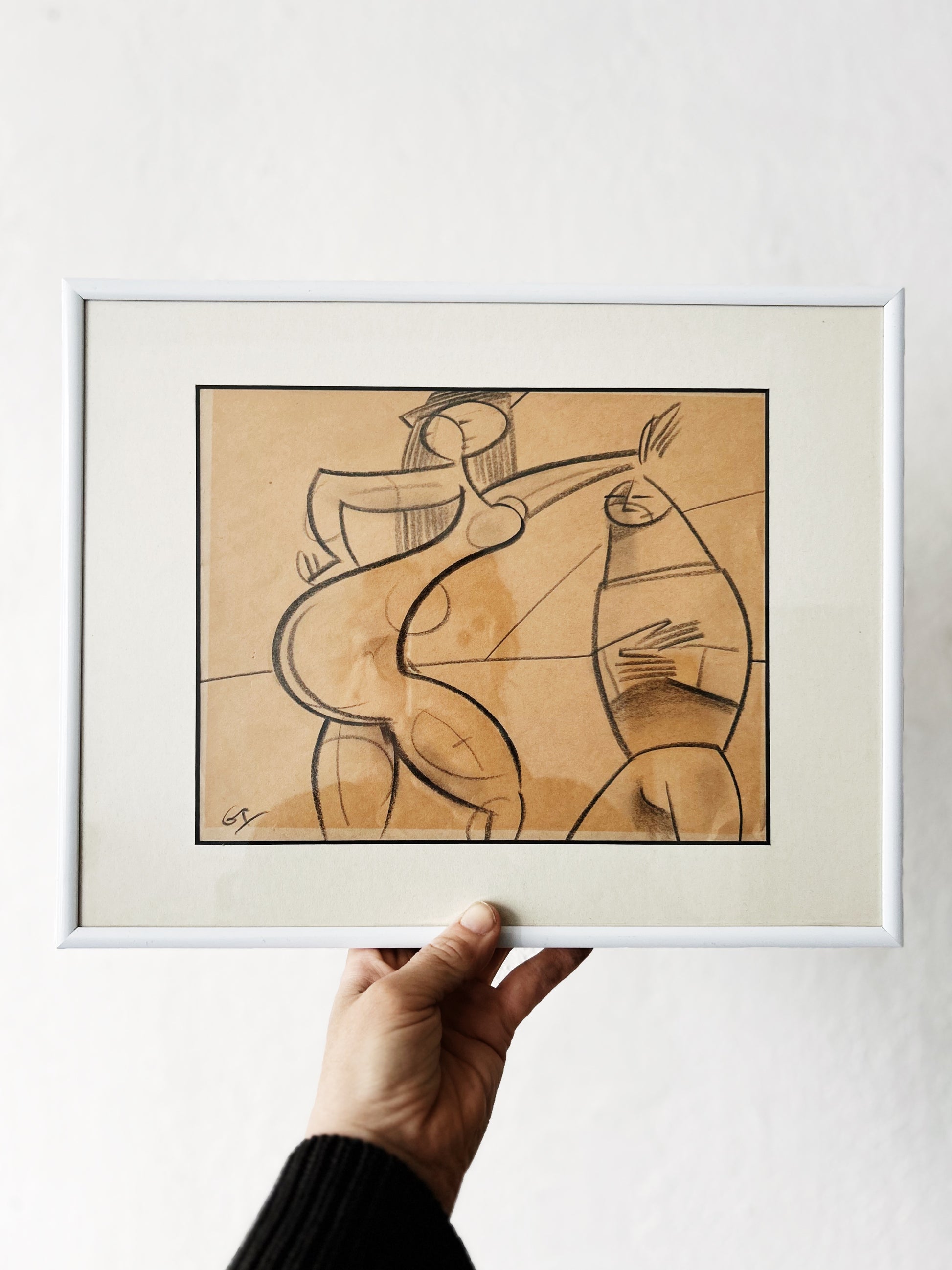 A very Picasso esque expressionist drawing in charcoal on aged paper. Signed GP and presented under glass in a simple metal frame