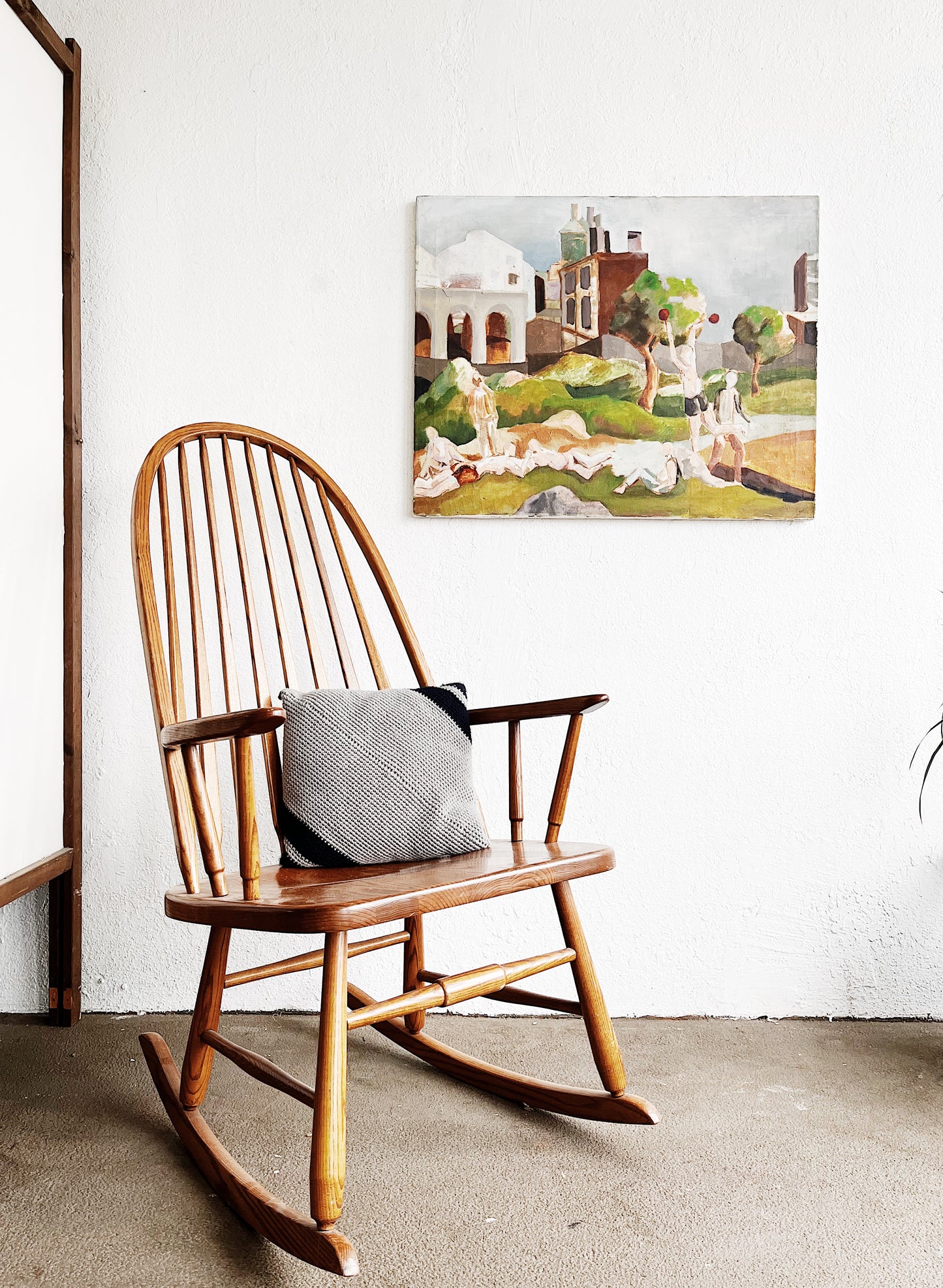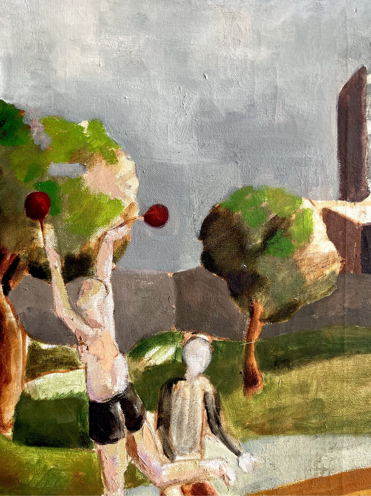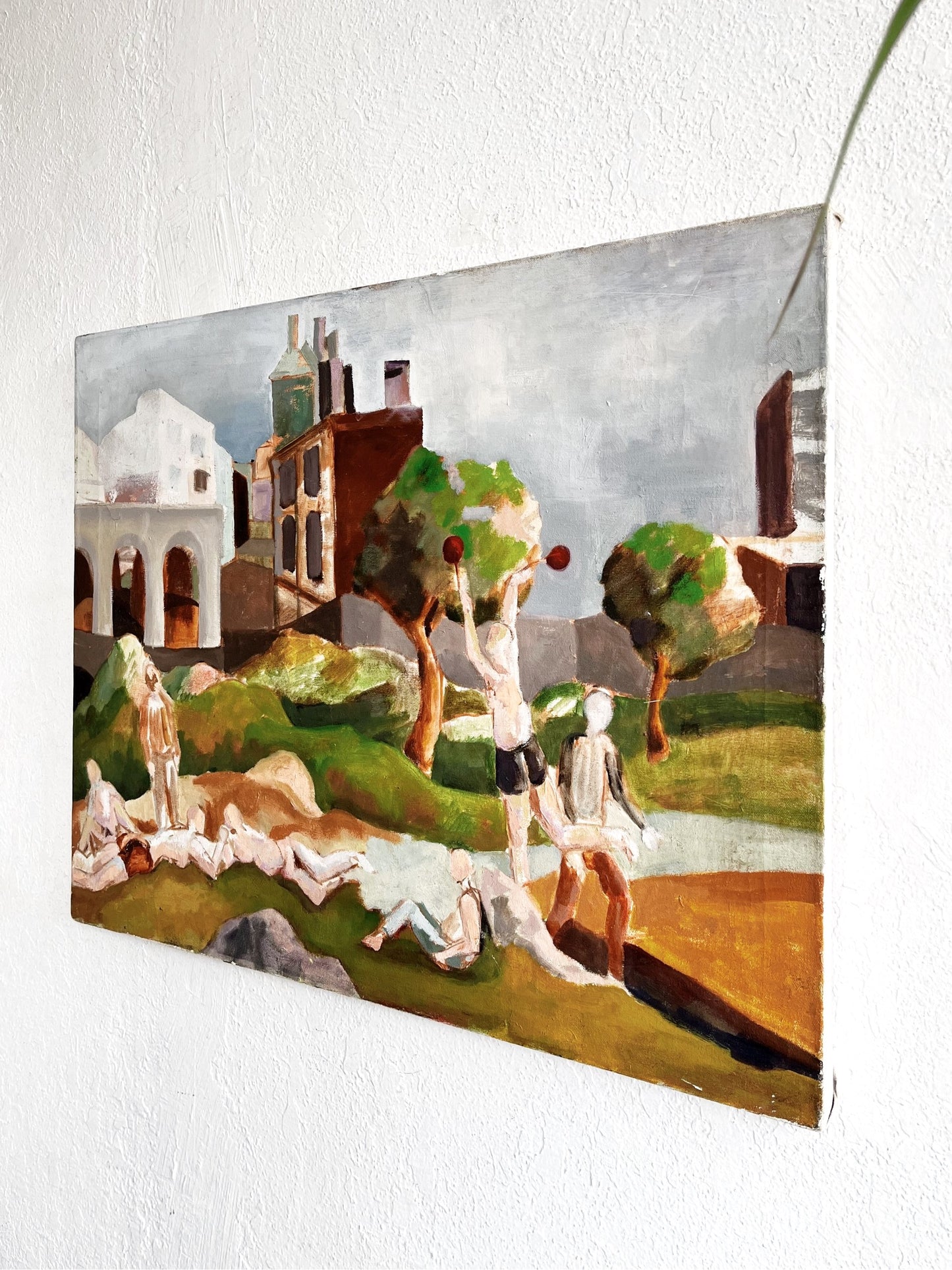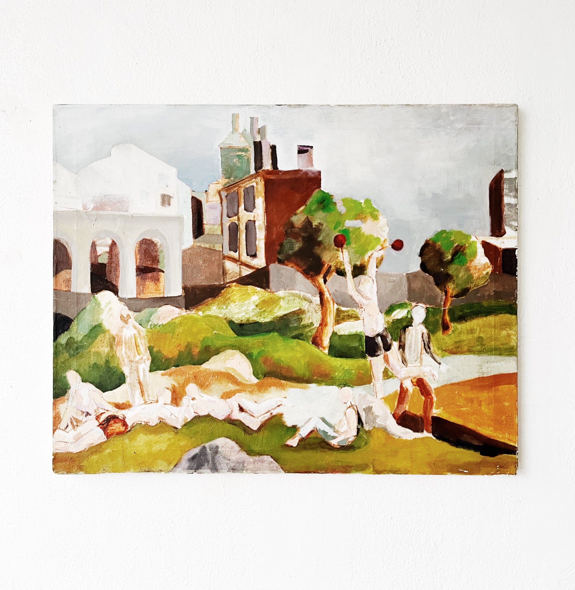 Whimsical and fun painting in the cubist style. Exceptional colors are chalky and beautiful. This reminds me of vacationing and playing in San Francisco’s Delores Park. Oil on stretched canvas box