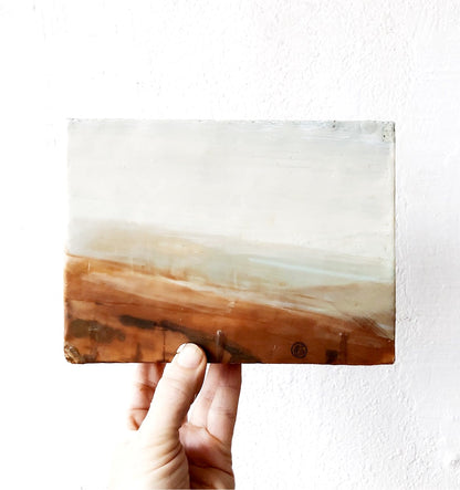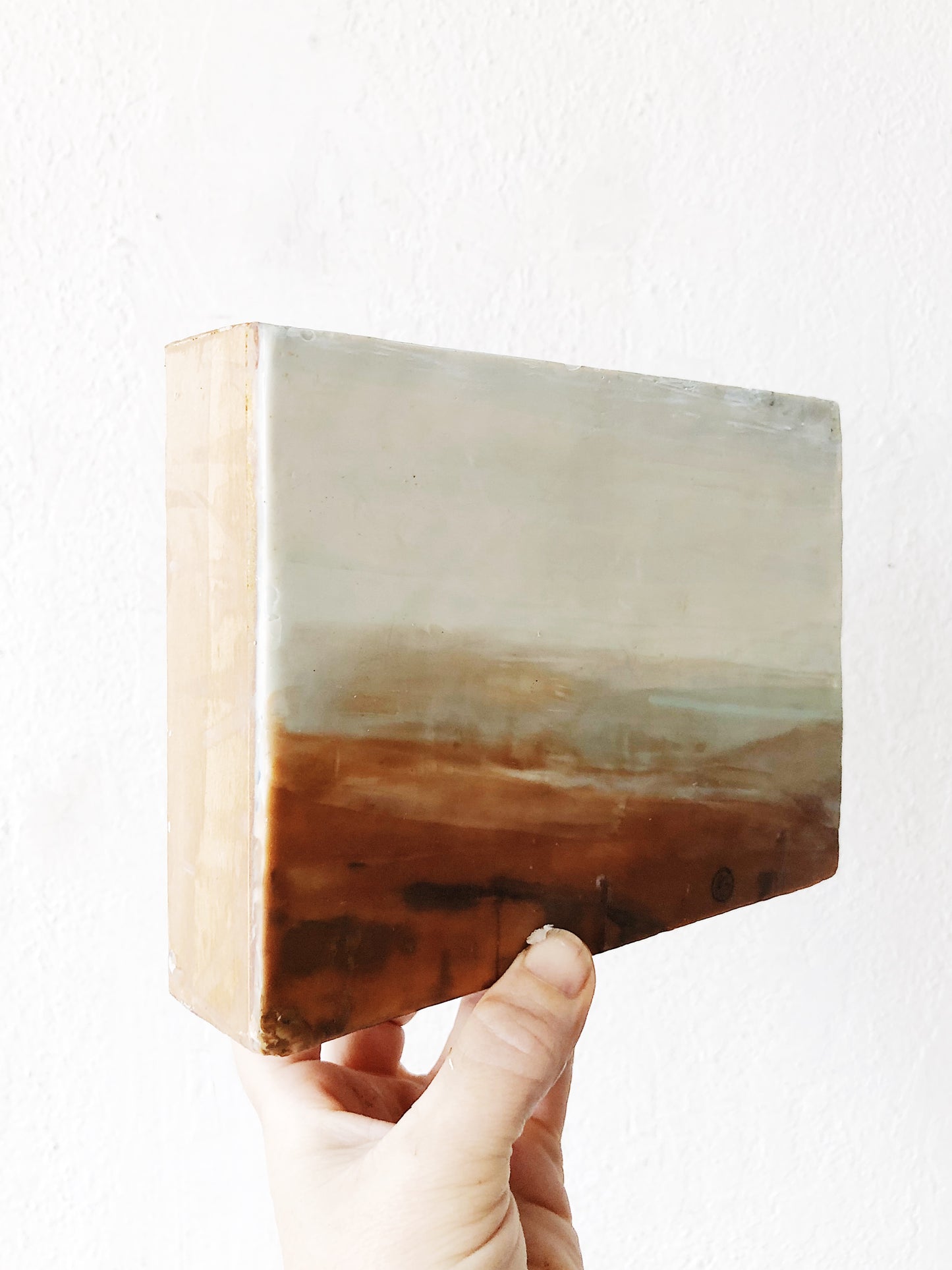 Serene landscape done in the encaustic style. On box wood frame. Signed by the artist Patti Bowman