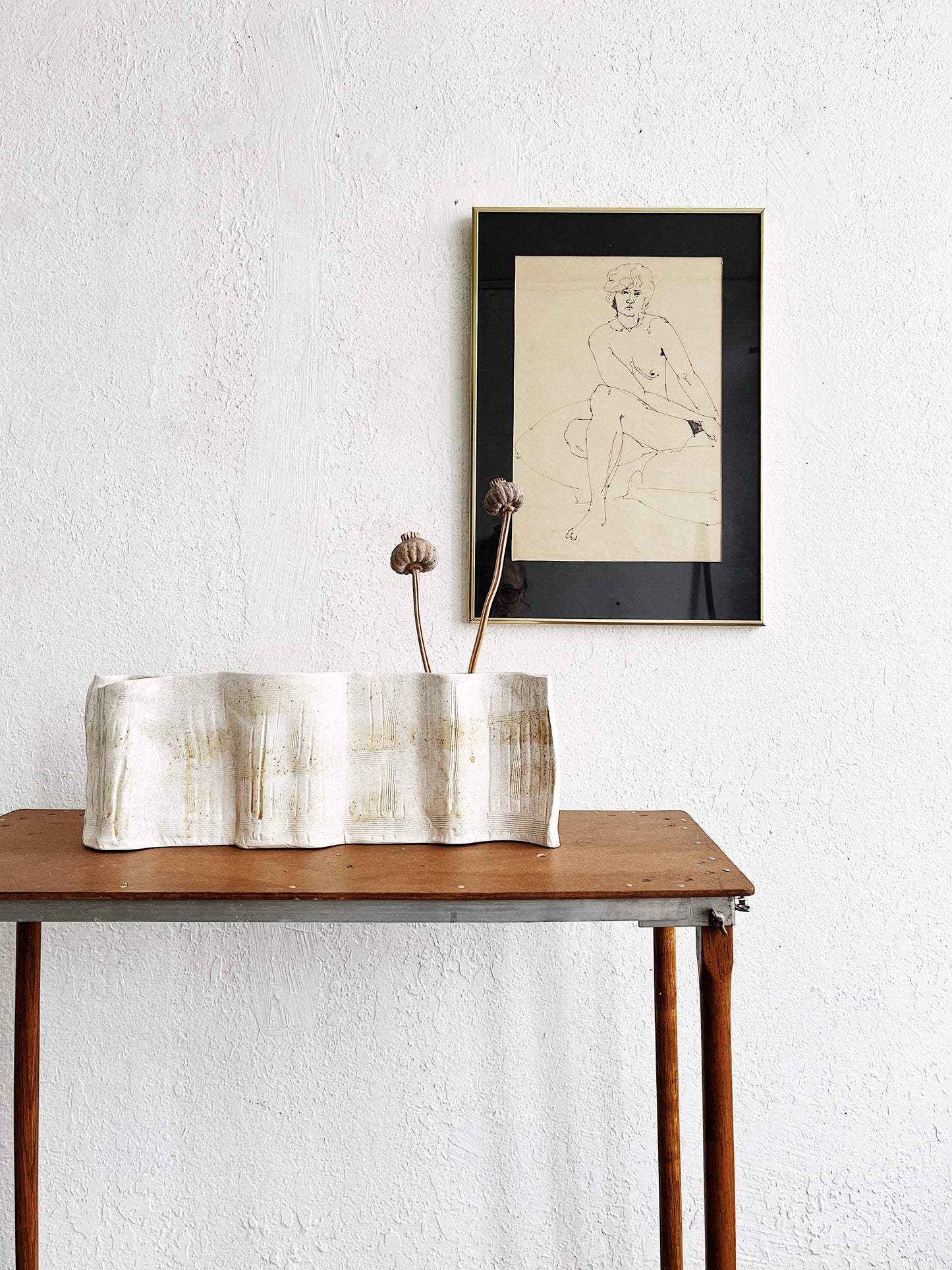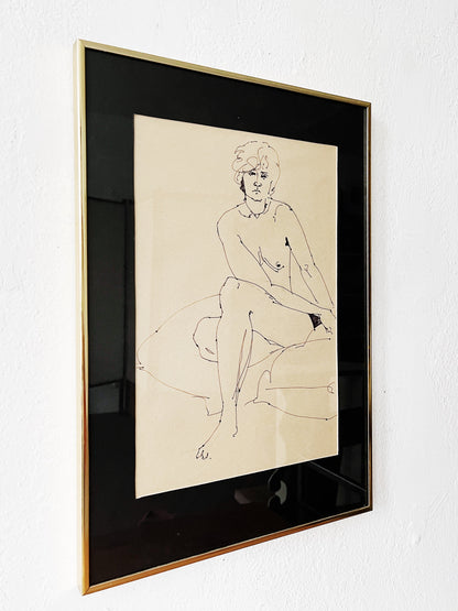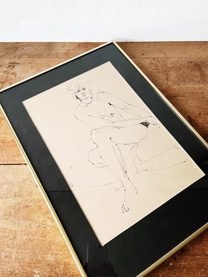 Original figural line drawing. How hard it must be to garner emotion from a simple charcoal pencil! On art paper on a museum mount, framed under glass