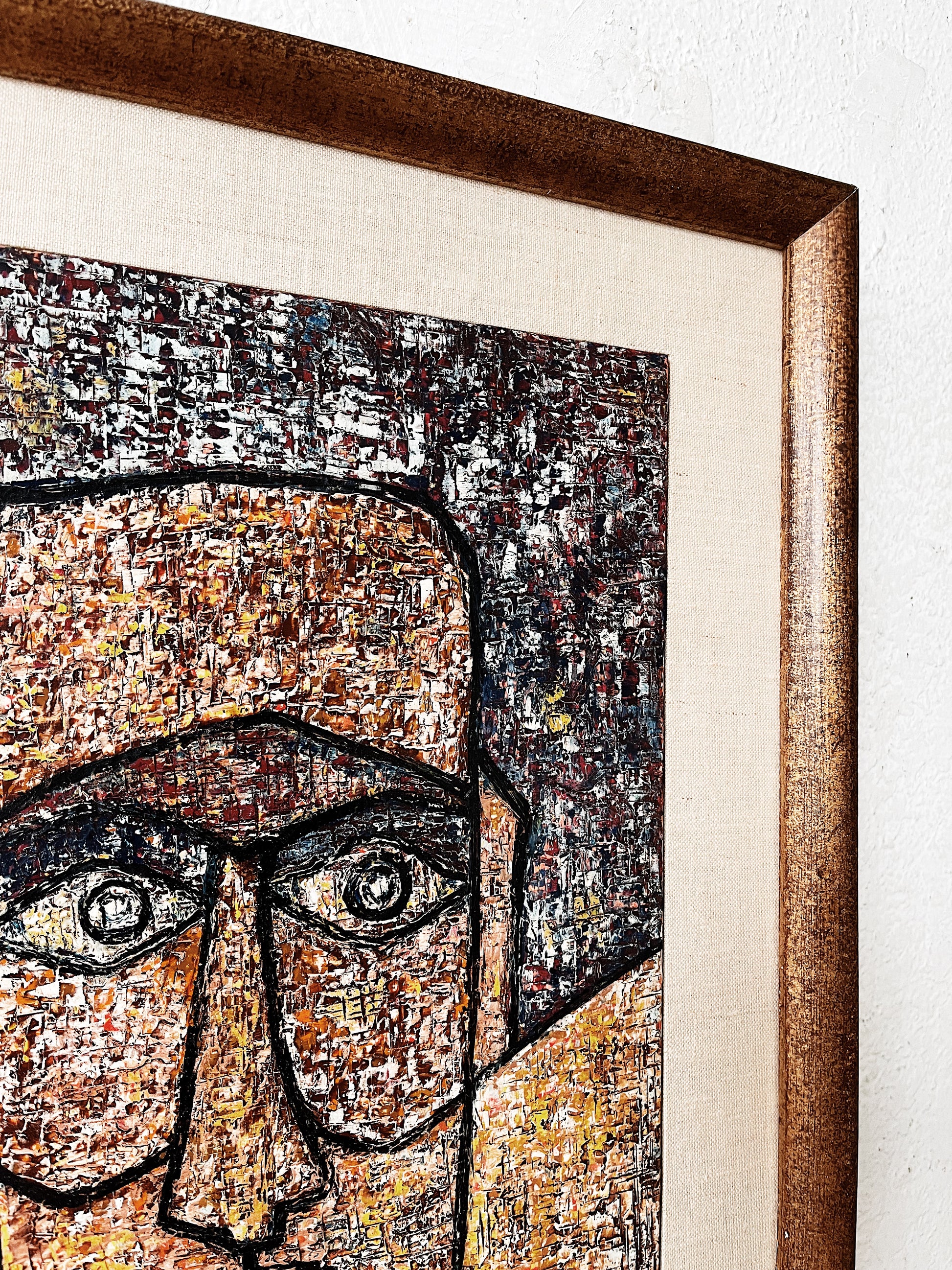 Original figural painting by Oregon artist Richard Mulder. Unique mosaic style technique with a slight texture, oil on board. Framed in thick wood and painting is recessed a linen mat. Signed by artist Malda