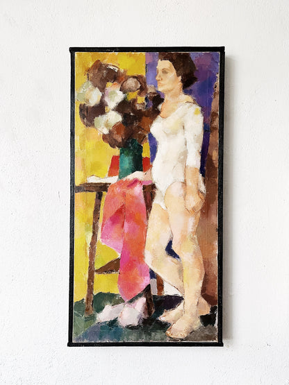 Large original oil painting on linen canvas. Colors are bright yet grounded. Cubist flowers and pink drape, we especially love that the figure is wearing a bodysuit, because well, it’s awesome. Framed in thick black wood. Signed Vincent on reverse