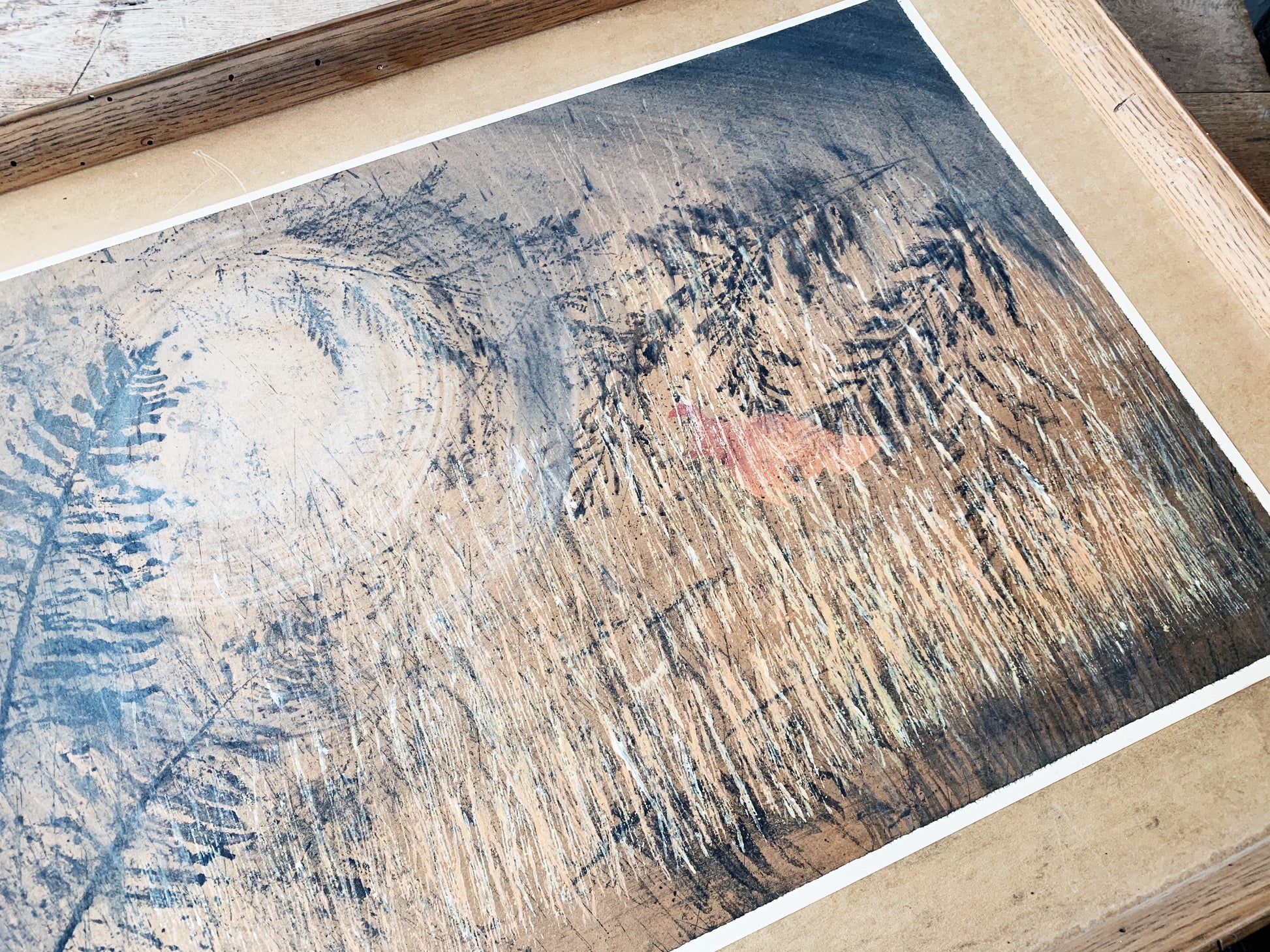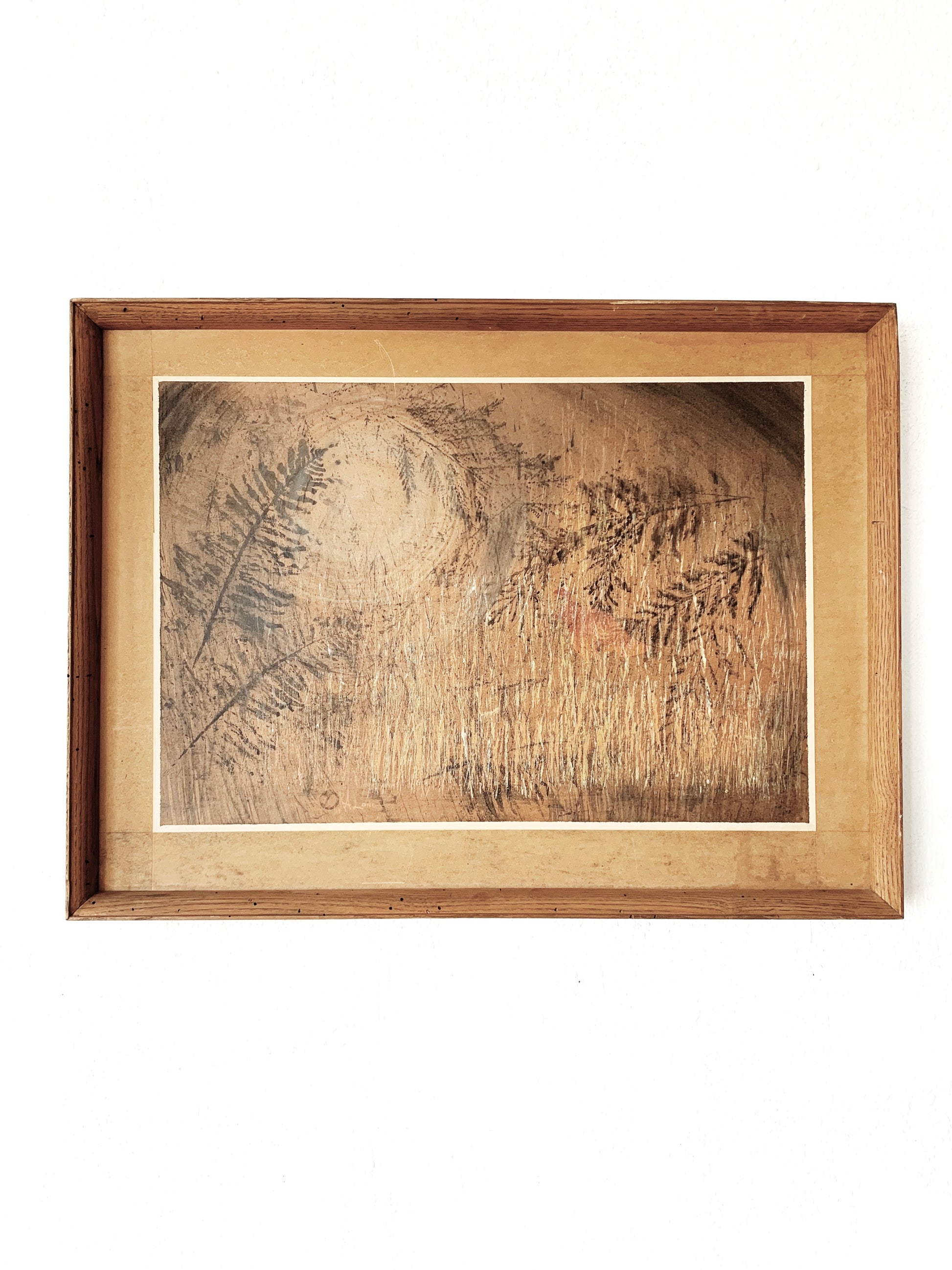 nicely framed in brutal unfinished wood. Wire hanger on back