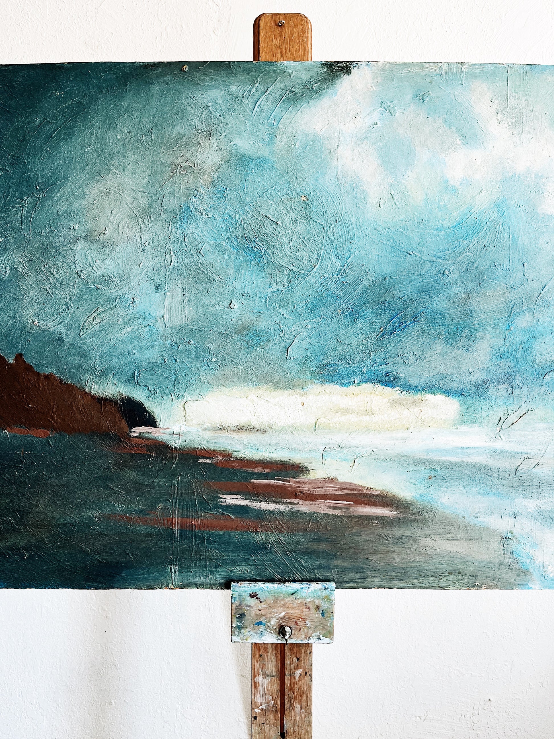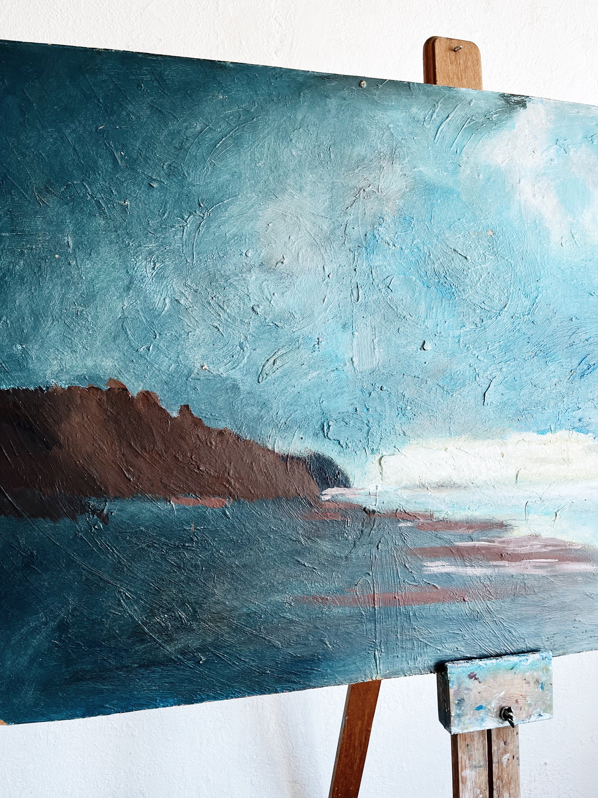 Stunning moody seascape by Oregon artist Jack Schrader (1935-2018). The blues are just so good in this one. Fantastic brushwork and deep grounding browns. A statement piece that brings a sense of calm to a room. Oil on heavy board