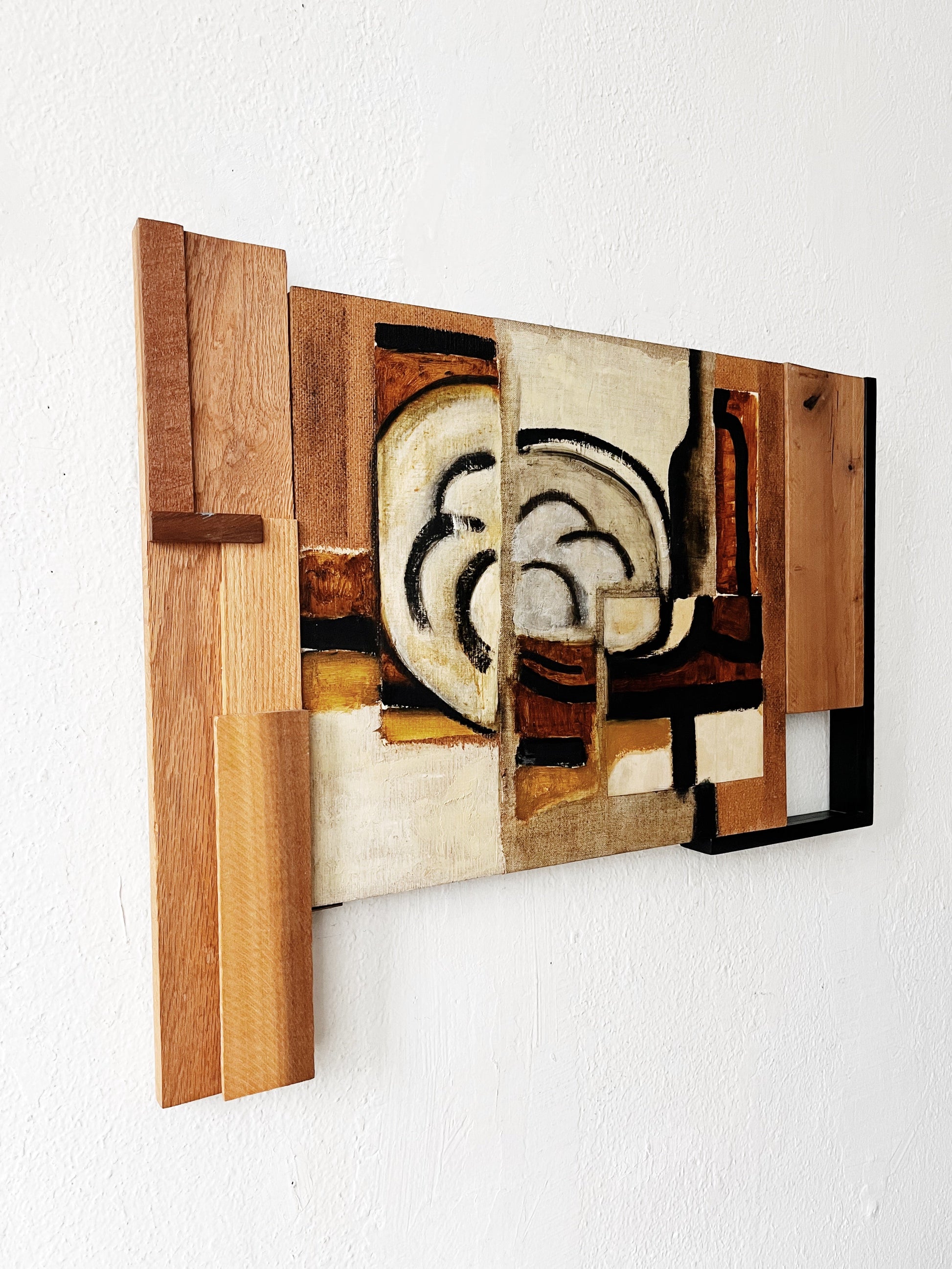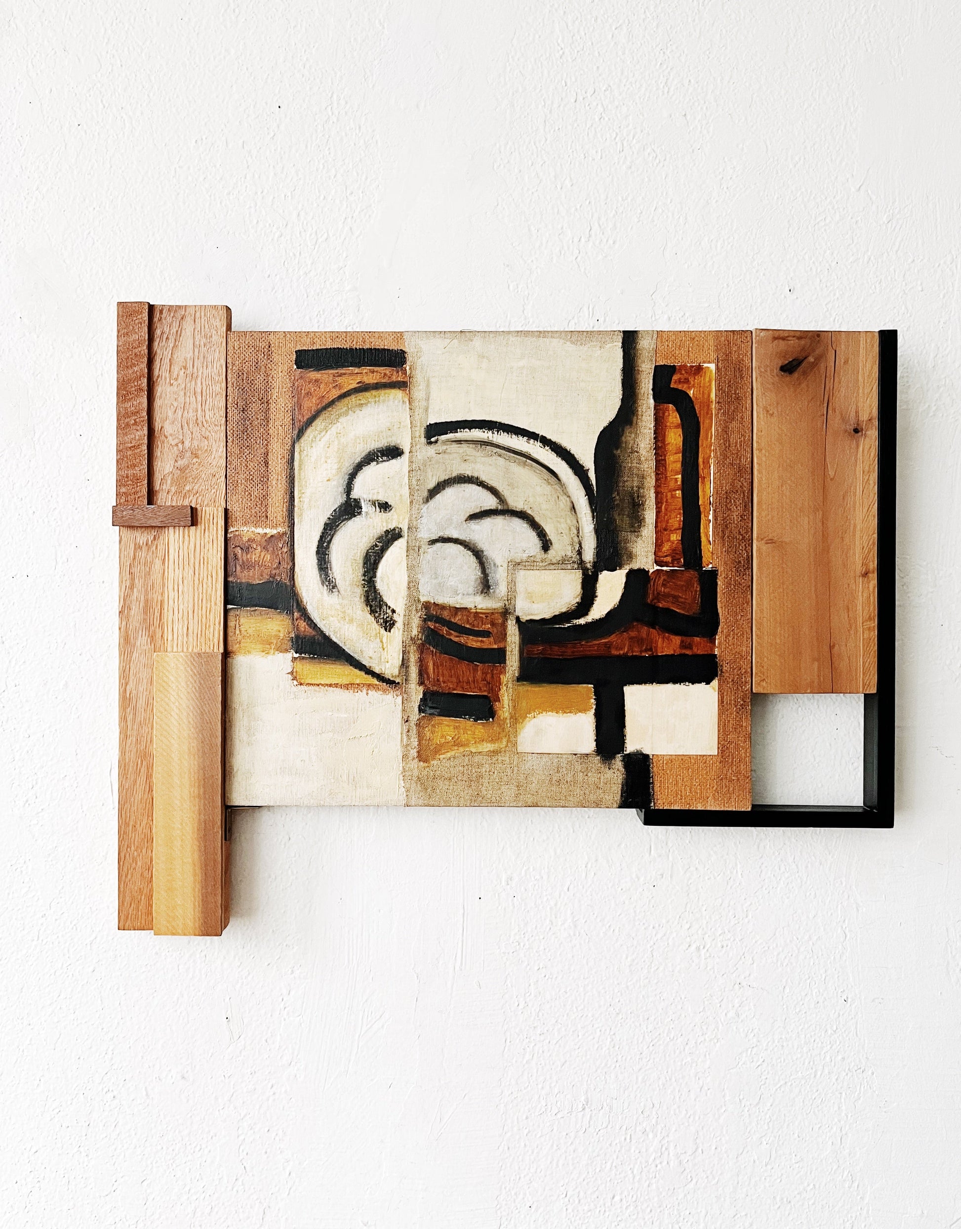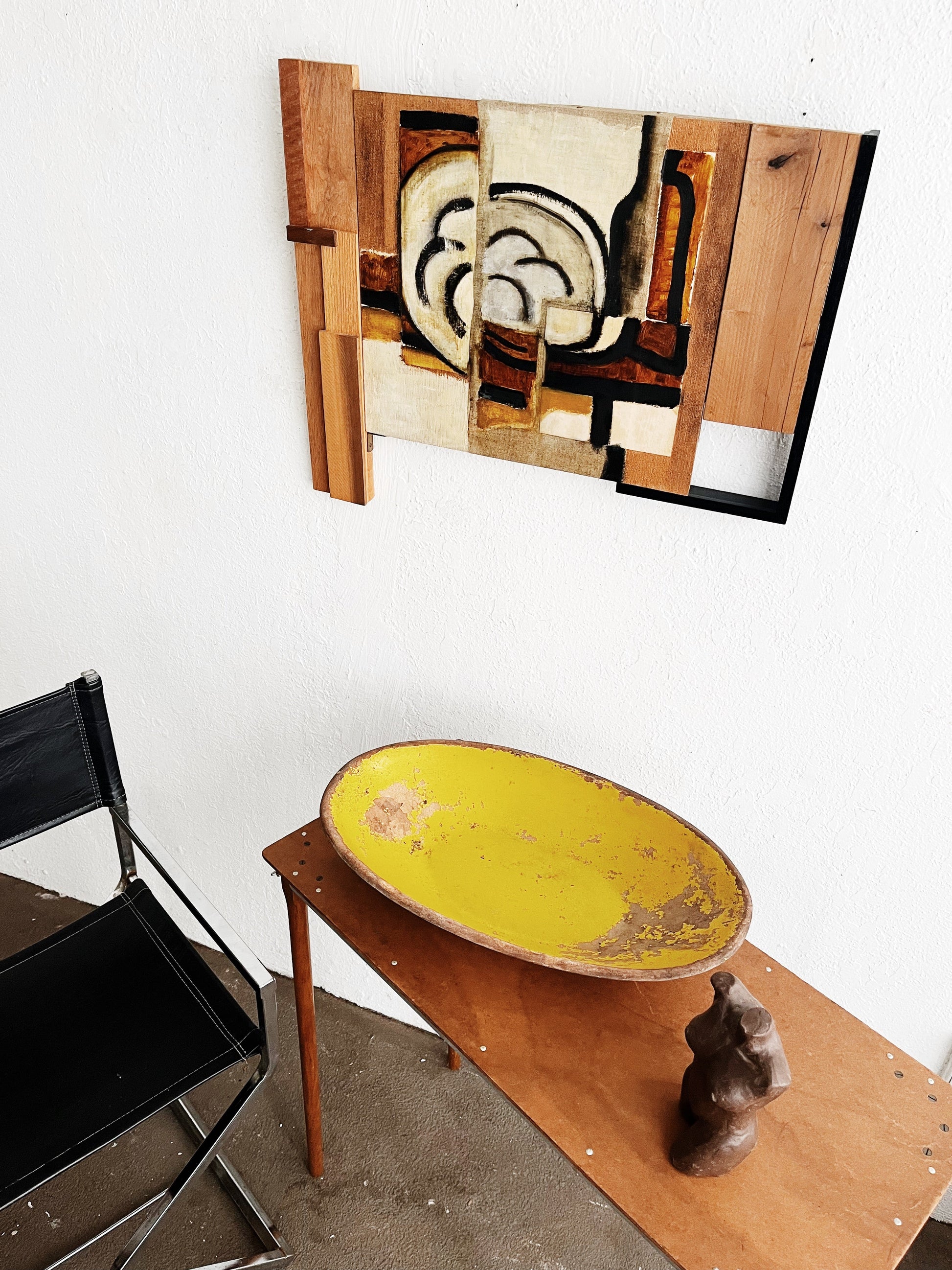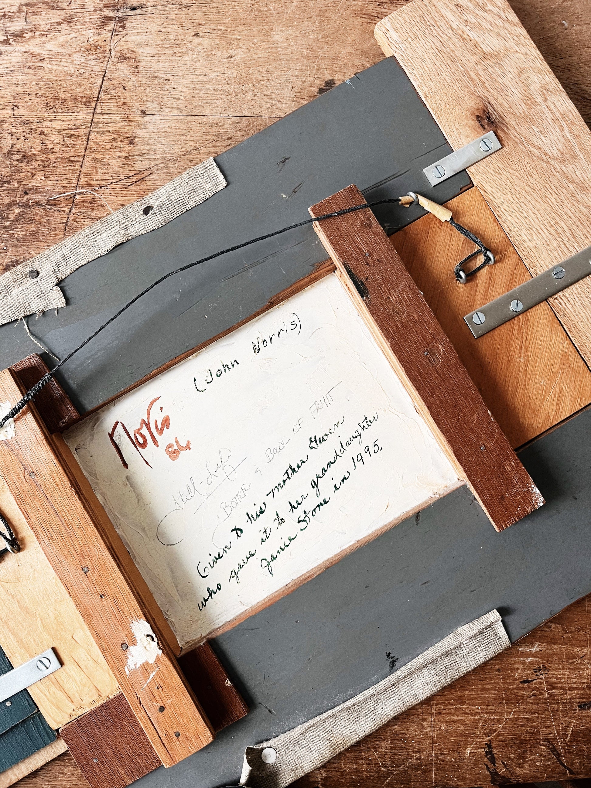 Fab mixed media piece by John Norris. Still life titled ‘bottle with fruit bowl’. Wonderful use of paint on linen with interposed pieces of painted canvas. One of the most unique wood frames we’ve seen. Dated and signed with an inscription on back. A special piece