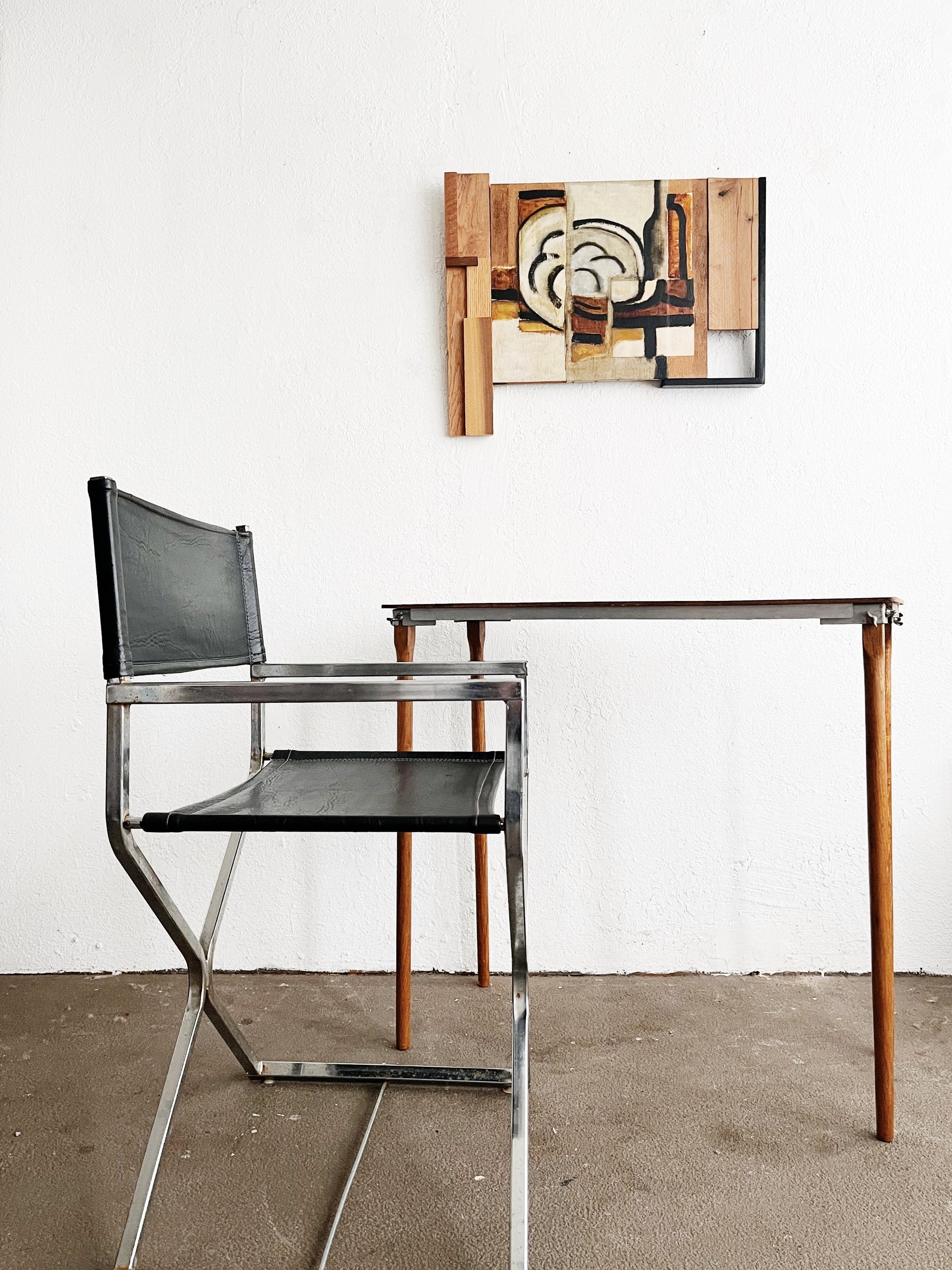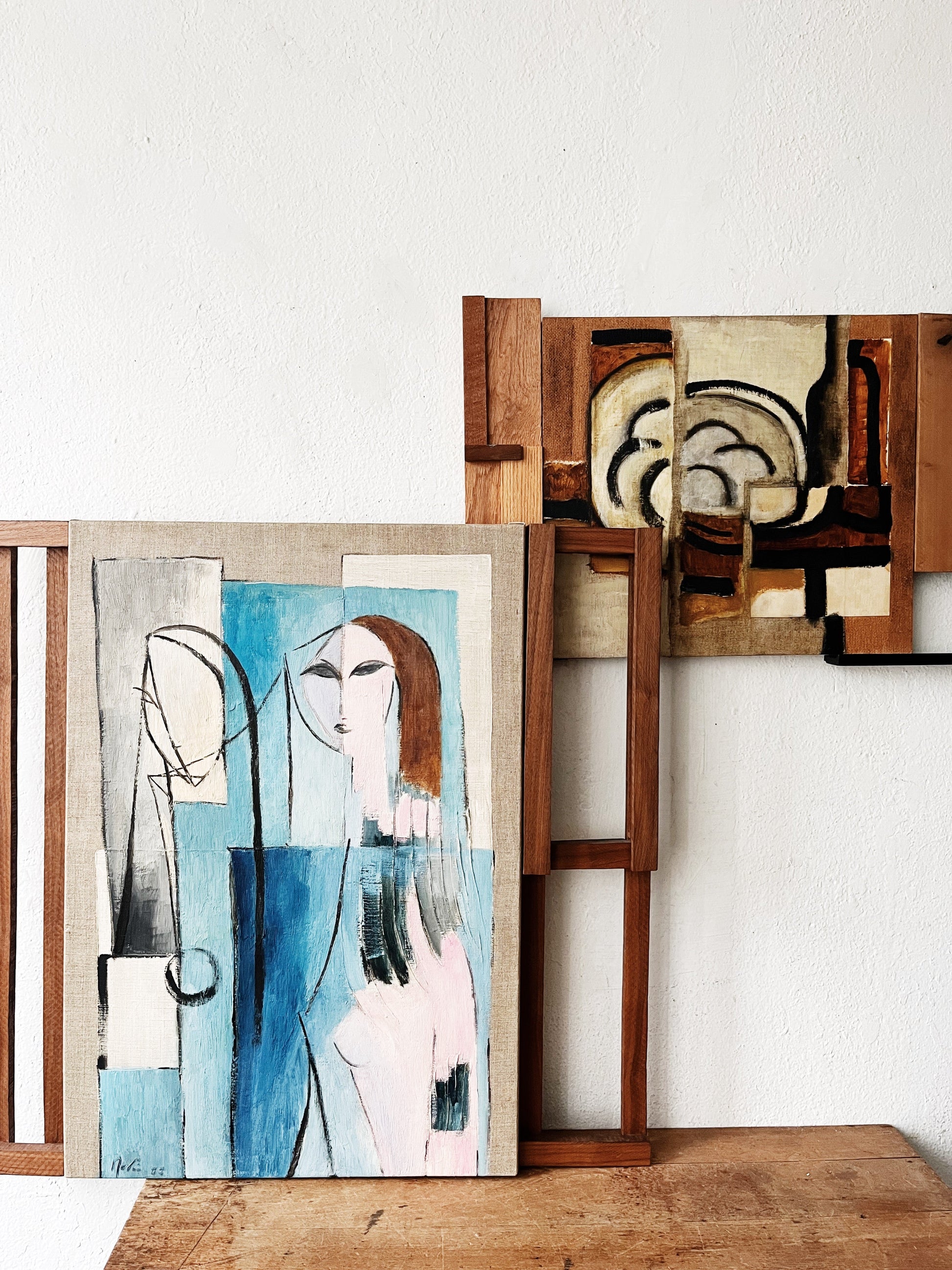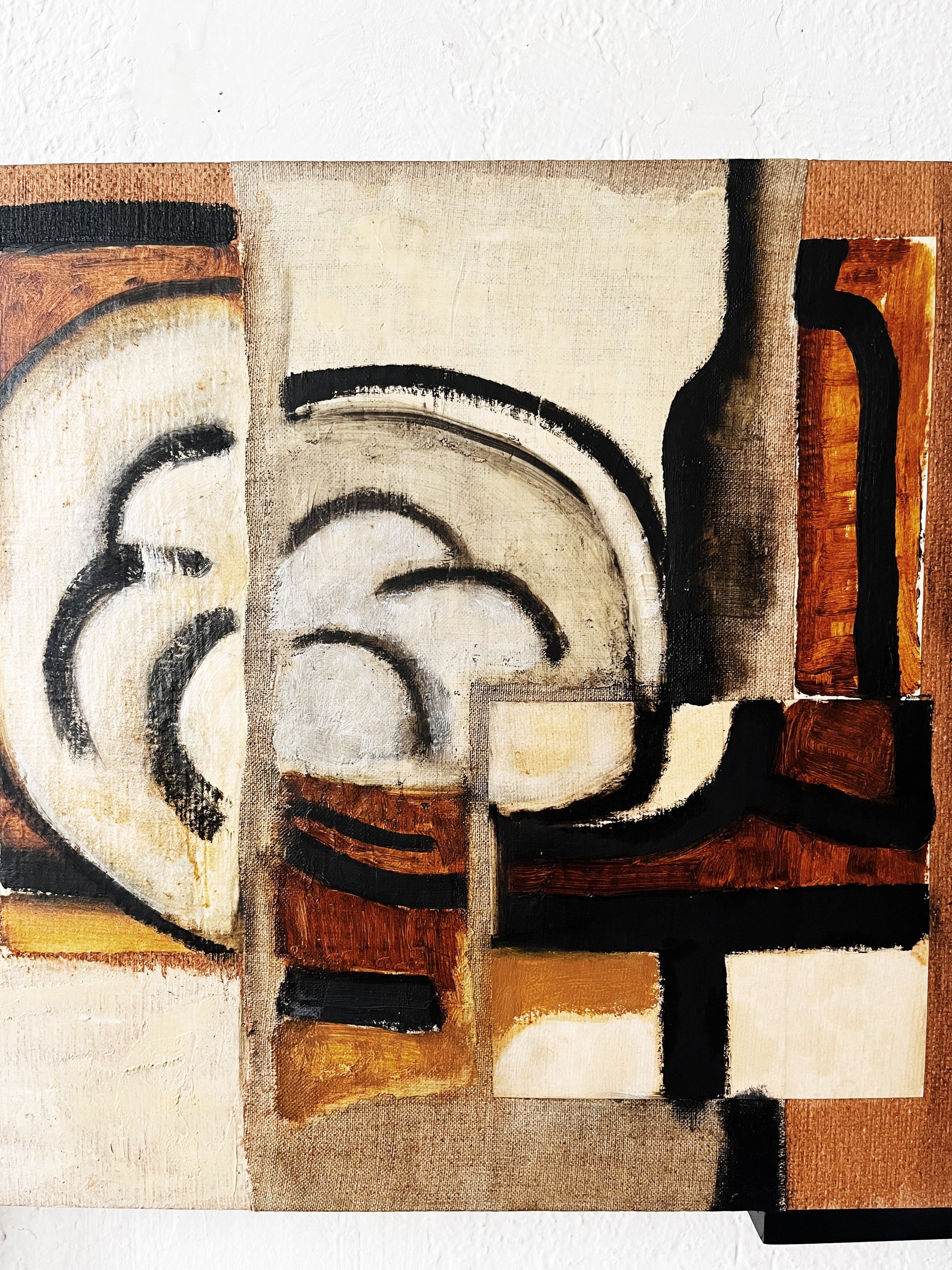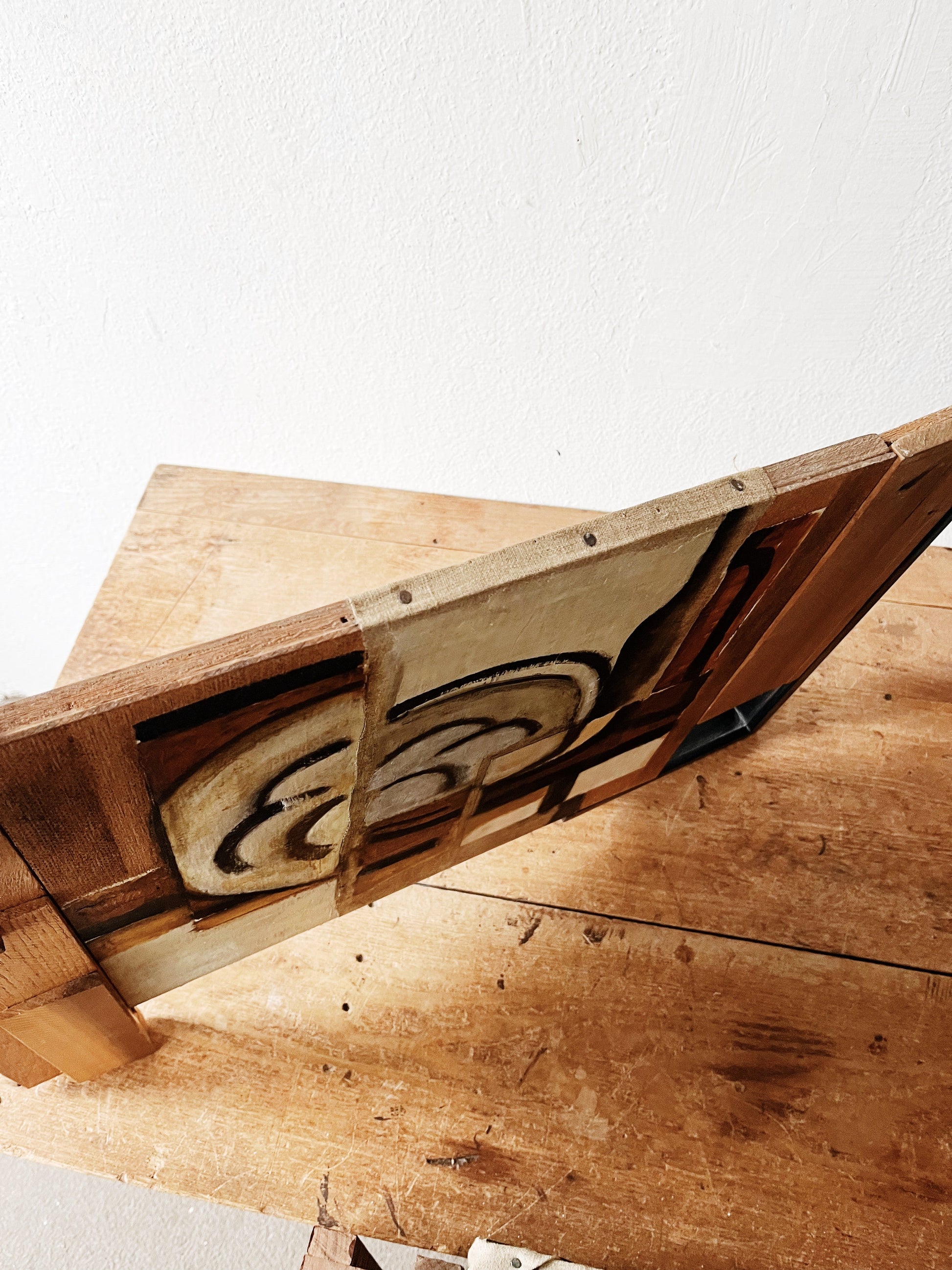Fab mixed media piece by John Norris. Still life titled ‘bottle with fruit bowl’. Wonderful use of paint on linen with interposed pieces of painted canvas. One of the most unique wood frames we’ve seen. Dated and signed with an inscription on back. A special piece
