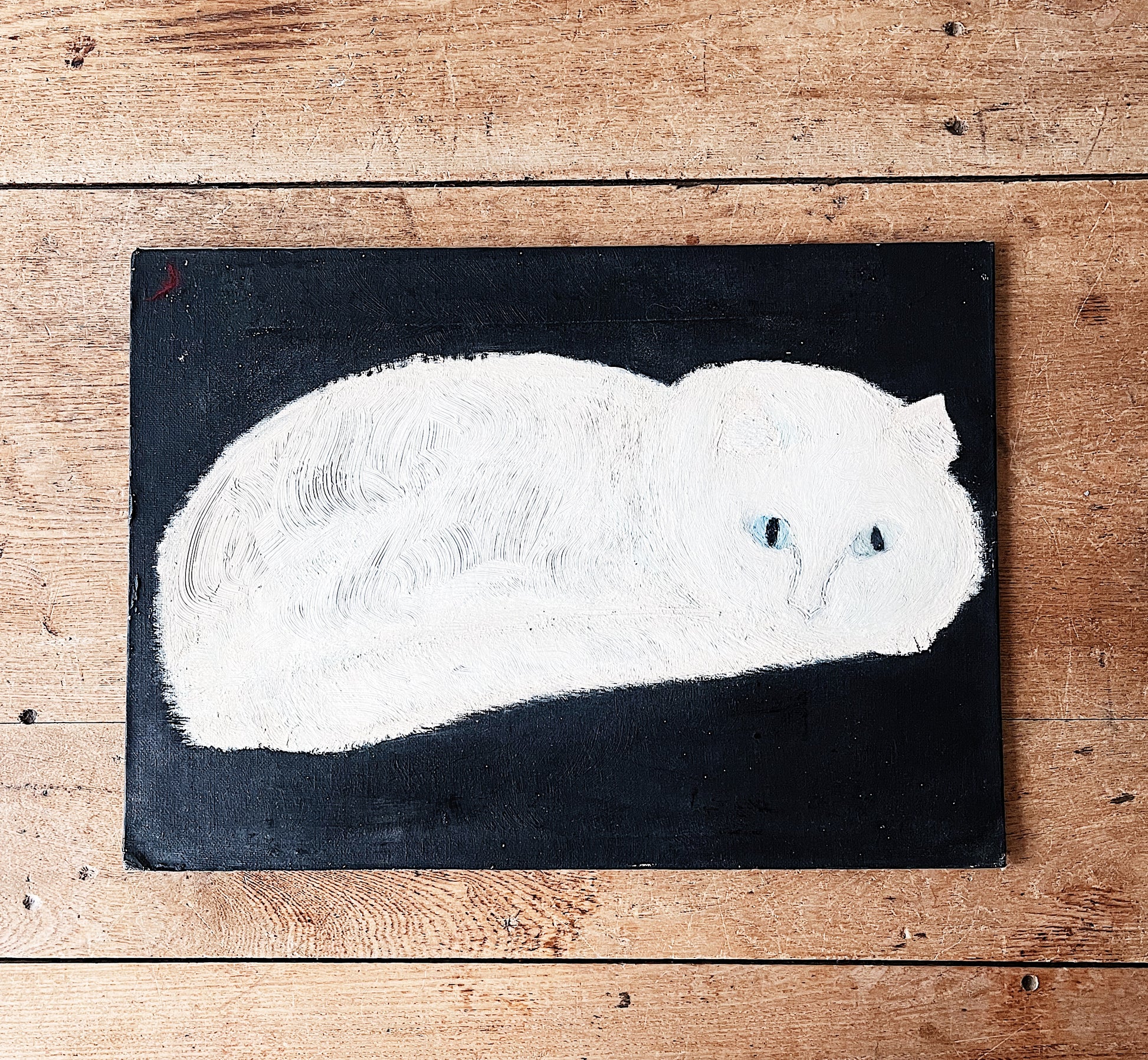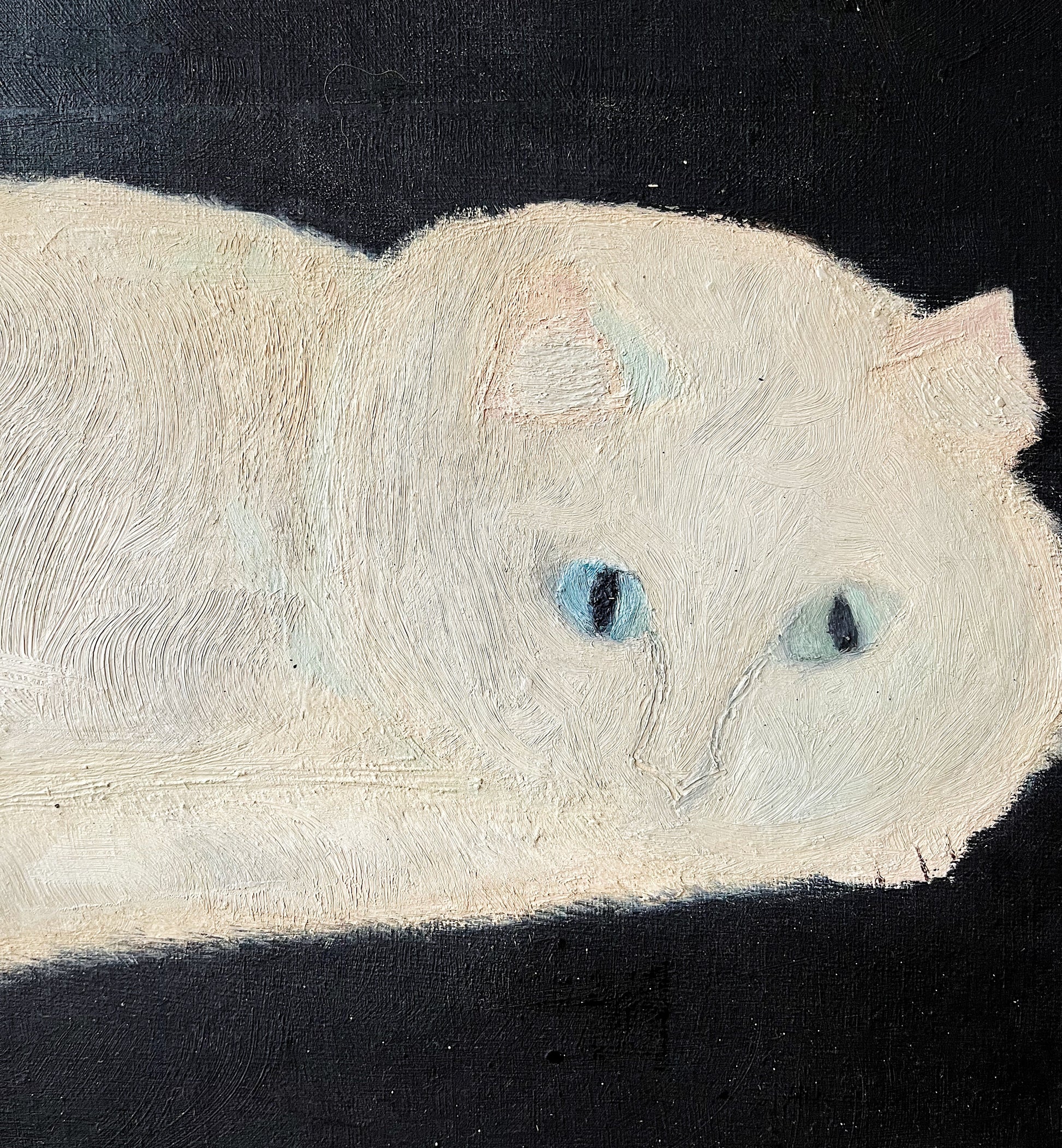 Really sweetly painted fluffy white kitten with pale blue eyes. There is a lot of nice color detail that the camera can’t quite pick up. Please see the final photo for the best color representation.