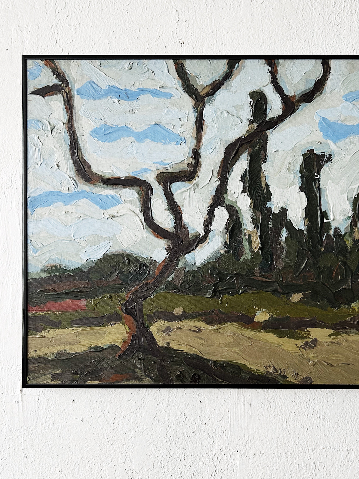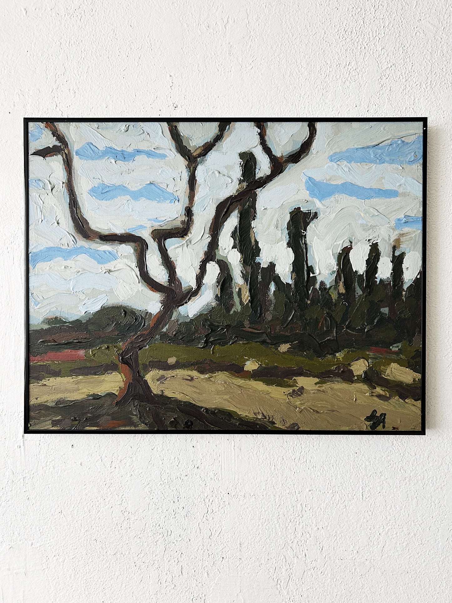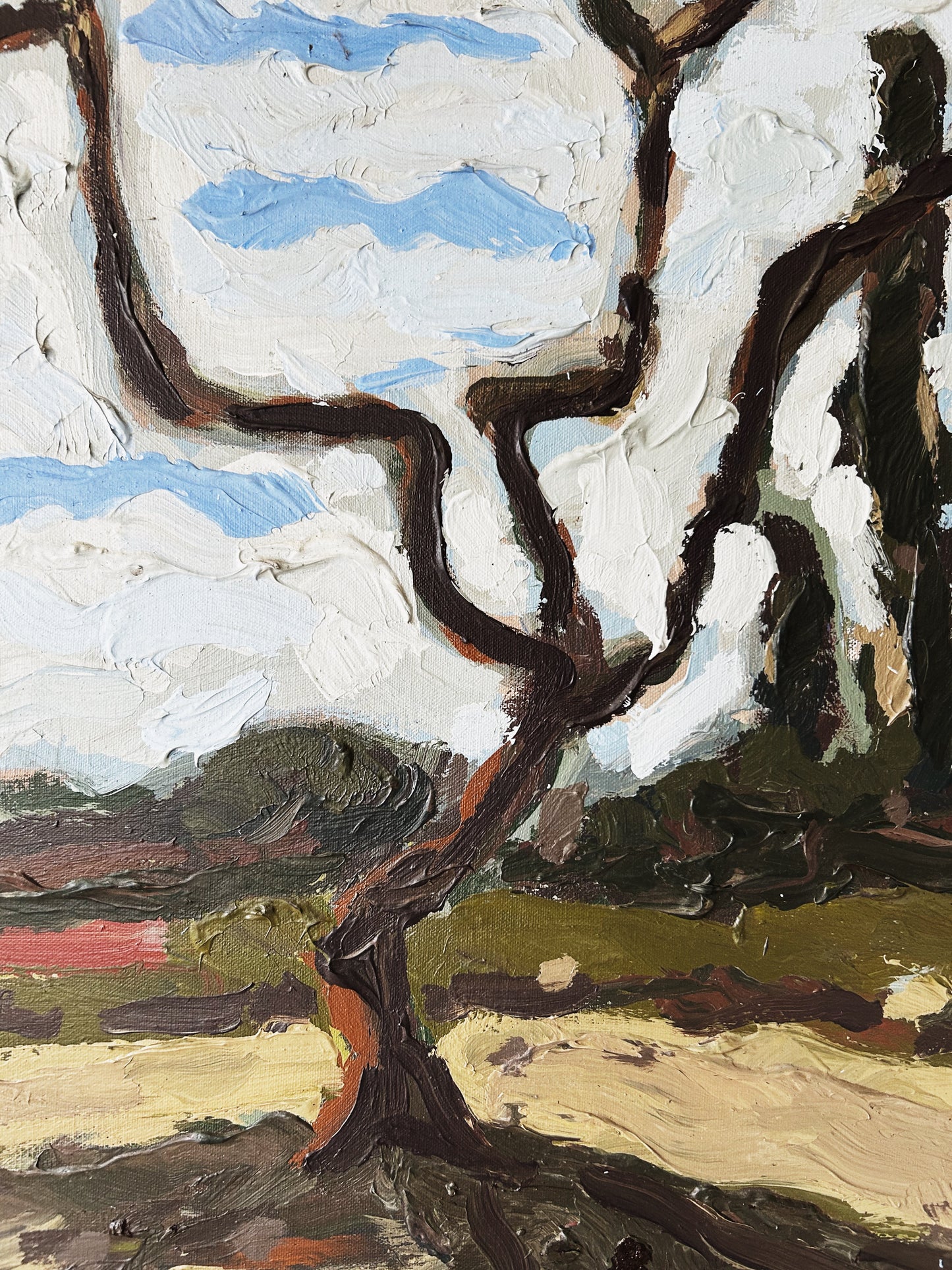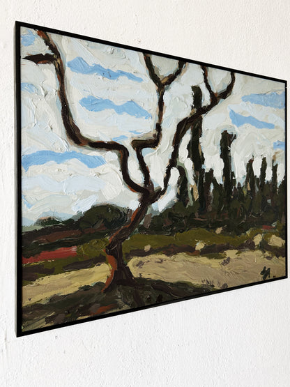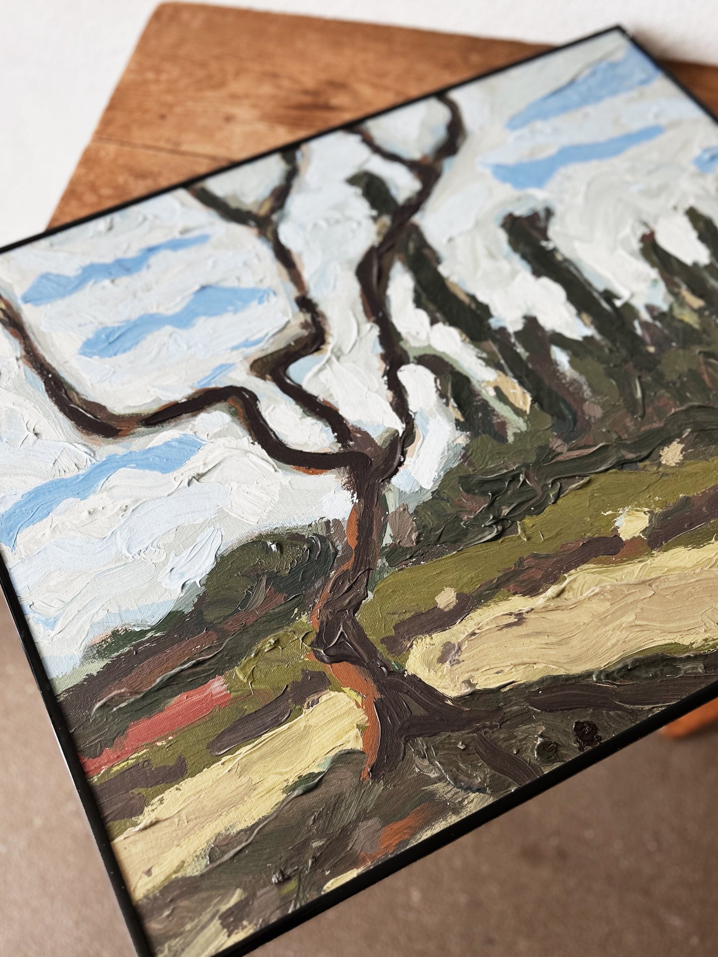 Wonderful naive style landscape painting. Thick oil paint impasto on linen canvas. Framed