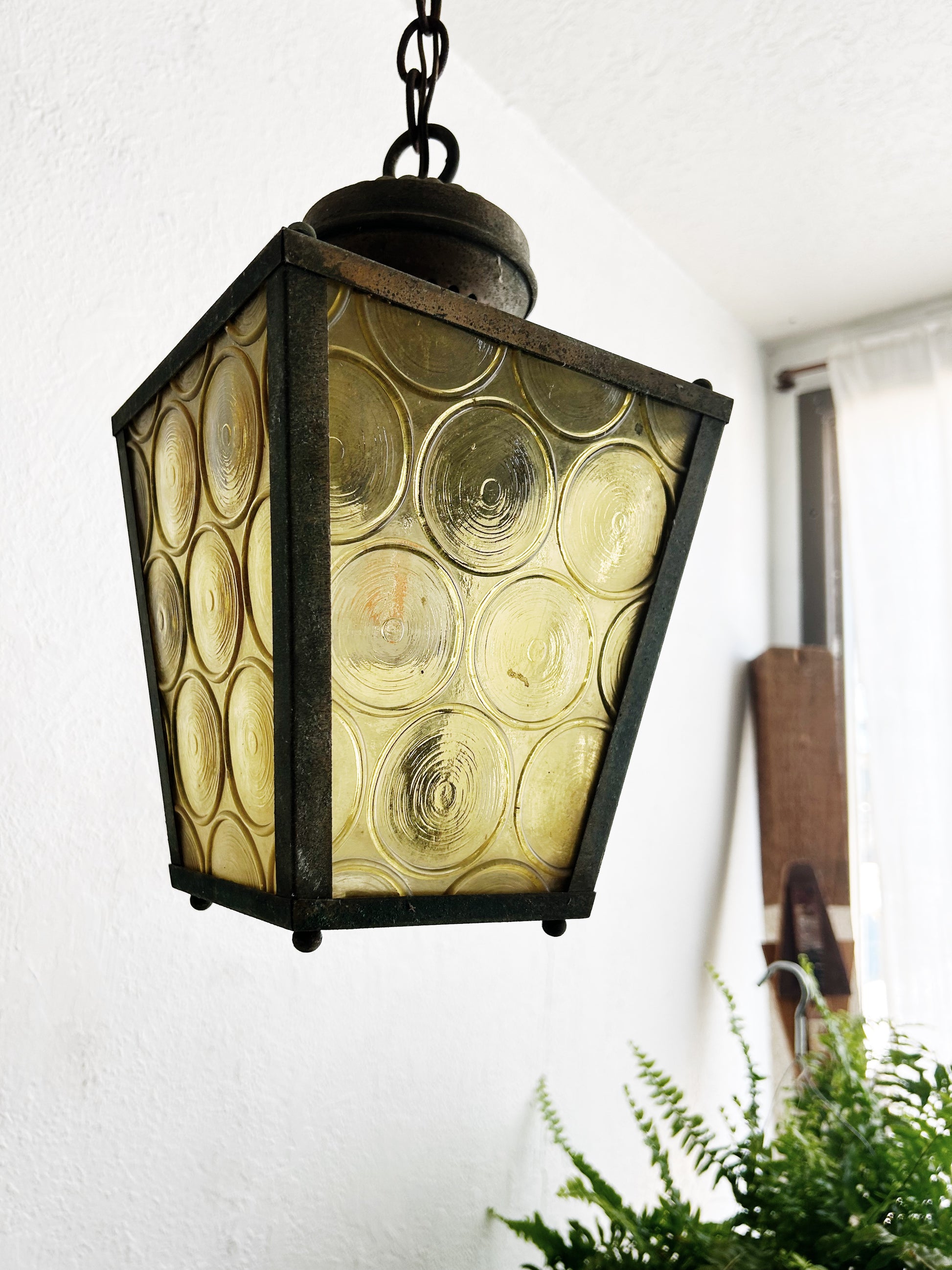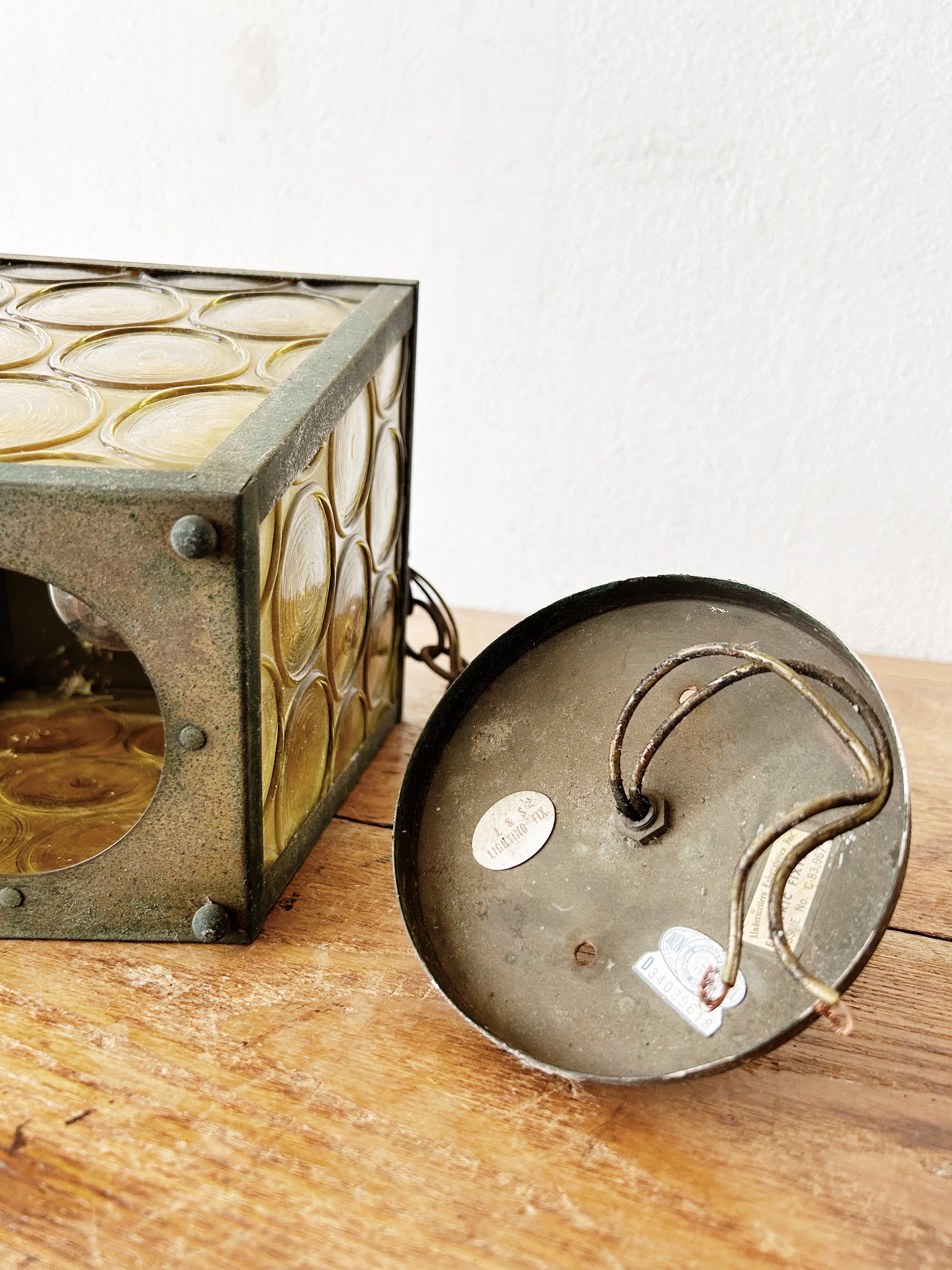 Mid century metal encased golden glass hanging porch light. All original. No cracks in the glass! Hard wired, untested but was told it works. Original mounting plate and screws included.